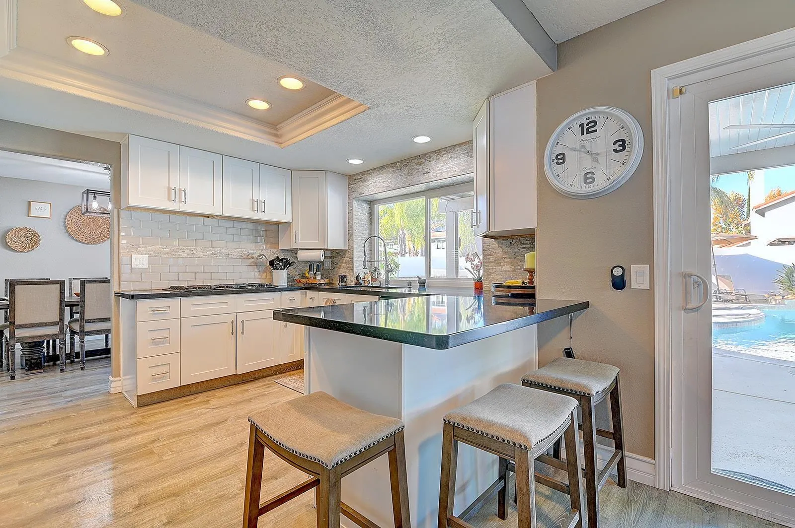 Welcome to 45774 Hopactong Street — resort-caliber living meets refined executive taste in South Temecula. This is not a house. This is a lifestyle upgrade. From the moment you arrive, this home commands attention. Craftsman facade, manicured landscaping, private front courtyard, & a 3-car garage set against a breathtaking mountain backdrop. Inside, soaring 2-story ceilings, dramatic skylight, and a grand staircase w/custom banisters announce that no detail was overlooked. Luxury vinyl plank flooring flows throughout both levels. The remodeled chef’s kitchen delivers: white shaker cabinetry, granite countertops, gas cooktop, subway tile and stacked stone backsplash, tray ceiling, and a pool-view window. A wet bar connects to the family room — stone fireplace, updated lighting, direct backyard access — the entertainer’s triangle every executive buyer wants. Upstairs, the primary suite is your sanctuary: vaulted ceilings, plantation shutters, private balcony, & a spa-inspired en-suite with travertine soaking tub, glass-enclosed shower, and dual vanities. 3 additional bedrooms flex for family, guests, or a dedicated home office. Outside, the backyard closes the deal. New wraparound alumawood patio cover with fans & lighting perfect for alfresco. Watch the fireworks from the sparkling pool & spa or fire pit lounge. Space for a Sport Court & extended entertaining. New vinyl fencing. One of the largest lots in the neighborhood. Many seller upgrades — move-in perfect. Cul-de-sac. Great Oak High School. Walk to Pechanga, wine country, golf, and near I-15. Low HOA. By Appt only.