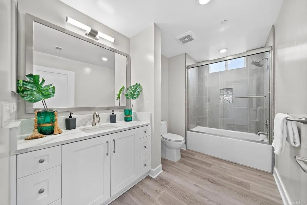 Built in 2024, this stunning end-unit, top-floor condo combines modern coastal design with panoramic ocean and sunset views in one of Oceansides most desirable west-of-Coast-Highway locations. The open-concept floor plan offers seamless indoor-outdoor living with large dual-pane windows that fill the space with natural light and showcase unobstructed views of the Pacific and swaying palms. The living area flows to a private balconyperfect for morning coffee or evening sunsets. The contemporary kitchen features quartz waterfall countertops, stainless steel appliances, custom cabinetry, pendant lighting, and an oversized island ideal for entertaining. The spacious primary suite includes designer finishes, large windows, and a spa-inspired bathroom, creating a calm and inviting retreat. Additional highlights include luxury vinyl plank flooring throughout, recessed lighting, central air conditioning, in-unit laundry, secure building access, and assigned parking. The newer construction ensures energy efficiency, sound insulation, and low maintenance. Located just minutes from Oceansides beaches, restaurants, coffee shops, and coastal trails, this property offers a rare combination of ocean-view living and urban convenience.