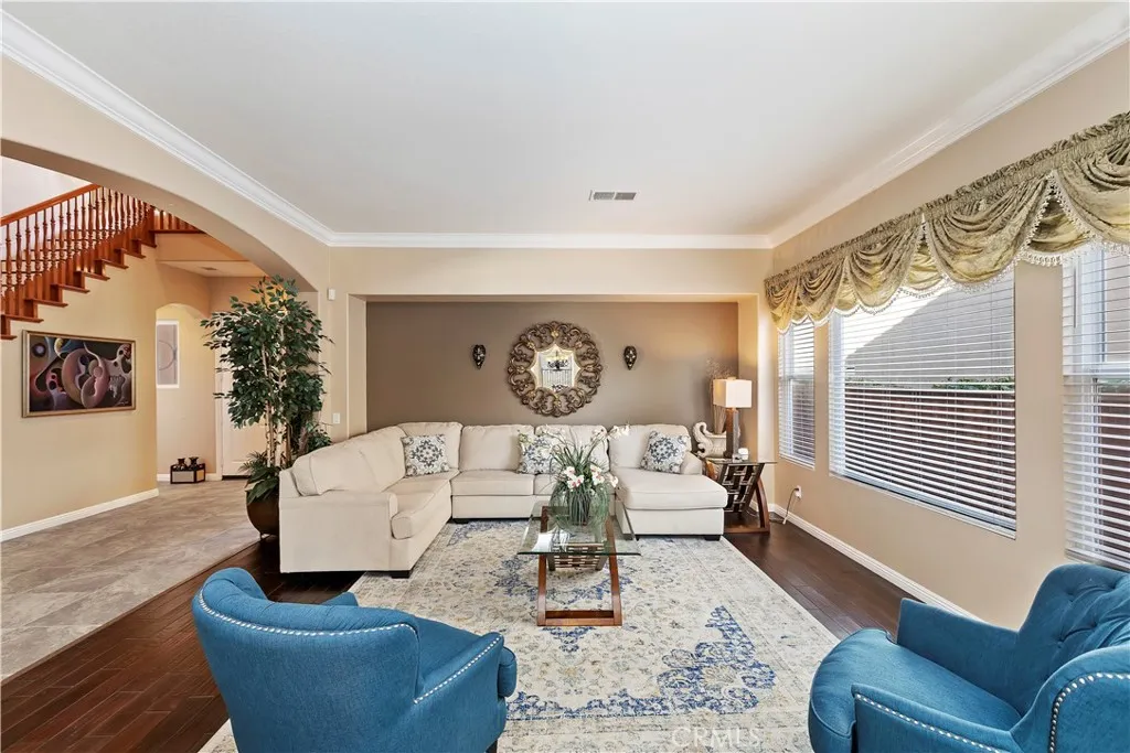 This elegant Spanish-style Executive Home offers expansive mountain views from its cul-de-sac location in Riversides prestigious Lake Hills Reserve. Spanning4496 SqFt on a 16,117 SqFt lot, this residence blends luxury, functionality, and space for both families and professionals. Step into the grand entry, where a flexspace -- perfect for a home office or workout room -- leads to the formal living and dining rooms. The gourmet kitchen boasts granite counters, a tumbled tilebacksplash, and stainless appliances, seamlessly flowing into the fireplace-warmed family room. Upstairs, a spacious bonus room serves as an ideal office orretreat. A Jack & Jill bedroom setup, a rear ensuite bedroom, and a luxurious primary suite with a private balcony, retreat, two walk-in closets, and a spa-like bathcomplete the upper level. And what of the community? Well, the exclusive Lake Hills Reserve offers its residents an ideal mountaintop locale removed from citylife, yet close to Riversides many cultural and educational amenities and near all the shopping attractions! In addition to the hiking, stunning sunsets, the quiet,and panoramic mountaintop views in this patrol-guarded community, residents enjoy a private residents club including a swimming pool, playground, park, anopen-air fireplace pavilion, and the HIGHLY rated Lake Hills Elementary School. This is an ideal location for commuters as the 91 FWY & Metro-link are both VERYclose by. Are you ready for the Lake Hills Reserve lifestyle?