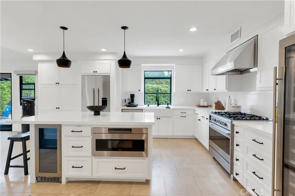 A Rare Opportunity You Won't Want to Miss! Welcome to an exceptional residence nestled in one of Woodland Hills most coveted neighborhoods where refined design, complete privacy, and resort-style living converge effortlessly. Concealed behind mature hedges and a private electric gate, this beautifully reimagined single-story estate offers four bedrooms, three bathrooms, and over $200,000 in curated upgrades. From the moment you enter, rich hardwood floors, soaring vaulted beamed ceilings, and abundant natural light create an atmosphere that is both warm and architecturally striking. At the heart of the home lies a spectacular chefs kitchen, thoughtfully redesigned for both elegance and function. Outfitted with quartz countertops, an expansive center island, stainless-steel appliances, dual wine refrigerators, and a generous walk-in pantry, this culinary space seamlessly serves everyday living and elevated entertaining. Skylights brighten the breakfast area, while the formal dining room provides the perfect backdrop for intimate dinners and festive gatherings alike. The grand living room is equally impressive, showcasing dramatic vaulted ceilings and a statement fireplace that anchors the space with character and comfort. The primary suite serves as a private sanctuary, complete with vaulted ceilings, its own fireplace, beautiful walk-in closet and a spa-inspired bath adorned with marble countertops, a jetted soaking tub, and a glass-enclosed shower. French doors throughout the home invite you into a truly extraordinary backyard retreat. Designed for year round enjoyment, th