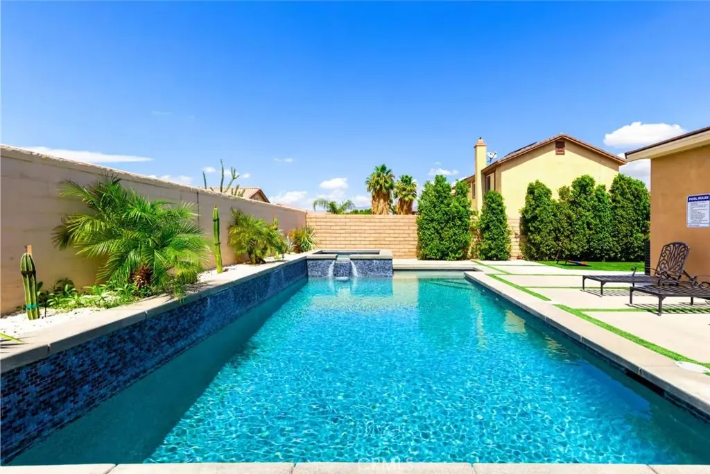 Turnkey, Fully Furnished STR in Terra Lago with Resort Style Backyard Welcome to 43955 Campo Place, a fully furnished desert retreat located inside the gated community of Terra Lago in Indio. This home is situated in an area where short-term rentals may be permitted, subject to buyer verification and all local regulations, offering flexibility for personal use or rental potential. Designed for both relaxation and entertaining, the oversized backyard features a PebbleTec pool and spa, tanning shelf, and generous lounging areas that create a private resort-style setting. Fresh landscaping, artificial turf, and modern hardscape provide excellent curb appeal with low maintenance appeal. Inside, the open concept layout is ideal for gatherings and extended stays. The kitchen is equipped with brand new smart stainless steel appliances, granite countertops, a large island, and a five-burner cooktop that flows seamlessly into the living and dining spaces. Fresh interior paint and surround sound wiring add to the move-in-ready feel. The primary suite offers direct views of the pool and includes a soaking tub, dual vanities, and a separate shower. All bedrooms feature walk-in closets, and the downstairs office or den provides flexible space for guests or remote work. Residents of Terra Lago enjoy access to community amenities, including a lake, clubhouse, fitness center, and parks, all conveniently located near Acrisure Arena, Fantasy Springs Resort Casino, golf, dining, festivals, and desert recreation. Whether you are seeking a desert getaway, second home, or flexible-use property,