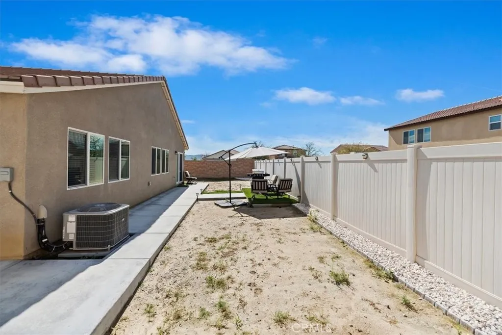 BACK ON MARKET! Beautiful 4 bedroom 3 bath single story home on a corner lot in a wonderful Hemet neighborhood! Built in 2022. PAID for solar! 1897 square feet of gracious living! Move in ready! Walk in through the covered front porch area and find a wide open floor plan! HUGE great room with vaulted ceiling, room for a computer workspace and recessed lighting. The gourmet kitchen features granite countertops, lots of glimmering wood cabinets, pantry, upgraded stainless steel appliances including gas stove, dishwasher and built-in microwave! The kitchen island also doubles as a breakfast bar. Theres a formal dining area off the kitchen/great room area. The spacious primary suite has lots of room for all your bedroom furniture! The primary bathroom has a large walk-in shower, double sinks in the vanity, private commode area and a big walk-in closet. The other 3 bedrooms have lots of room and one even has a walk-in closet. There are 2 other bathrooms, one with a tub/shower combo unit and the other with a walk-in shower. The indoor laundry room is centrally located. The bedrooms are all carpeted and the remaining areas of the house have easy care laminate flooring. Central air and heat. Concrete tile roof. Walk out your sliding glass door to the big backyard with lots of upgraded concrete, a BBQ area and a combination of vinyl and block wall fencing. The front yard has water-wise landscaping. 2 car garage with roll up door and automatic opener. The garage is fully finished inside. 13 panel solar system, fully paid for, to help with your electric bills! The HOA is only $98 per