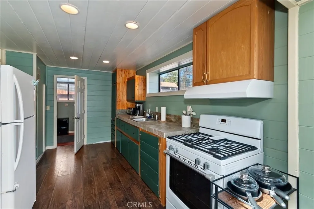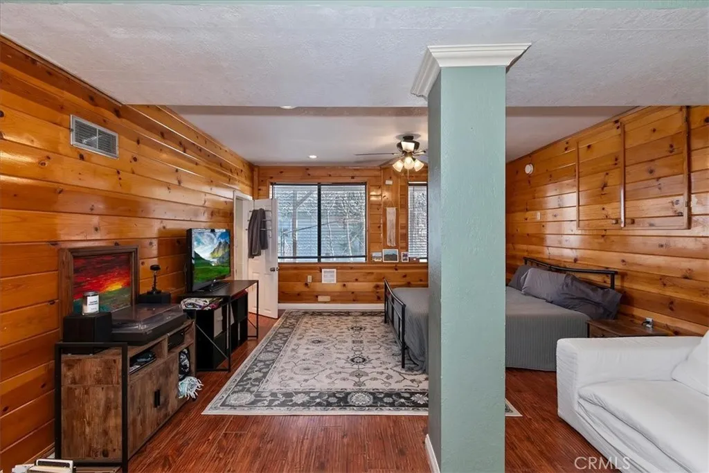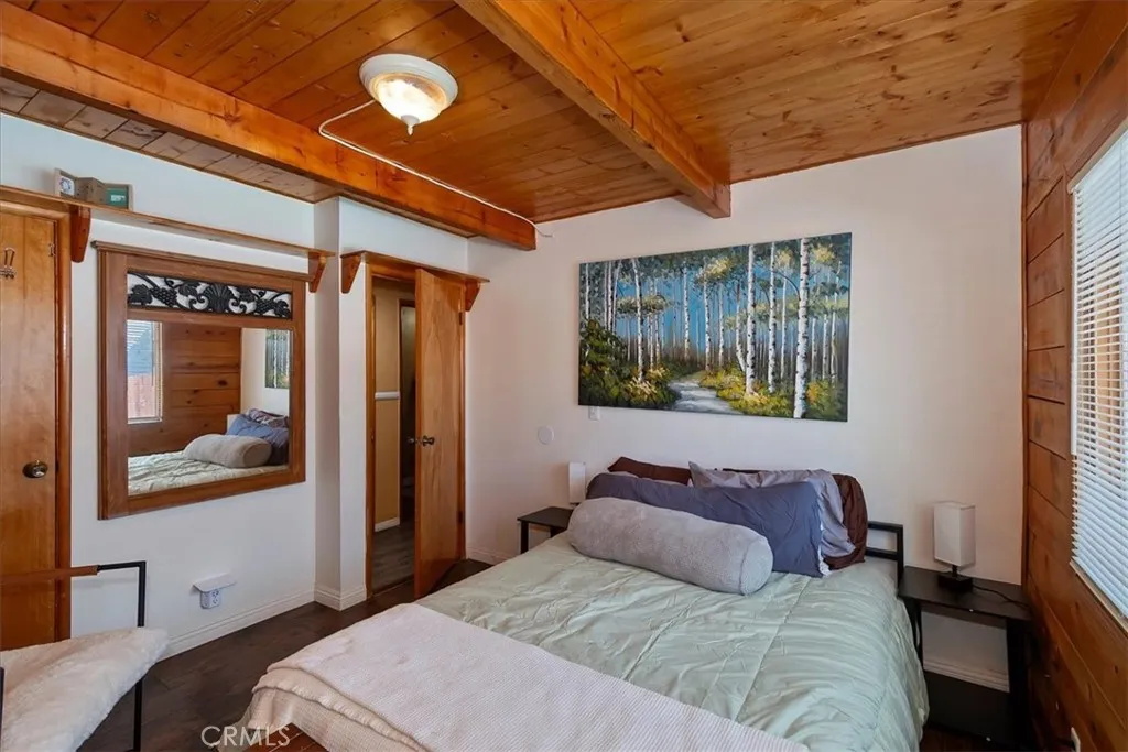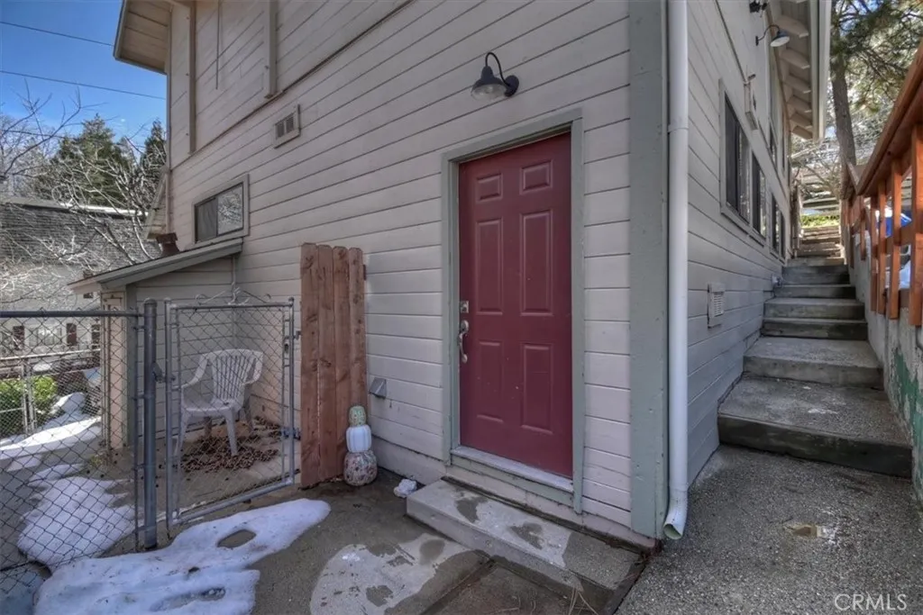 Unique mountain retreat featuring a rare in-ground pool and spa located in Lake Arrowheads charming Deer Lodge Park community. Situated on a spacious corner lot, this property offers a detached garage with ample storage below and a newly redone parking deck. Two separate yard areas provide space for the pool, entertaining, pets, or potential tenants. Just a few steps lead to the front door where you enter the open-concept main living area featuring vaulted, beamed T&G ceilings and a dramatic wall of windows that fills the space with natural light. The living room includes a newer wood-burning stove for cozy winter evenings and a newer A/C split unit for comfortable summers. The kitchen features a large island with a gas cooktop and breakfast bar seating, granite countertops, and double ovens. The dining area overlooks the beautiful pool and spa, creating a perfect setting for entertaining. The main floor offers two bedrooms and a bathroom. Upstairs, youll find a spacious primary suite with a loft office area, two separate vanity's; one with dual sinks and other for getting ready, walk in closet, and a private balcony. The lower level includes a separate apartment ideal for rental income or guest accommodations, with the potential to convert it back into part of the main residence. It offers one large bedroom with ample storage, bathroom, kitchen, pantry, and sunroom feel dining room, with fenced side yard. Large laundry room/mudroom. Enjoy outdoor living in the charming poolside gazebo, perfect for relaxing or entertaining. If you love nature and hiking there are trails and