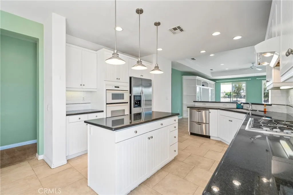 Experience resort-style living in this beautiful Championship 2 floor plan located in the highly desirable, gated Four Seasons Hemet 55+ community with scenic golf course and mountain views. This home offers 3 bedrooms and 2.5 bathrooms, including a detached casita with its own bath, perfect for guests or a private office. The spacious great room features custom built-ins and ceiling fans throughout, while the kitchen is appointed with granite countertops, a 2-drawer dishwasher and a 5-burner stove. The primary suite includes custom built-ins, a pocket door for added privacy, and an organized closet system. Additional highlights include sound-insulated interior walls, central vacuum, and a garage with epoxy flooring and extensive cabinetry. Enjoy outdoor living in the flagstone courtyard with fountain and covered patios in both the courtyard and backyard, ideal for relaxing or entertaining. Residents enjoy exceptional amenities including 24-hour security, Bistro, ballroom, theatre, fitness center, pool, spa, and multiple recreation courts, all within close proximity to Diamond Valley Lake and Temecula Wine Country.