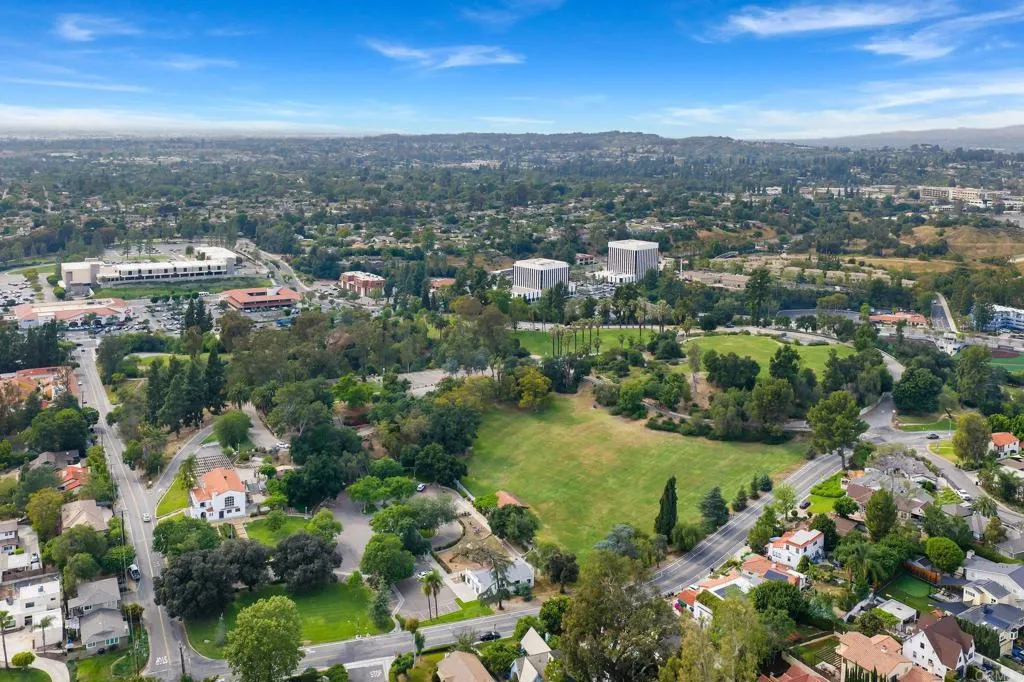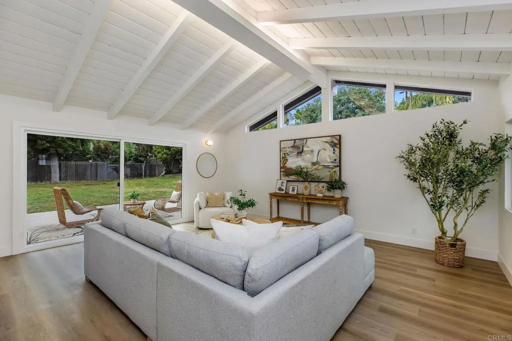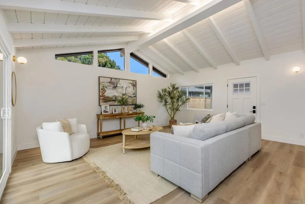 A fully reimagined single-story home where California ranch character meets luxurious modern living, on a generous lot just steps from Hillcrest Park. Four bedrooms, two impeccable baths, and an expansive backyard make this one of the most compelling offerings Raymond Hills has seen. A bold black front door welcomes you into soaring vaulted ceilings with white-painted exposed beams and warm wide-plank flooring throughout. The living room features a captivating floor-to-ceiling fireplace surround and a full wall of sliding glass doors opening to the backyard. The kitchen is a chef's showpiece, elegant countertops, grey shaker cabinetry, a white oak island with seating, brass fixtures, and premium stainless steel appliances, anchored by a charming built-in breakfast nook. The primary en-suite is a standout dual-sink vanity with Calacatta countertops, gold-framed mirrors and sconces, and a frameless glass rain shower with bench and mosaic tile floor. The hall bath holds its own with vertical sand-toned tile, matte black fixtures, and a dual-sink oak vanity. Every surface has been thoughtfully considered. Outside, a wide concrete patio runs the length of the home, framed by mature trees and open lawn, it's full of potential. Nearby Hillcrest Park, the Fullerton Loop trail, and vibrant Downtown Fullerton. Highly rated schools are accessible within the Fullerton Joint Union High School District. Come see this compelling home in Raymond Hills.