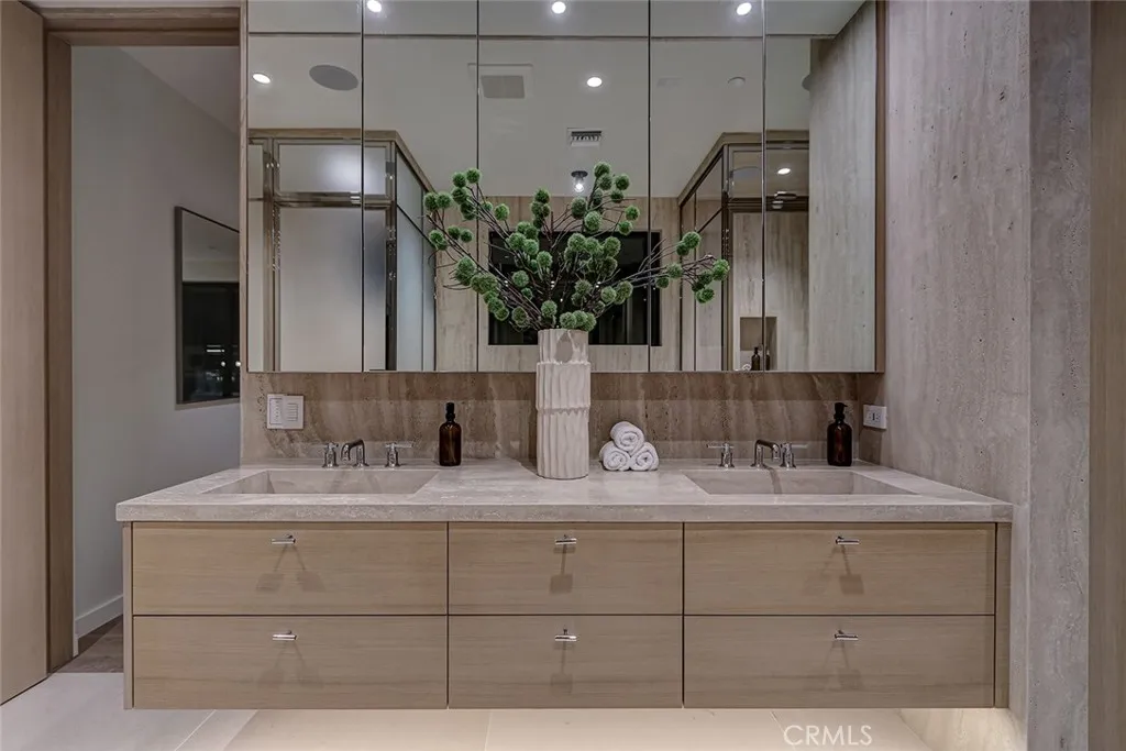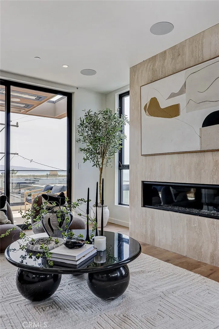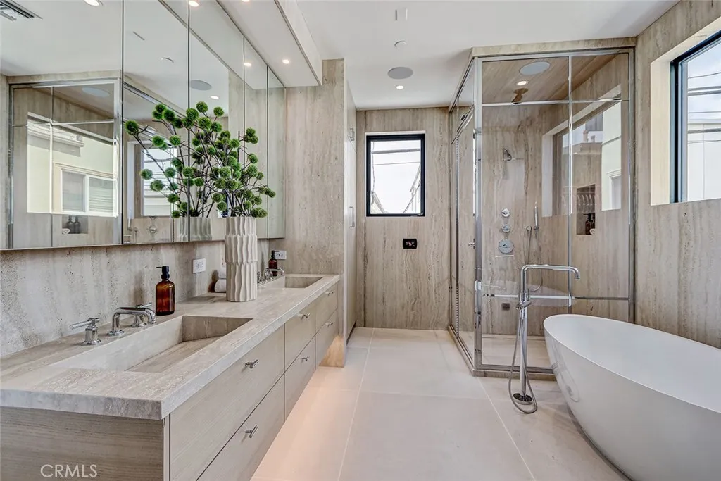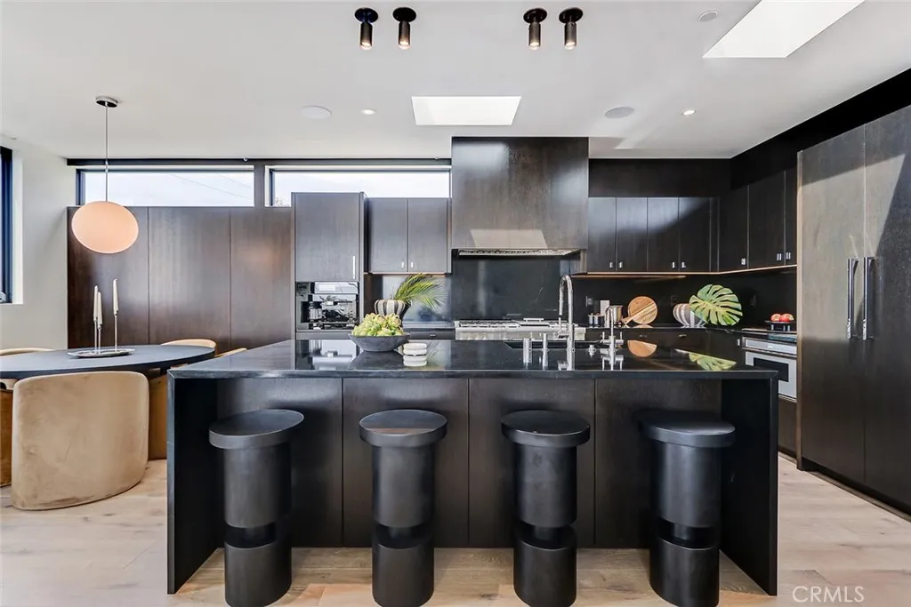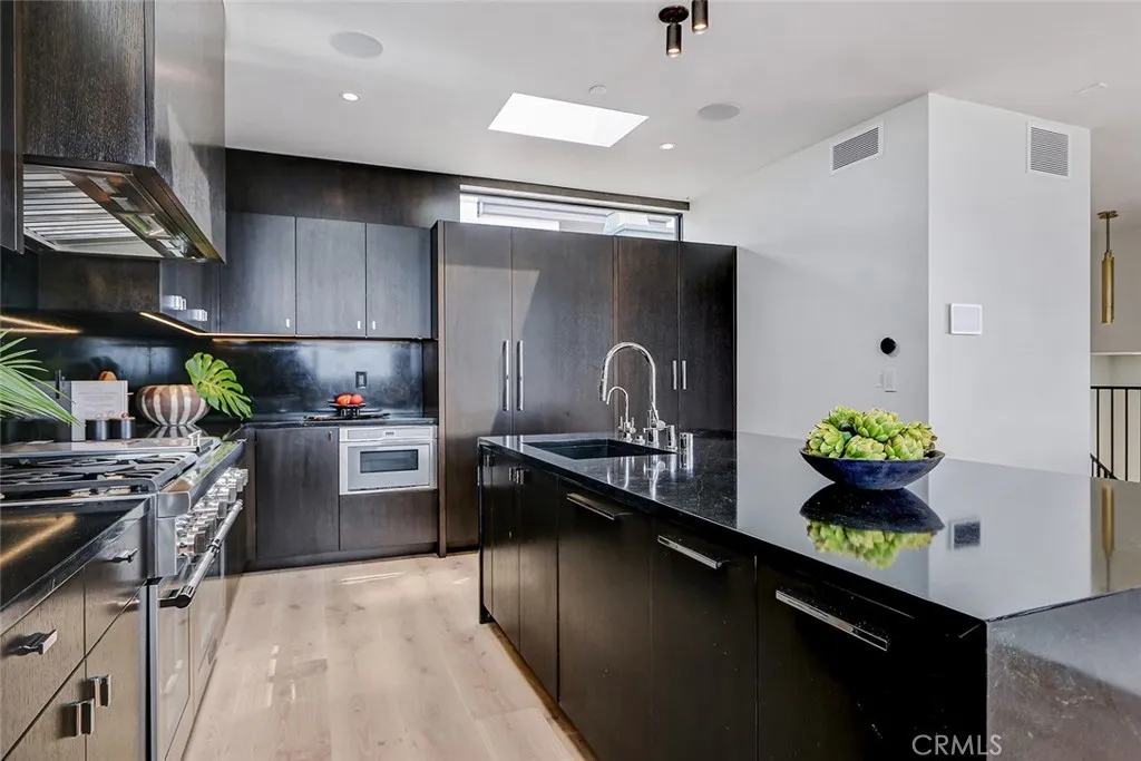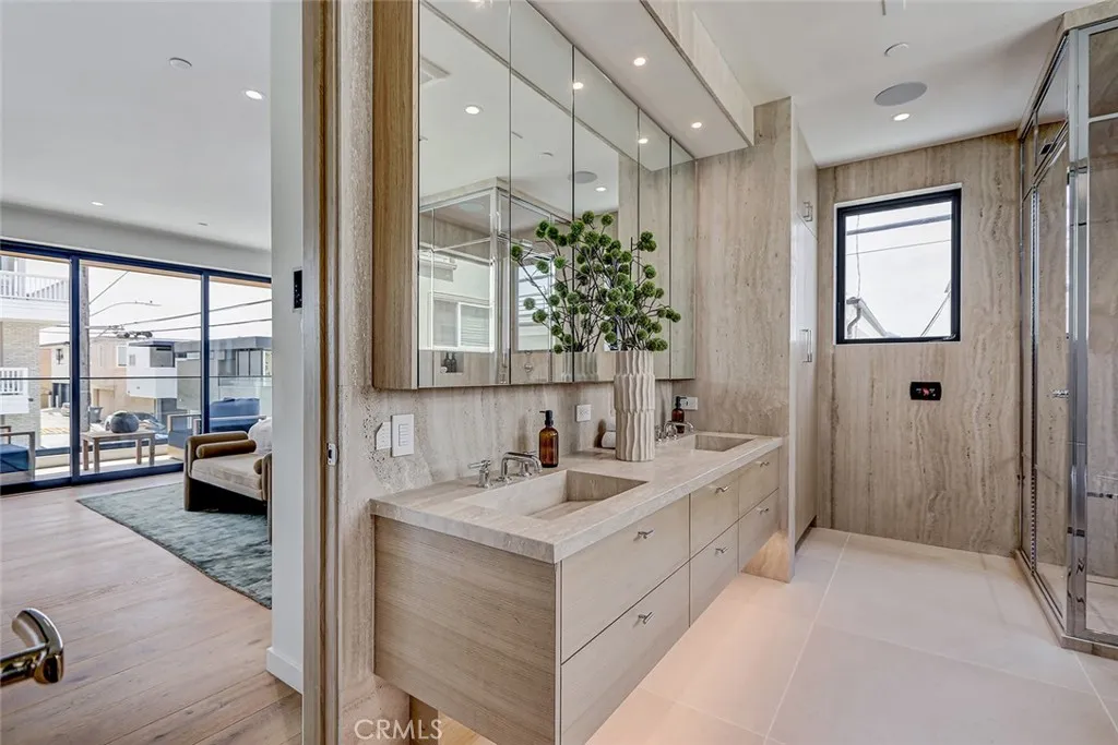 Welcome to a rare custom-built residence positioned on a coveted corner walk-street. Built with quality by Jared Cleland, architecturally designed by Nagy Bakhoum of Obelisk Architects, and complete exterior and interior design by Kate Hartmann of Studio Kiki, this home was intentionally crafted to stand apart from the typical beach home. There is a refined coastal essence throughoutwhere materials, light, and space work in harmony to create something both bold and deeply considered. The corner location floods the home with natural light from every angle, including rare, sunlit basement spaces. Positioned on the north side of the street facing south, the home enjoys all-day sunshine, while also capturing protected ocean views that are uniquely preserved due to its premier corner placement. Opportunities to own a custom home on a corner walk-street with these attributes are exceptionally rare. The master bedroom serves as a private retreat, anchored by ivory Roman travertine walls, Beaumaniere limestone floors, countertops with integrated sinks and high-tone hardware. The space features a modern soaking tub, private water closet, and a linen closet, but an absolutely spectacular (bespoke) glass-cage shower from (Met-Tec in North Hollywood). Reflecting the purity of fine design, it is trimmed in shining silver, punctuating a truly radiant space. The kitchen is both functional and striking, highlighted by a Saratoga soapstone island and backsplash with an integrated sink, paired with rich espresso-stained cabinetry for a bold yet timeless contrast. Each bathroom offers its own