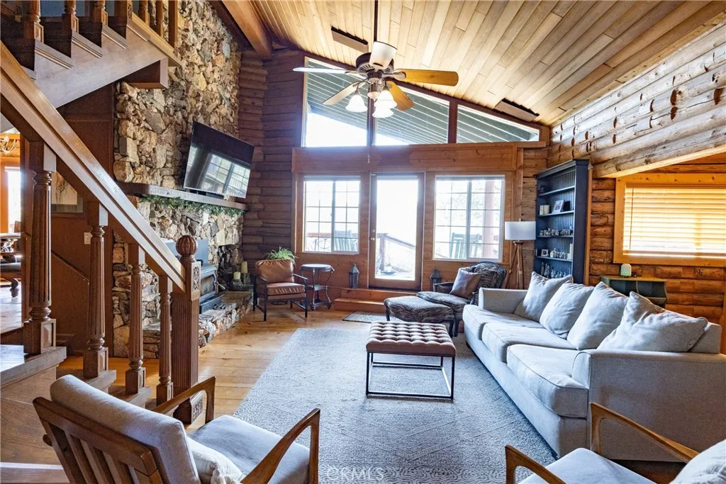 Priced to sell, and one look inside will show you exactly why. Set at the end of a private cul-de-sac on over 2.5 acres, this striking custom log home sits high above it all, capturing panoramic mountain views in every direction. With 4 bedrooms and 3 bathrooms, the home offers a perfect mix of rustic character and modern upgrades. Distinctive craftsmanship is showcased throughout, including detailed woodwork accents and custom carved elements that create a warm, one-of-a-kind feel from the moment you enter. All bathrooms have been fully updated, and the primary suite has been completely renovated, offering a fresh, comfortable retreat that features a mini split climate control along with the central heat and air. The standout feature is the recently built, expanded deck designed to take full advantage of the elevated setting with incredible views overlooking the golf course and lake below. It's an ideal spot for entertaining or unwinding while soaking in the scenery. Enjoy outdoor living at its best with an above-ground pool and a spacious above-ground spa that comfortably accommodates up to six people perfect for relaxing while taking in the surrounding views. The home is equipped with owned solar and battery backup, providing energy efficiency, reliability, and peace of mind year-round. Upstairs, a versatile loft area opens to its own private deck, offering the perfect space for a home office, reading nook, or creative studio. With its privacy, views, upgraded features, and income potential, this property is well-suited as a primary residence, second home, or vacation re