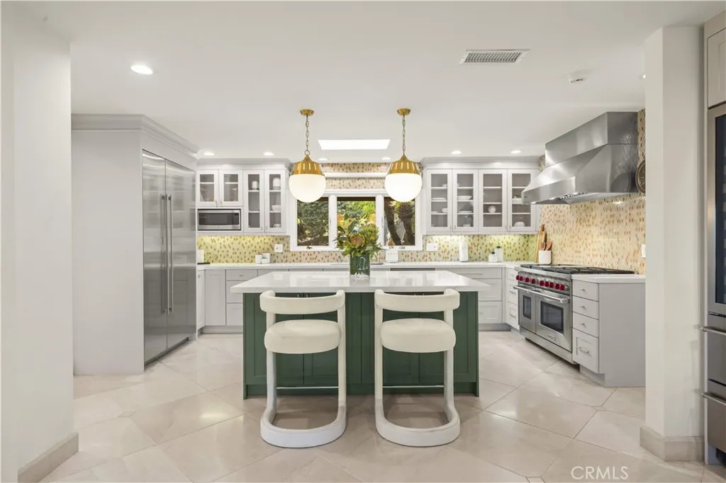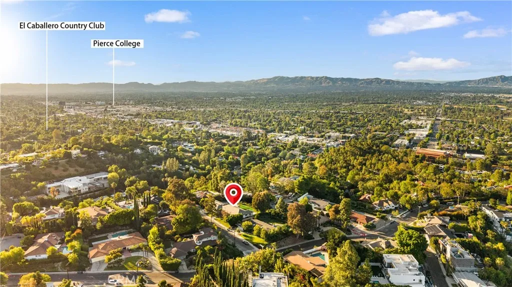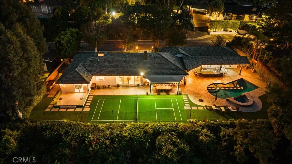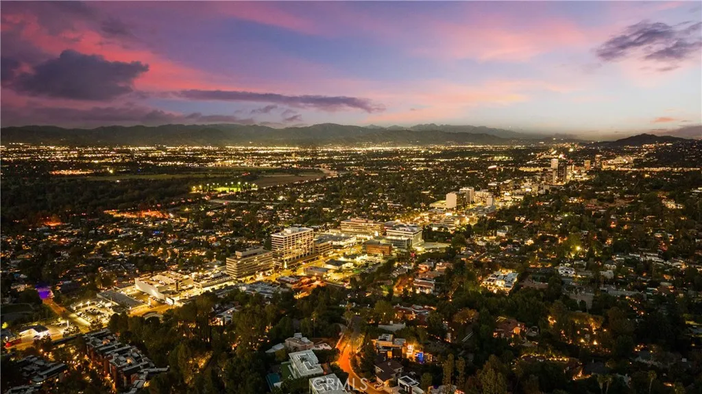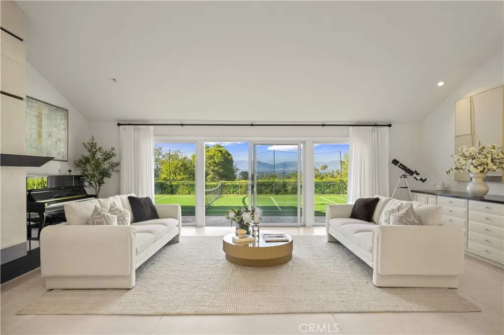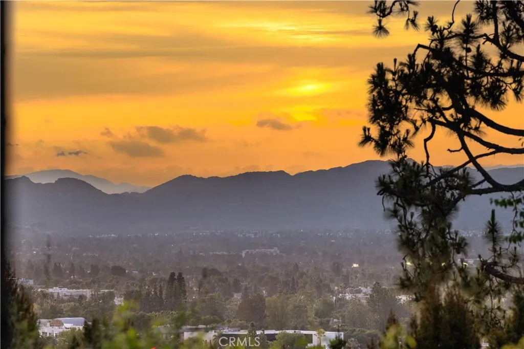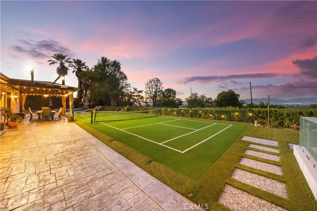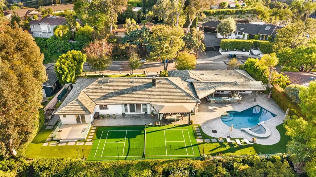 Located on a quiet cul-de-sac in the Encino Hills, this single-story residence offers 5 bedrooms and 5 bathrooms across approximately 3,775 sqft, set on an expansive flat lot of about 17,000 sqft with sweeping city and mountain views. The home features a functional single-level floor plan with main living areas at the center and separate bedroom wings for privacy. Upon entry, open sightlines extend through the living area to the backyard, enhanced by vaulted ceilings, clean lines, and expansive sliding doors that bring in natural light. The living room includes a double-sided fireplace and connects seamlessly to the dining area and kitchen. The updated kitchen features a large center island, stone countertops, and high-end appliances including a 48 Sub-Zero refrigerator, Wolf range, and Cove dishwasher. The primary suite offers direct access to a private patio, along with a remodeled spa-style bathroom and walk-in closet. A guest suite near the garage includes a dressing area and full bath, ideal for guests or extended living. Upgrades include updated plumbing and drainage, new water heater, remodeled bathrooms with Kohler fixtures, solid wood flooring in bedrooms, whole-house water filtration, Nest-controlled HVAC, upgraded network wiring, and a comprehensive security system. The backyard offers a rare flat hillside setting with panoramic valley views, a pool and spa, built-in BBQ, multiple seating areas, and a private sport court suitable for pickleball. No HOA or Mello-Roos. A rare opportunity for refined single-story living in a prime Encino Hills location.
