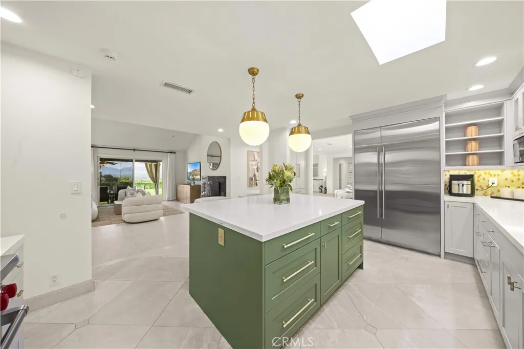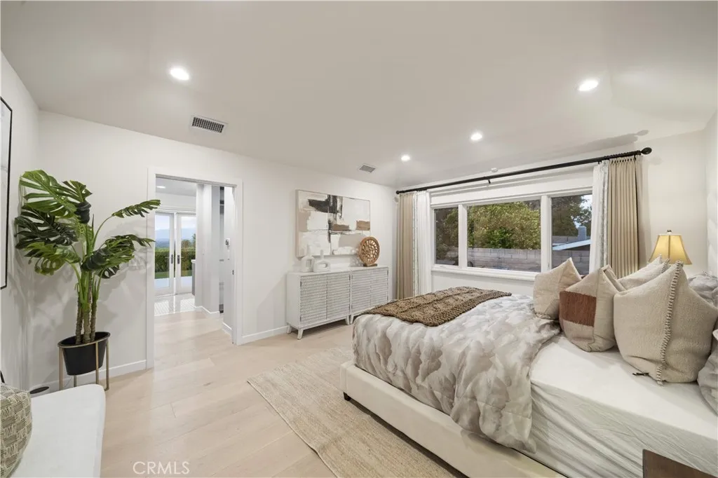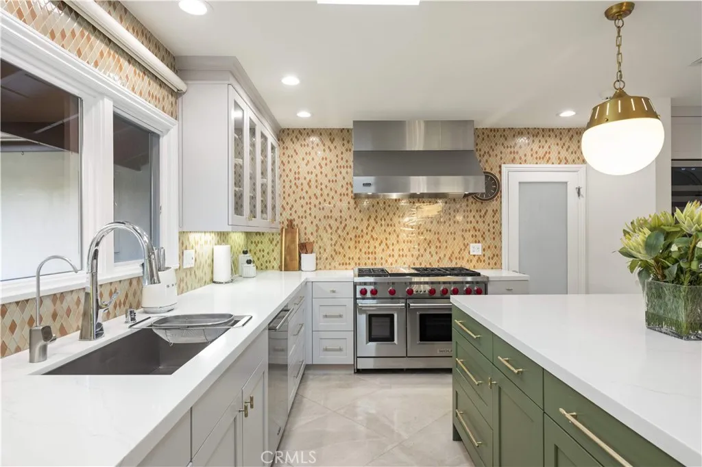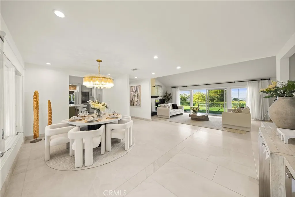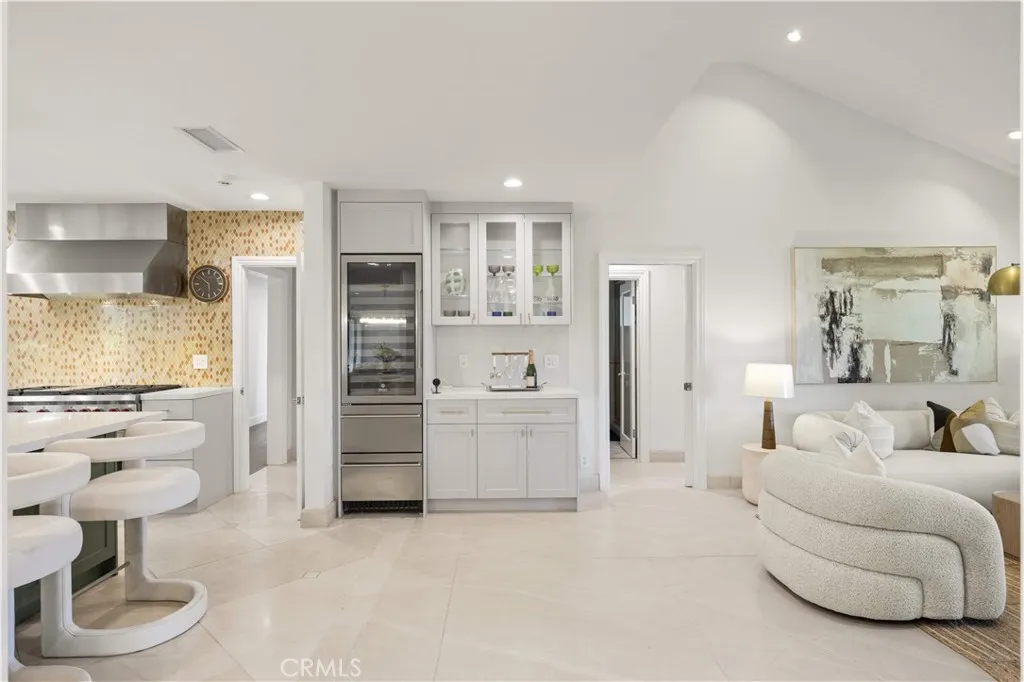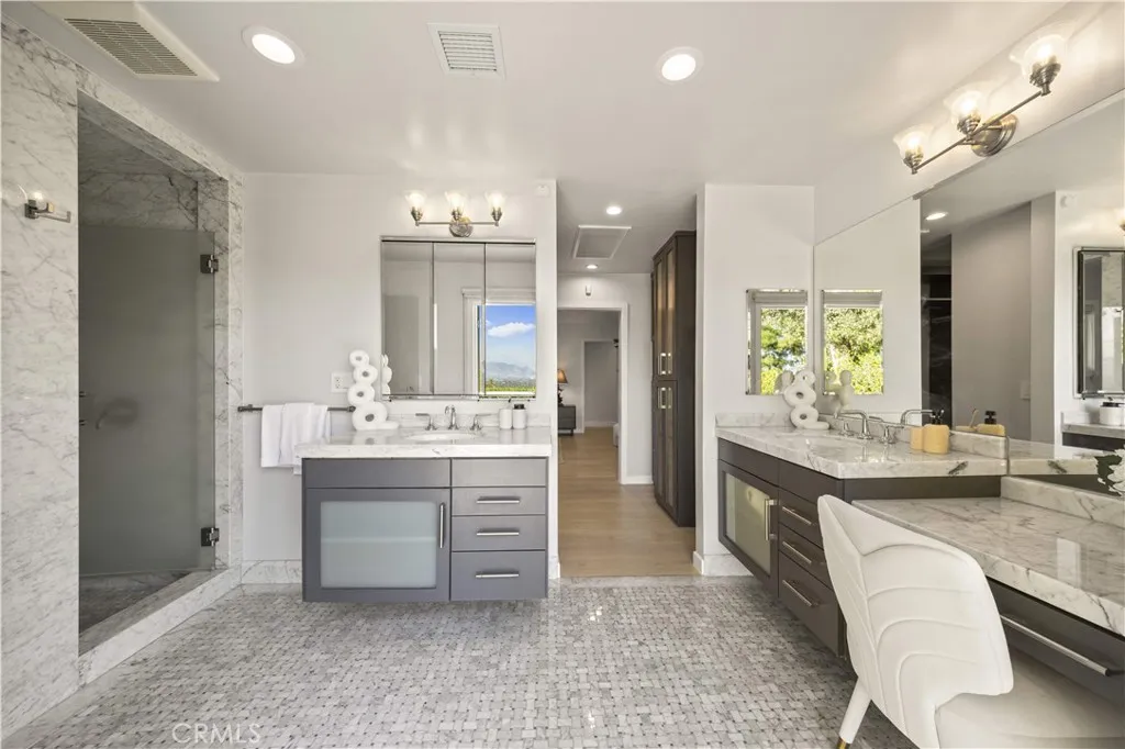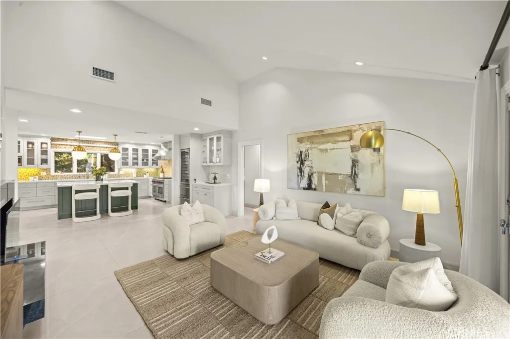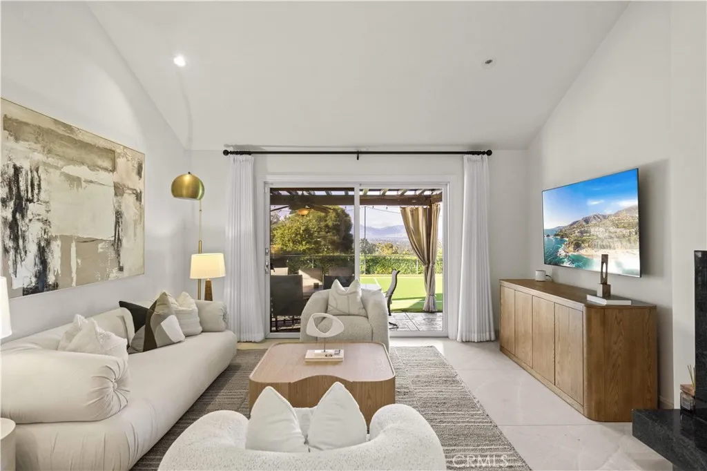 Located on a quiet cul-de-sac in the Encino Hills, this single-story residence offers 5 bedrooms and 5 bathrooms across approximately 3,775 sqft, set on an expansive flat lot of about 17,000 sqft with sweeping city and mountain views. The home features a functional single-level floor plan with main living areas at the center and separate bedroom wings for privacy. Upon entry, open sightlines extend through the living area to the backyard, enhanced by vaulted ceilings, clean lines, and expansive sliding doors that bring in natural light. The living room includes a double-sided fireplace and connects seamlessly to the dining area and kitchen. The updated kitchen features a large center island, stone countertops, and high-end appliances including a 48 Sub-Zero refrigerator, Wolf range, and Cove dishwasher. The primary suite offers direct access to a private patio, along with a remodeled spa-style bathroom and walk-in closet. A guest suite near the garage includes a dressing area and full bath, ideal for guests or extended living. Upgrades include updated plumbing and drainage, new water heater, remodeled bathrooms with Kohler fixtures, solid wood flooring in bedrooms, whole-house water filtration, Nest-controlled HVAC, upgraded network wiring, and a comprehensive security system. The backyard offers a rare flat hillside setting with panoramic valley views, a pool and spa, built-in BBQ, multiple seating areas, and a private sport court suitable for pickleball. No HOA or Mello-Roos. A rare opportunity for refined single-story living in a prime Encino Hills location.