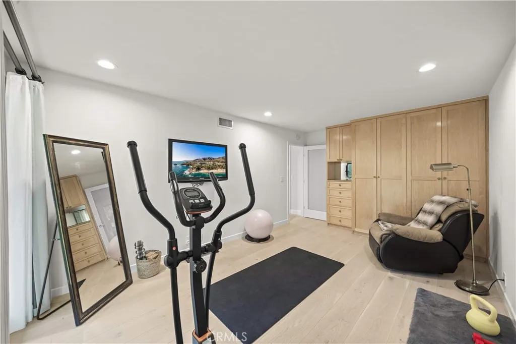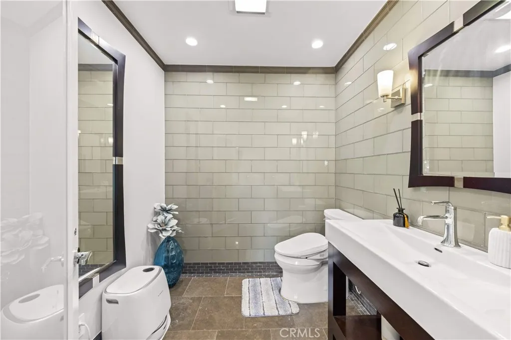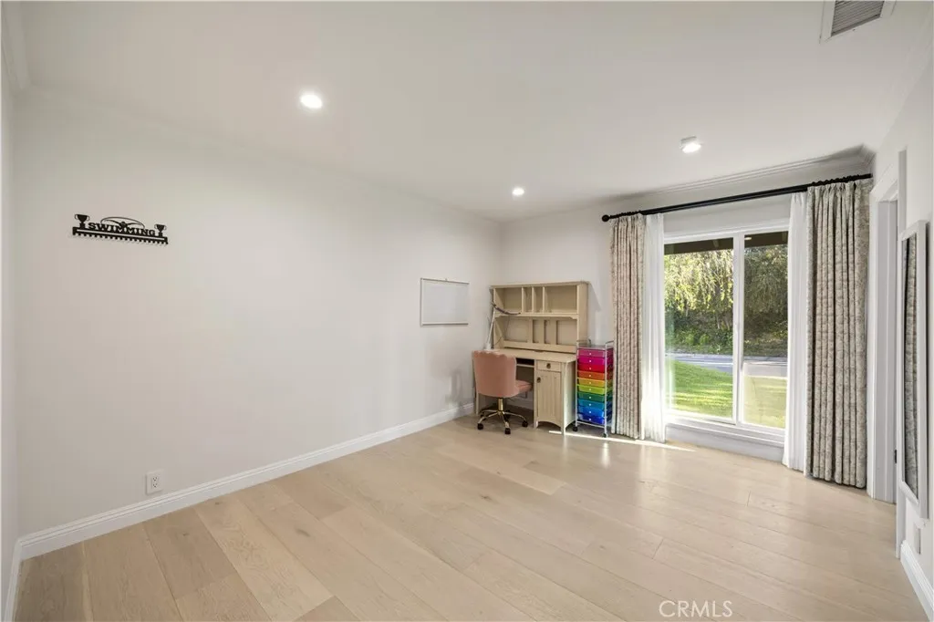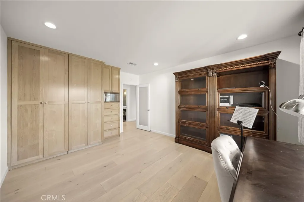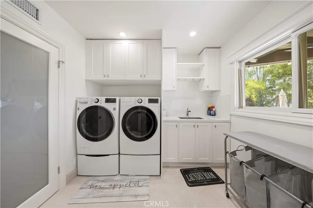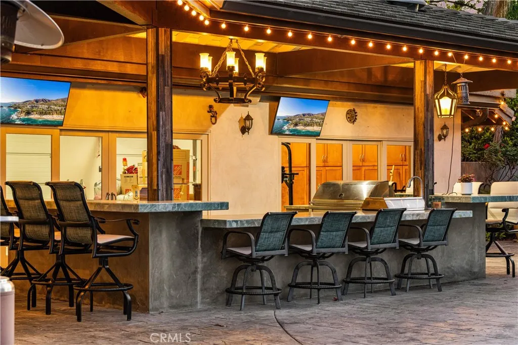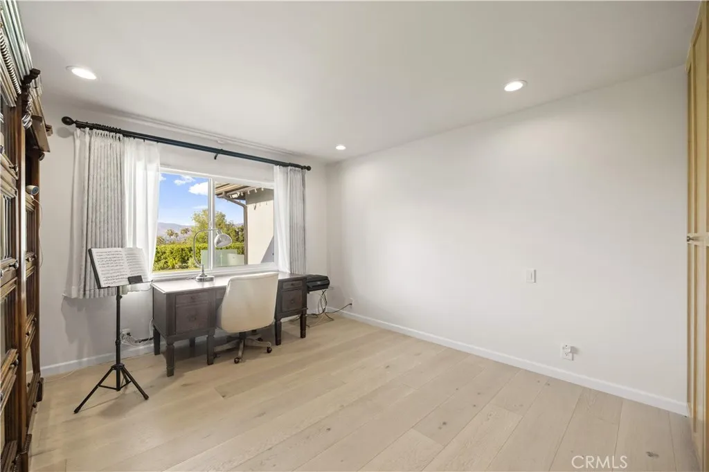 Located on a quiet cul-de-sac in the Encino Hills, this single-story residence offers 5 bedrooms and 5 bathrooms across approximately 3,775 sqft, set on an expansive flat lot of about 17,000 sqft with sweeping city and mountain views. The home features a functional single-level floor plan with main living areas at the center and separate bedroom wings for privacy. Upon entry, open sightlines extend through the living area to the backyard, enhanced by vaulted ceilings, clean lines, and expansive sliding doors that bring in natural light. The living room includes a double-sided fireplace and connects seamlessly to the dining area and kitchen. The updated kitchen features a large center island, stone countertops, and high-end appliances including a 48 Sub-Zero refrigerator, Wolf range, and Cove dishwasher. The primary suite offers direct access to a private patio, along with a remodeled spa-style bathroom and walk-in closet. A guest suite near the garage includes a dressing area and full bath, ideal for guests or extended living. Upgrades include updated plumbing and drainage, new water heater, remodeled bathrooms with Kohler fixtures, solid wood flooring in bedrooms, whole-house water filtration, Nest-controlled HVAC, upgraded network wiring, and a comprehensive security system. The backyard offers a rare flat hillside setting with panoramic valley views, a pool and spa, built-in BBQ, multiple seating areas, and a private sport court suitable for pickleball. No HOA or Mello-Roos. A rare opportunity for refined single-story living in a prime Encino Hills location.