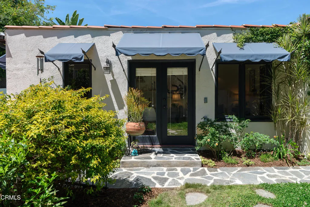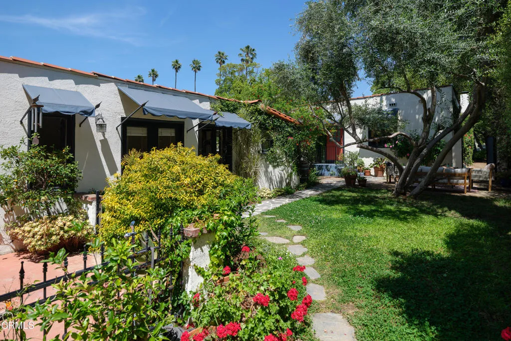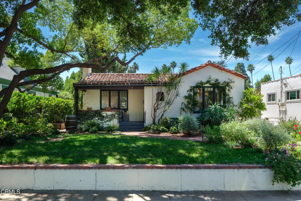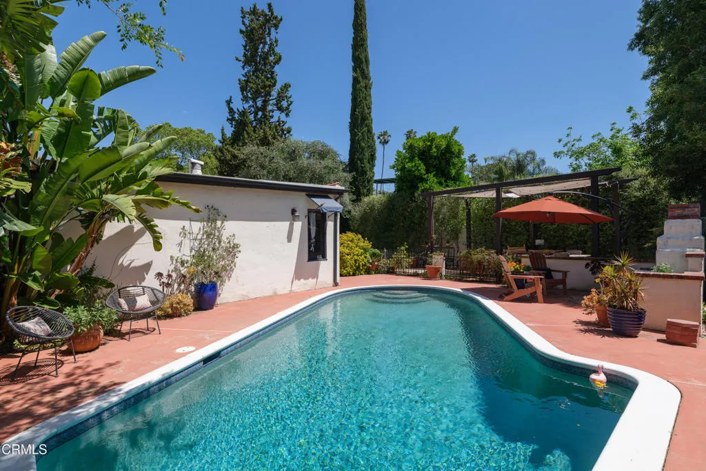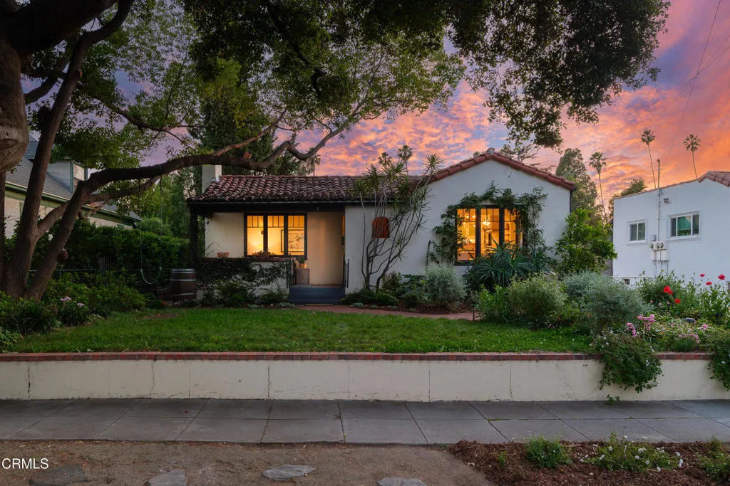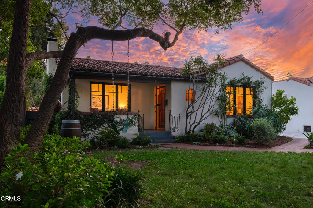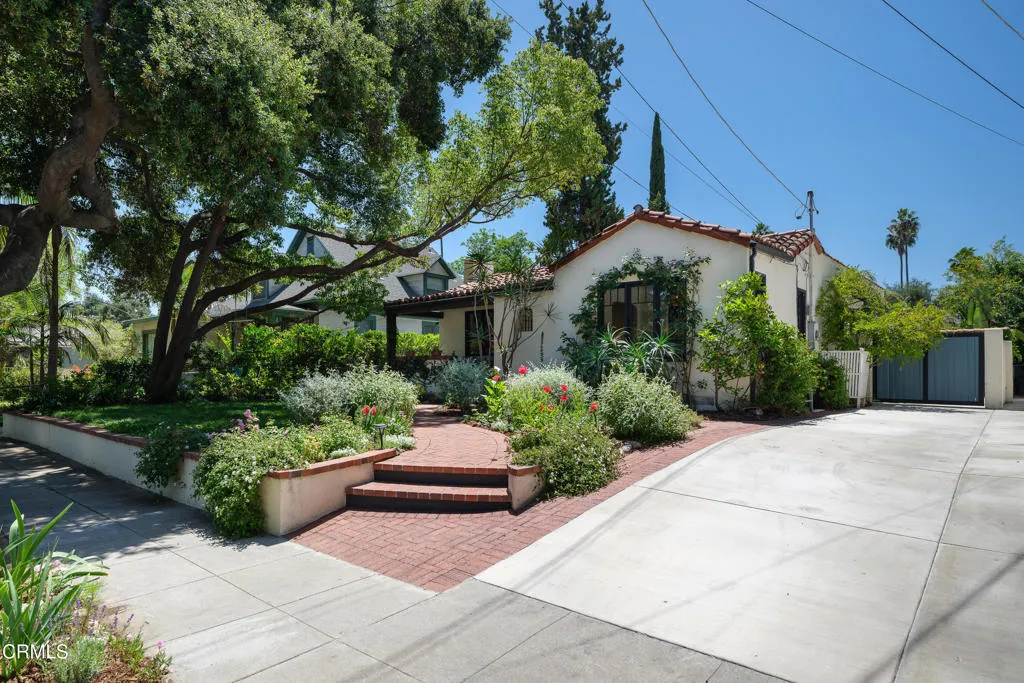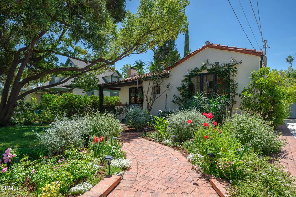 This beautiful three bedroom, two bath 1,454 square foot (as measured) Spanish, with an enchanting one bedroom, one bath, 356 square foot (as measured) accessory structure is absolutely picture-perfect. You enter the romantic residence via a welcoming front porch that steps into the elegant interior. The gorgeous living room features hardwood floors and a central decorative fireplace, flanked by custom rich wood, glass-fronted cabinetry that beckons you in. Additionally, there is an inviting formal dining room wrapped in windows that adjoins the impeccably remodeled kitchen with stainless steel appliances, an expansive peninsula with bar seating, quartzite counters, as well as a built-in desk or workspace. There are three bedrooms with plenty of storage, as well as two magazine-worthy renovated bathrooms. The back accessory structure has one bedroom, one bath, and a kitchenette. It has limitless possibilities and could be a fantastic office, guest abode, or entertainer's cabana as it is sited right off the pool. Other highlights at the property include designer fixtures, coved ceilings, arched doorways, gleaming hardware, and sumptuous marble tile. The home, which has incredible curb appeal, sits on a verdant 8,208 square foot lot filled with an abundance of blooming blossoms as well as native plants. It has a flower-lined front path surrounding the lush lawn that leads you to the gracious raised porch. The backyard, with a glistening pool, is a paradise that showcases the best of the California lifestyle. There are numerous spaces for relaxing beneath the stars, quiet refl