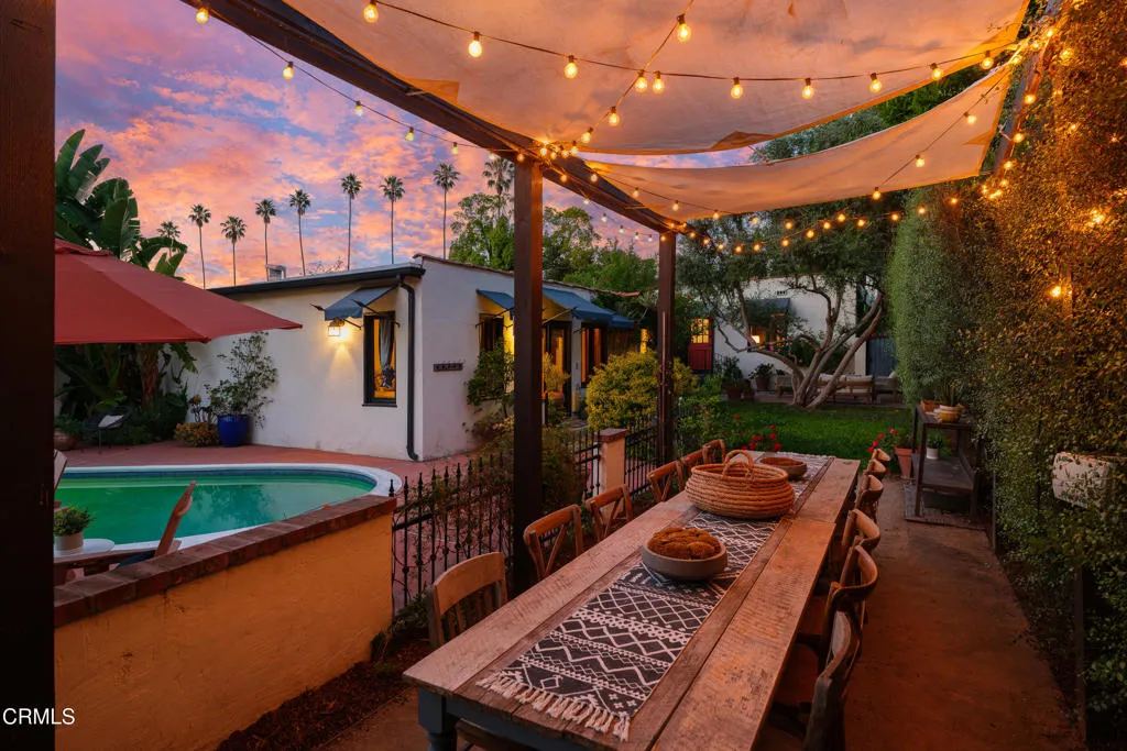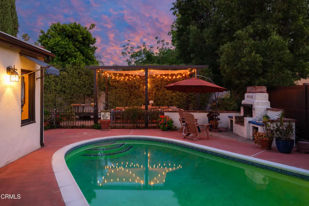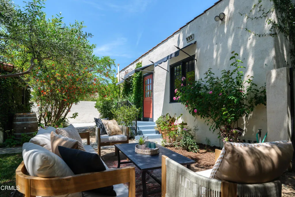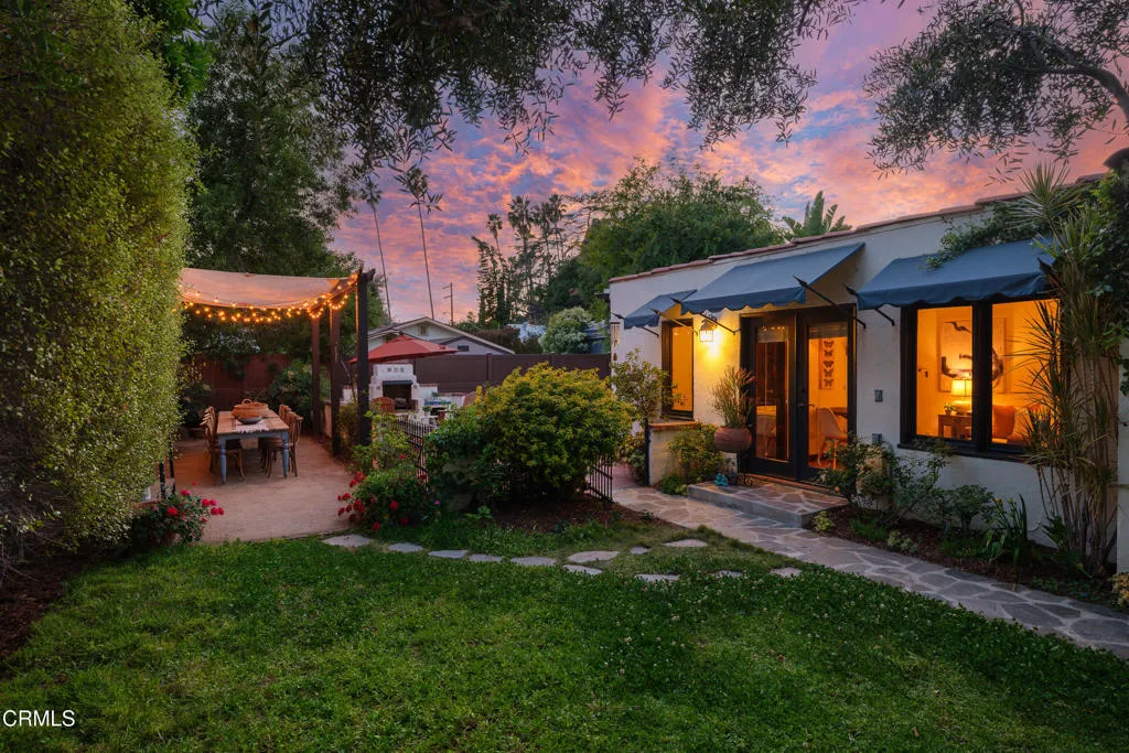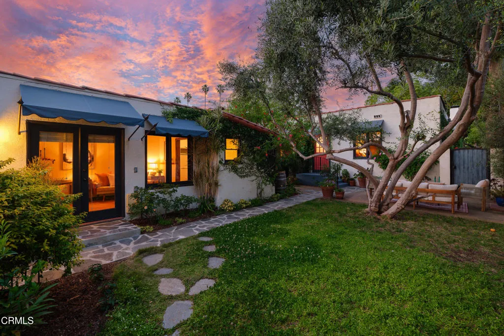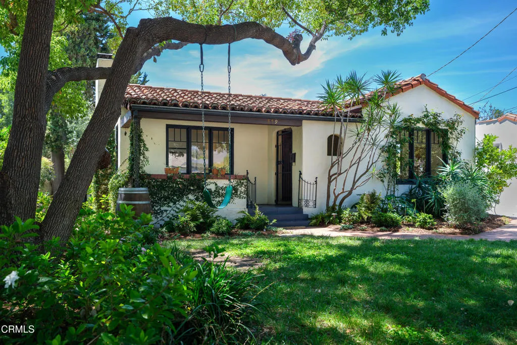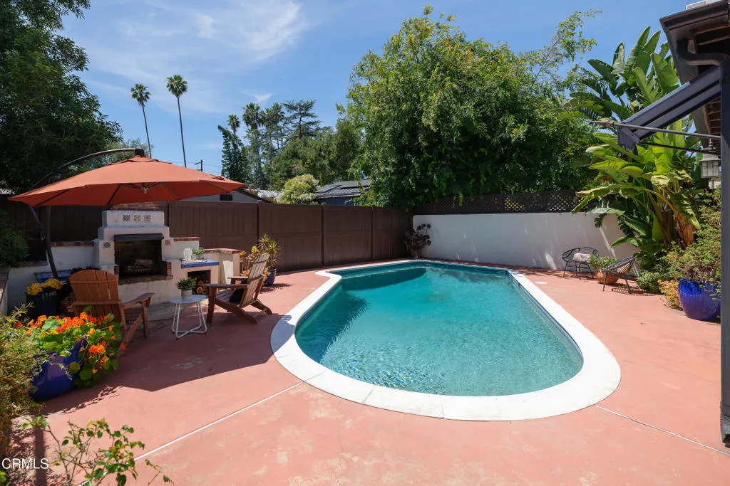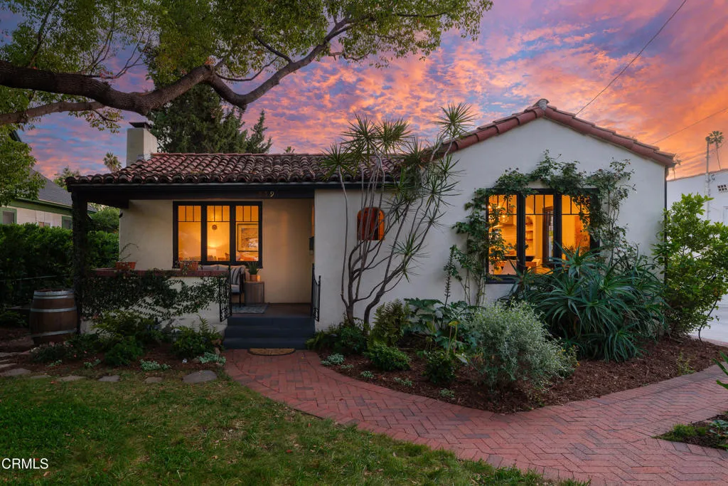 This beautiful three bedroom, two bath 1,454 square foot (as measured) Spanish, with an enchanting one bedroom, one bath, 356 square foot (as measured) accessory structure is absolutely picture-perfect. You enter the romantic residence via a welcoming front porch that steps into the elegant interior. The gorgeous living room features hardwood floors and a central decorative fireplace, flanked by custom rich wood, glass-fronted cabinetry that beckons you in. Additionally, there is an inviting formal dining room wrapped in windows that adjoins the impeccably remodeled kitchen with stainless steel appliances, an expansive peninsula with bar seating, quartzite counters, as well as a built-in desk or workspace. There are three bedrooms with plenty of storage, as well as two magazine-worthy renovated bathrooms. The back accessory structure has one bedroom, one bath, and a kitchenette. It has limitless possibilities and could be a fantastic office, guest abode, or entertainer's cabana as it is sited right off the pool. Other highlights at the property include designer fixtures, coved ceilings, arched doorways, gleaming hardware, and sumptuous marble tile. The home, which has incredible curb appeal, sits on a verdant 8,208 square foot lot filled with an abundance of blooming blossoms as well as native plants. It has a flower-lined front path surrounding the lush lawn that leads you to the gracious raised porch. The backyard, with a glistening pool, is a paradise that showcases the best of the California lifestyle. There are numerous spaces for relaxing beneath the stars, quiet refl