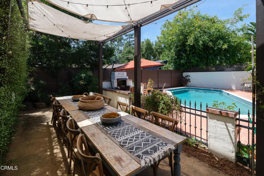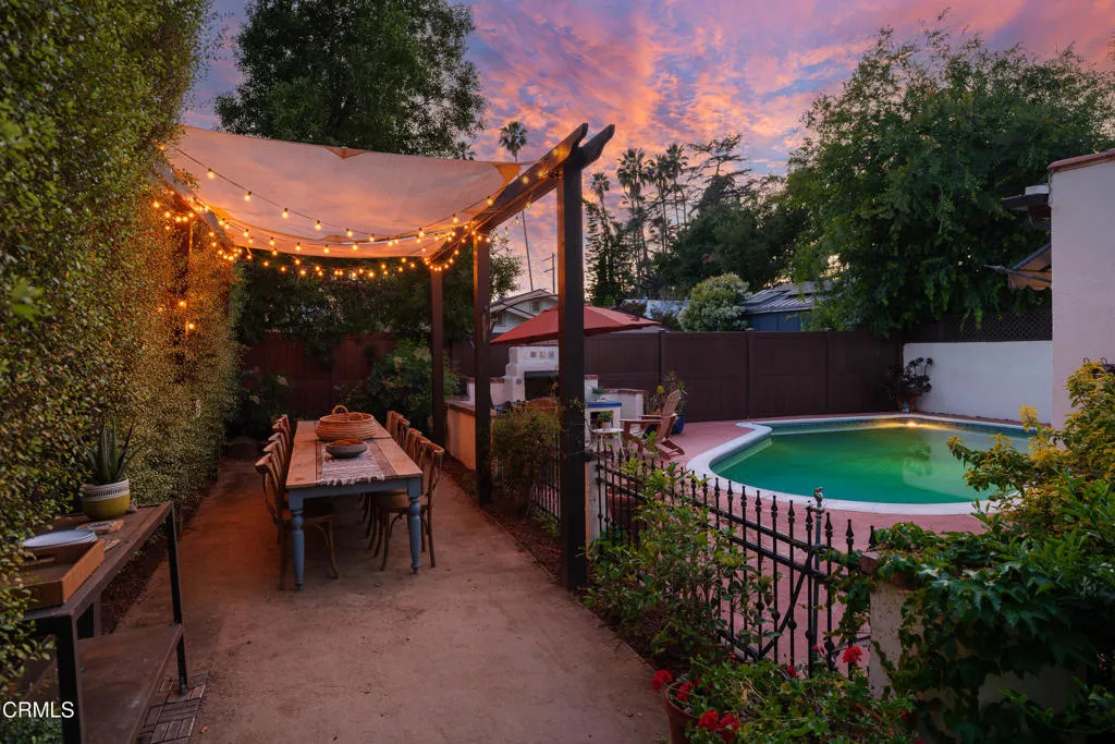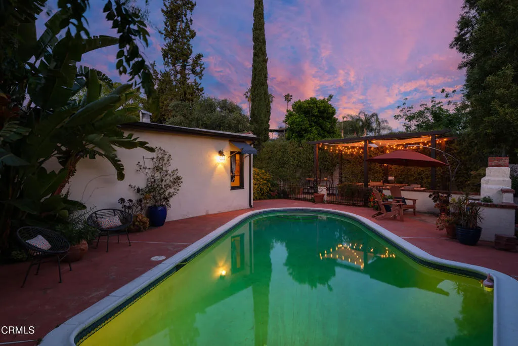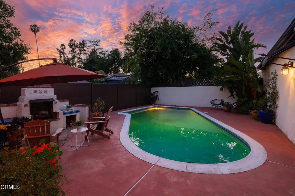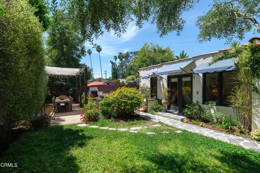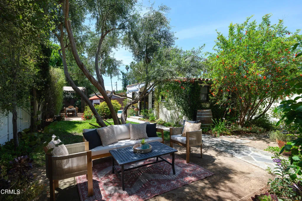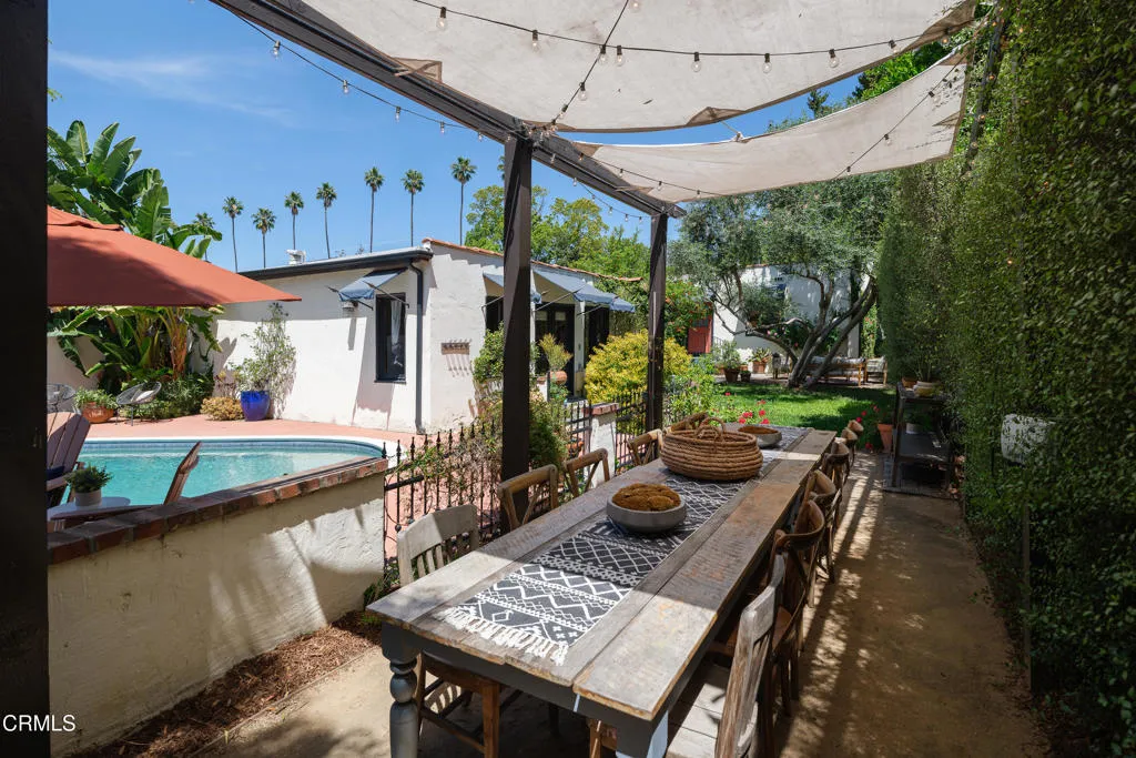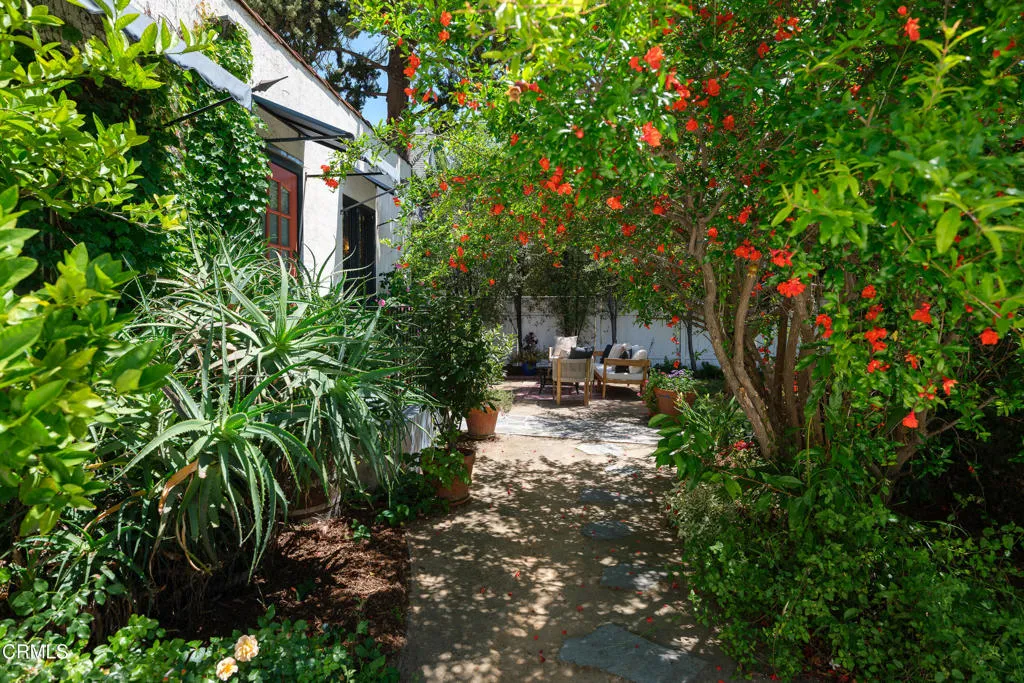 This beautiful three bedroom, two bath 1,454 square foot (as measured) Spanish, with an enchanting one bedroom, one bath, 356 square foot (as measured) accessory structure is absolutely picture-perfect. You enter the romantic residence via a welcoming front porch that steps into the elegant interior. The gorgeous living room features hardwood floors and a central decorative fireplace, flanked by custom rich wood, glass-fronted cabinetry that beckons you in. Additionally, there is an inviting formal dining room wrapped in windows that adjoins the impeccably remodeled kitchen with stainless steel appliances, an expansive peninsula with bar seating, quartzite counters, as well as a built-in desk or workspace. There are three bedrooms with plenty of storage, as well as two magazine-worthy renovated bathrooms. The back accessory structure has one bedroom, one bath, and a kitchenette. It has limitless possibilities and could be a fantastic office, guest abode, or entertainer's cabana as it is sited right off the pool. Other highlights at the property include designer fixtures, coved ceilings, arched doorways, gleaming hardware, and sumptuous marble tile. The home, which has incredible curb appeal, sits on a verdant 8,208 square foot lot filled with an abundance of blooming blossoms as well as native plants. It has a flower-lined front path surrounding the lush lawn that leads you to the gracious raised porch. The backyard, with a glistening pool, is a paradise that showcases the best of the California lifestyle. There are numerous spaces for relaxing beneath the stars, quiet refl