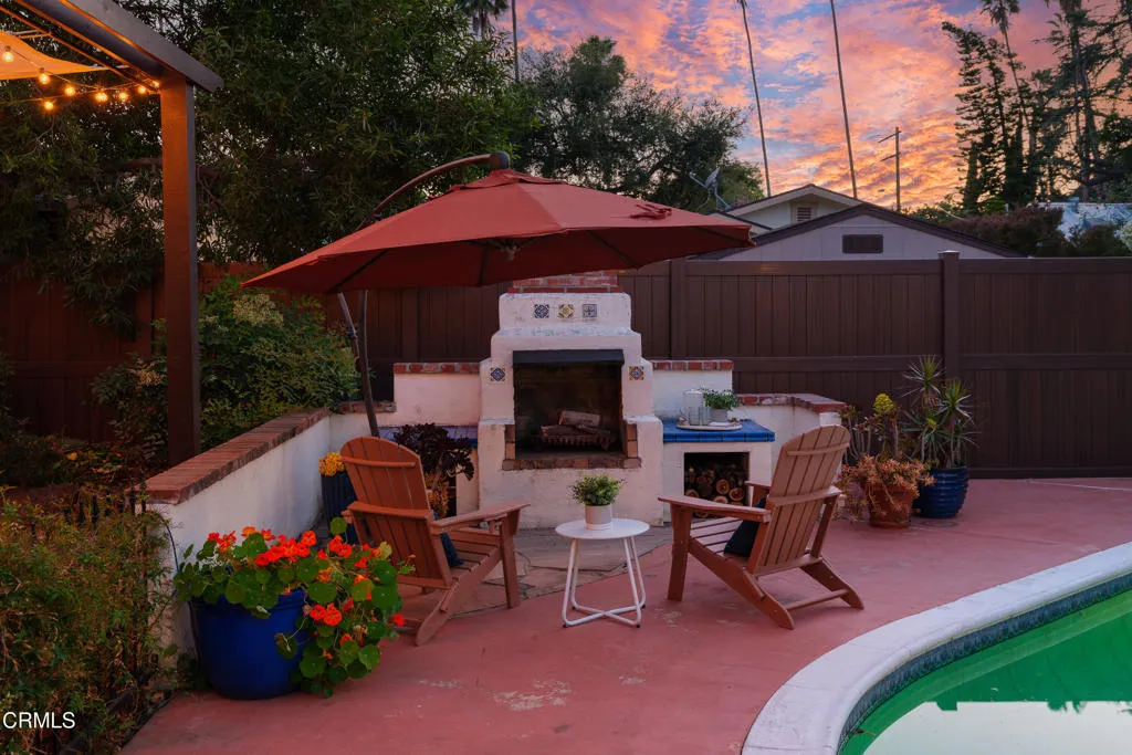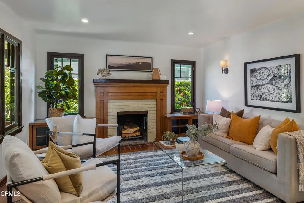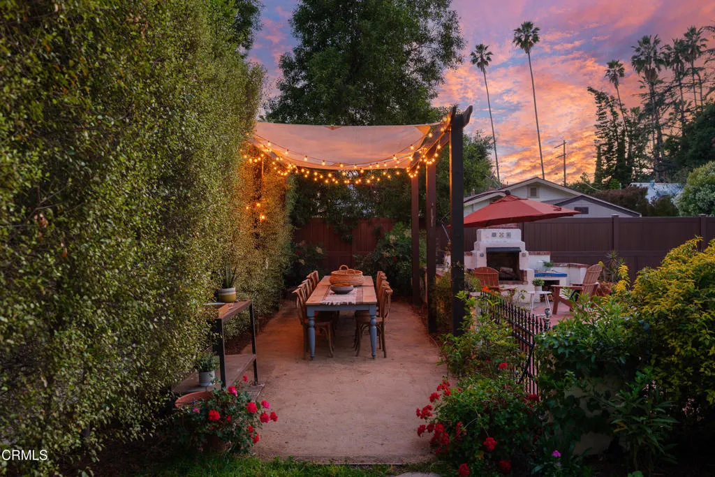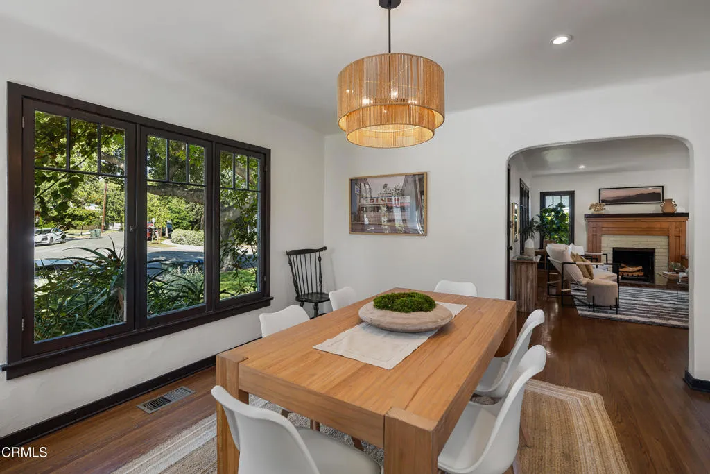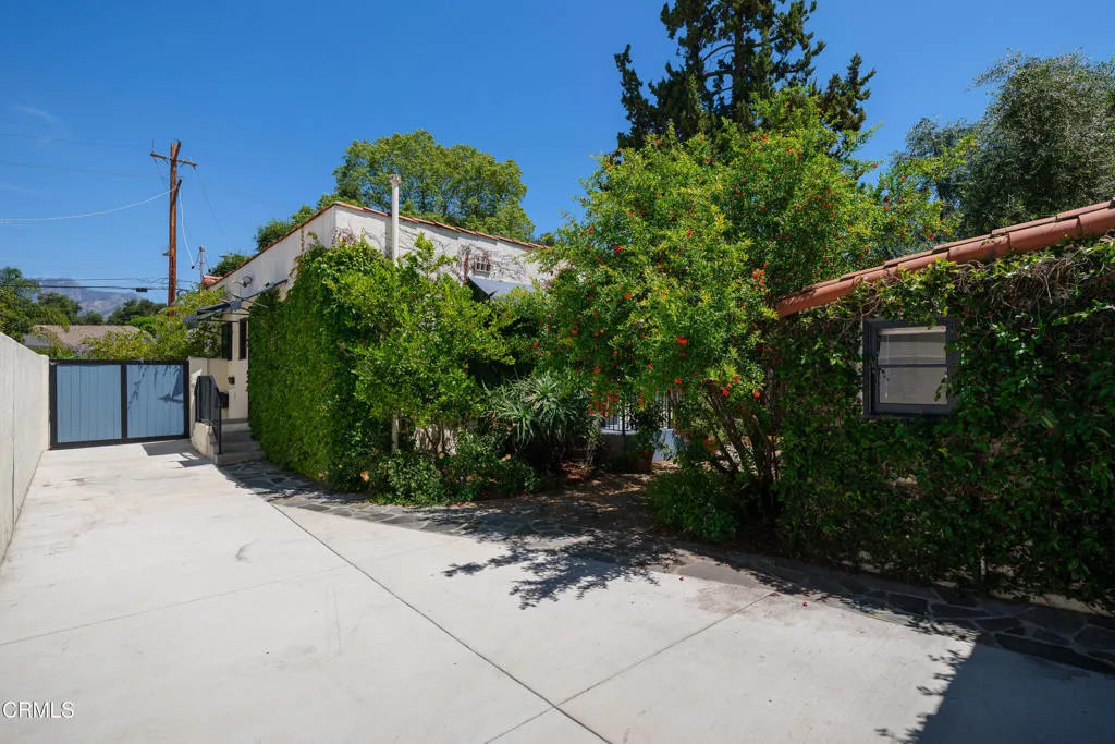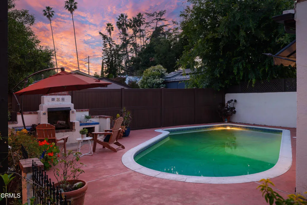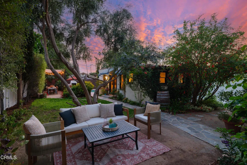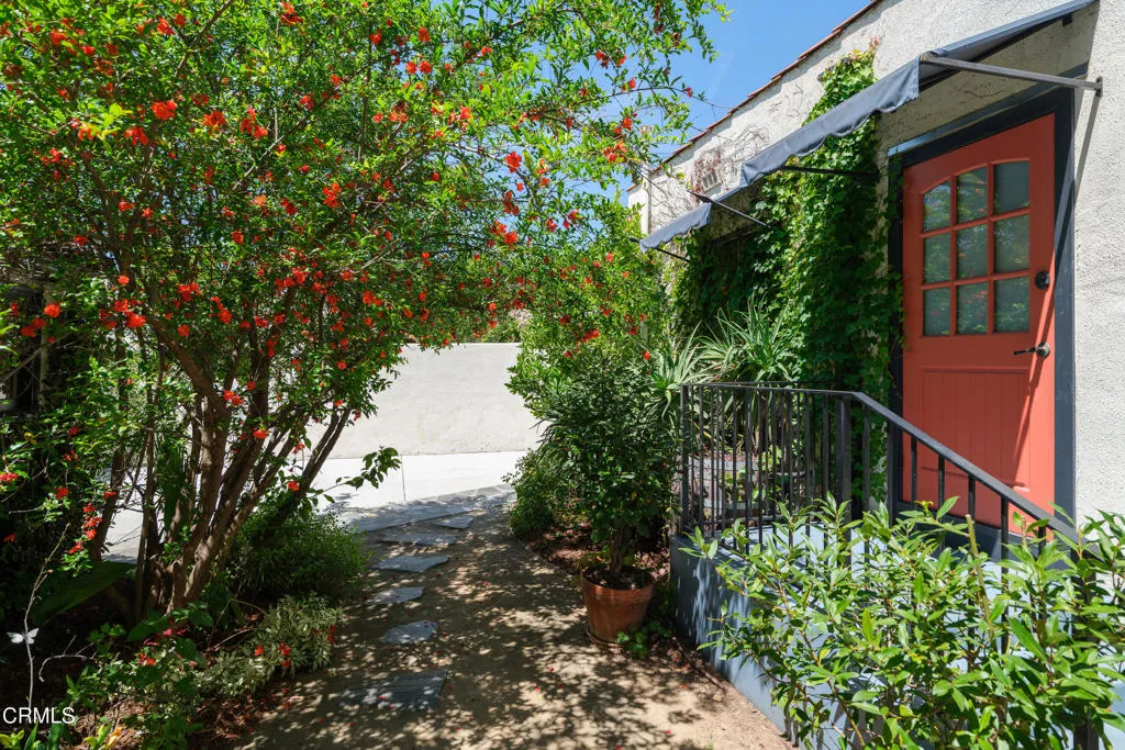 This beautiful three bedroom, two bath 1,454 square foot (as measured) Spanish, with an enchanting one bedroom, one bath, 356 square foot (as measured) accessory structure is absolutely picture-perfect. You enter the romantic residence via a welcoming front porch that steps into the elegant interior. The gorgeous living room features hardwood floors and a central decorative fireplace, flanked by custom rich wood, glass-fronted cabinetry that beckons you in. Additionally, there is an inviting formal dining room wrapped in windows that adjoins the impeccably remodeled kitchen with stainless steel appliances, an expansive peninsula with bar seating, quartzite counters, as well as a built-in desk or workspace. There are three bedrooms with plenty of storage, as well as two magazine-worthy renovated bathrooms. The back accessory structure has one bedroom, one bath, and a kitchenette. It has limitless possibilities and could be a fantastic office, guest abode, or entertainer's cabana as it is sited right off the pool. Other highlights at the property include designer fixtures, coved ceilings, arched doorways, gleaming hardware, and sumptuous marble tile. The home, which has incredible curb appeal, sits on a verdant 8,208 square foot lot filled with an abundance of blooming blossoms as well as native plants. It has a flower-lined front path surrounding the lush lawn that leads you to the gracious raised porch. The backyard, with a glistening pool, is a paradise that showcases the best of the California lifestyle. There are numerous spaces for relaxing beneath the stars, quiet refl