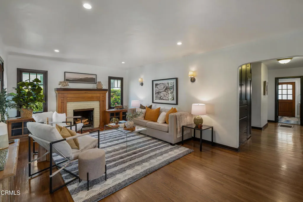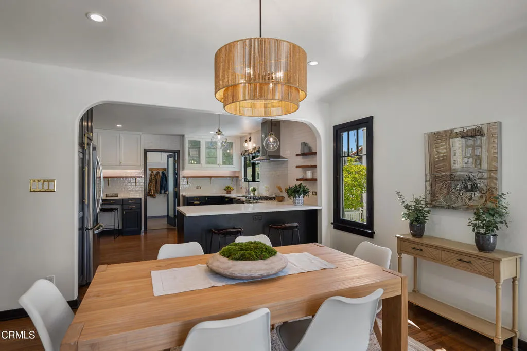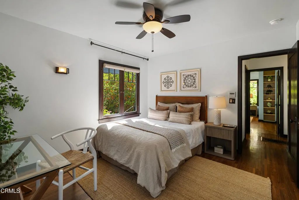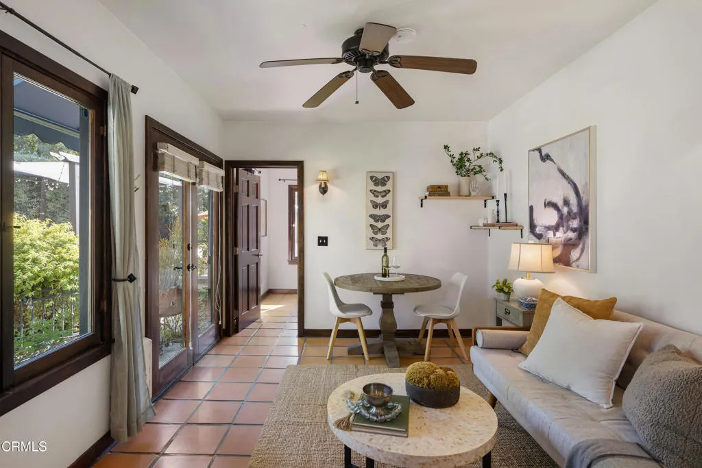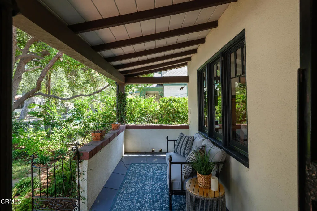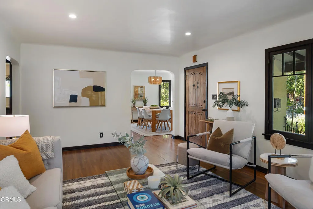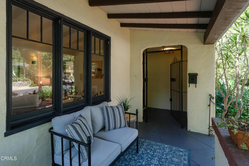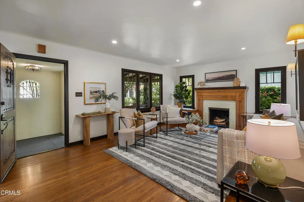This beautiful three bedroom, two bath 1,454 square foot (as measured) Spanish, with an enchanting one bedroom, one bath, 356 square foot (as measured) accessory structure is absolutely picture-perfect. You enter the romantic residence via a welcoming front porch that steps into the elegant interior. The gorgeous living room features hardwood floors and a central decorative fireplace, flanked by custom rich wood, glass-fronted cabinetry that beckons you in. Additionally, there is an inviting formal dining room wrapped in windows that adjoins the impeccably remodeled kitchen with stainless steel appliances, an expansive peninsula with bar seating, quartzite counters, as well as a built-in desk or workspace. There are three bedrooms with plenty of storage, as well as two magazine-worthy renovated bathrooms. The back accessory structure has one bedroom, one bath, and a kitchenette. It has limitless possibilities and could be a fantastic office, guest abode, or entertainer's cabana as it is sited right off the pool. Other highlights at the property include designer fixtures, coved ceilings, arched doorways, gleaming hardware, and sumptuous marble tile. The home, which has incredible curb appeal, sits on a verdant 8,208 square foot lot filled with an abundance of blooming blossoms as well as native plants. It has a flower-lined front path surrounding the lush lawn that leads you to the gracious raised porch. The backyard, with a glistening pool, is a paradise that showcases the best of the California lifestyle. There are numerous spaces for relaxing beneath the stars, quiet refl