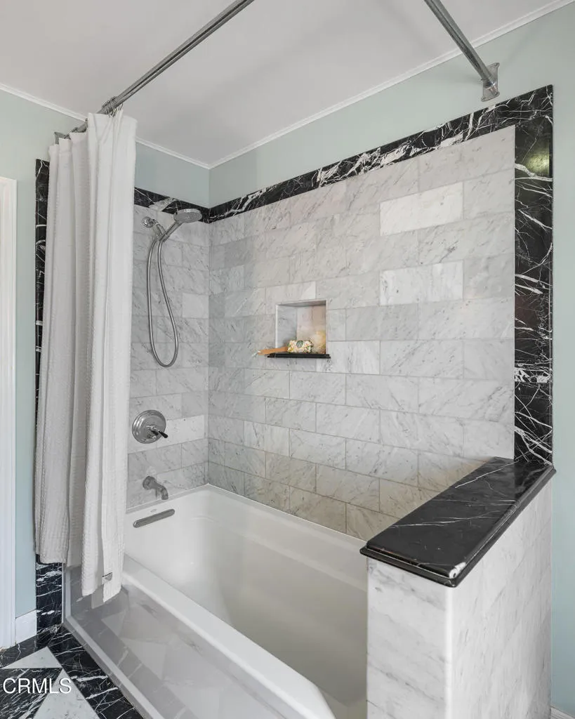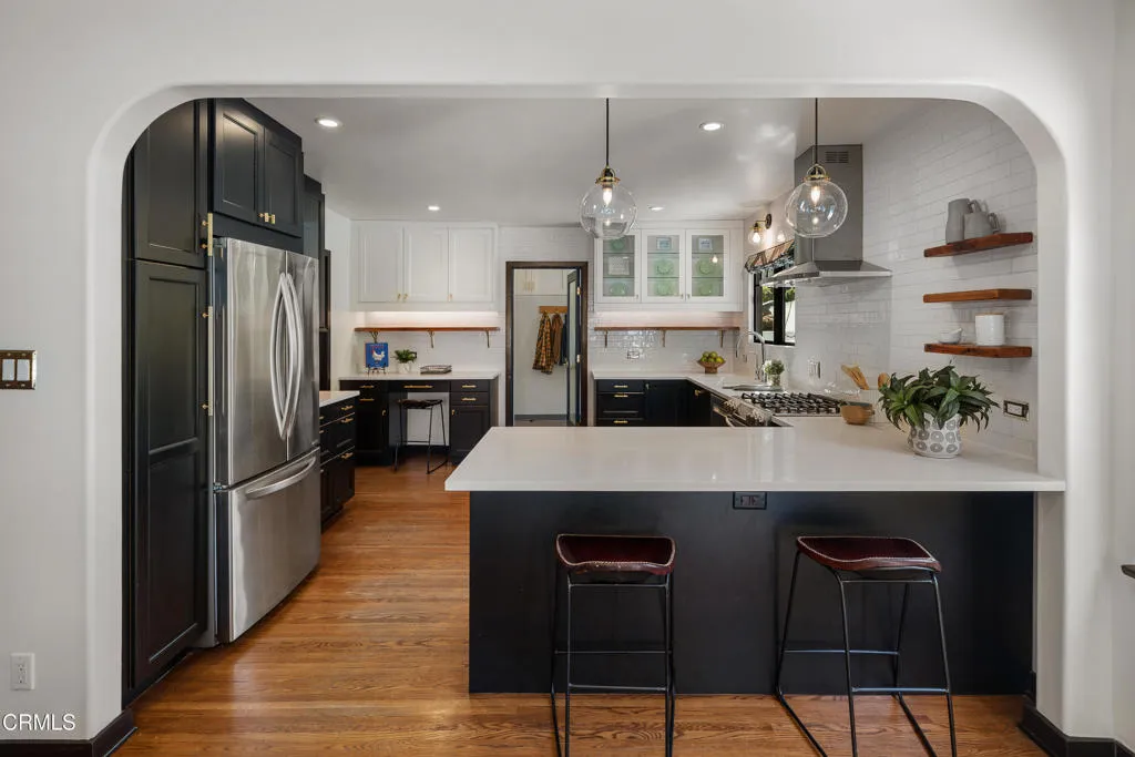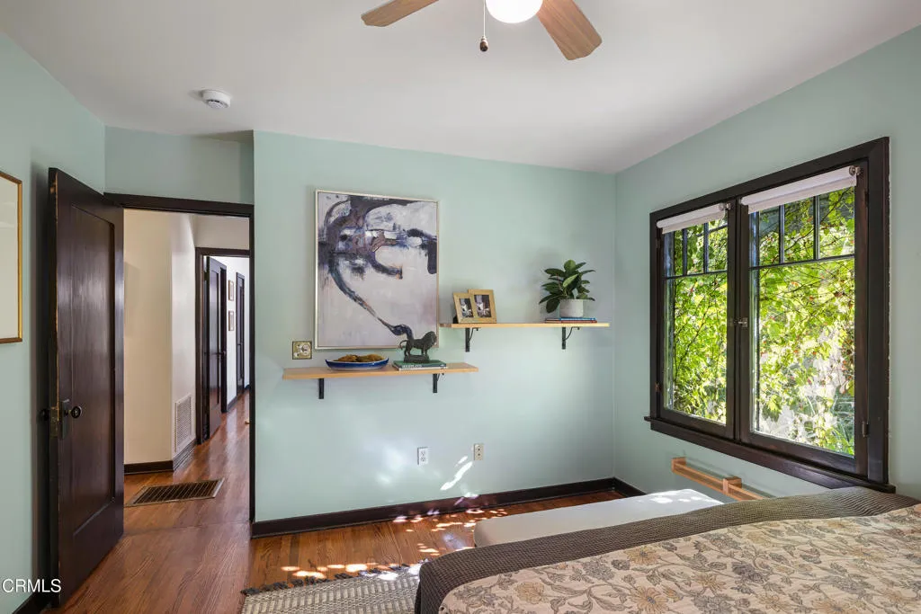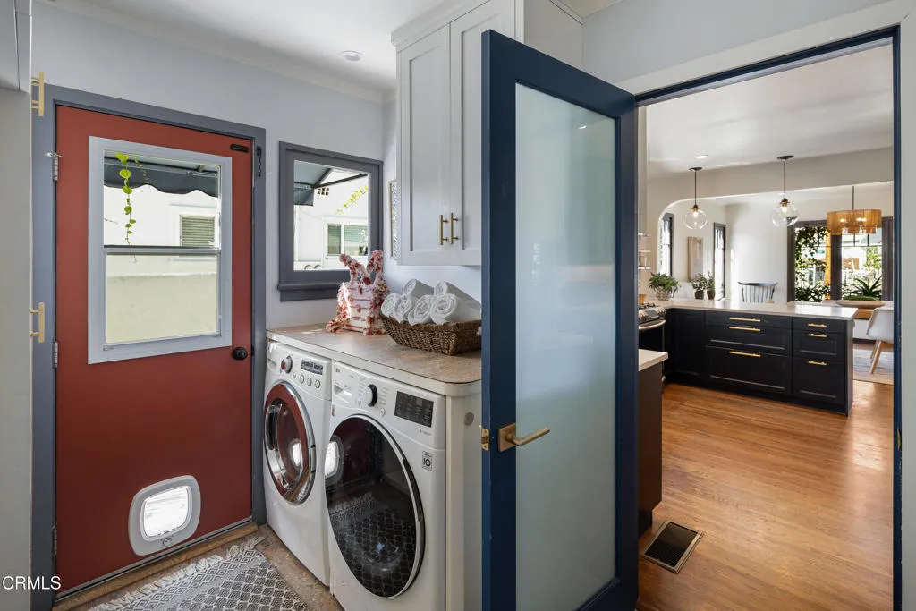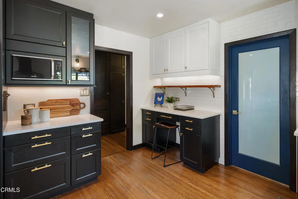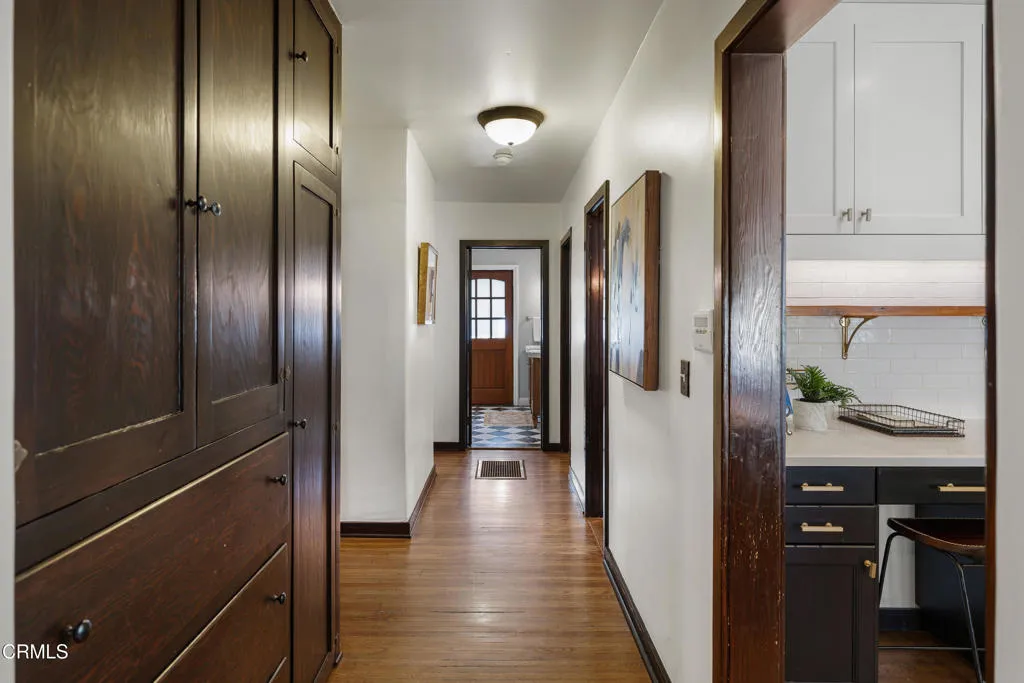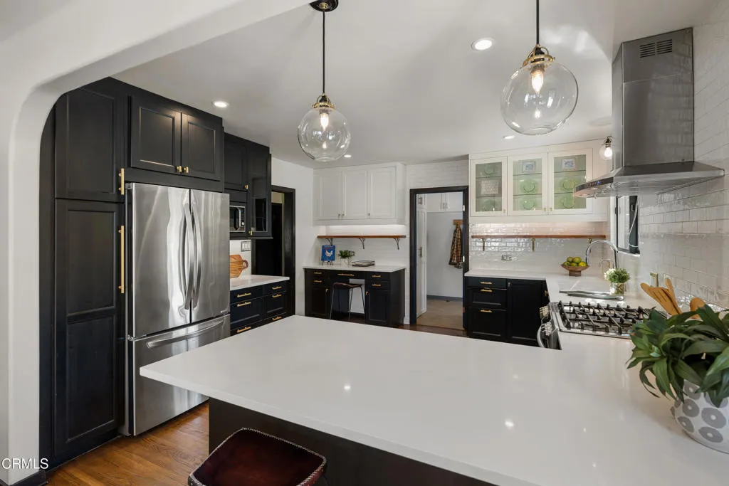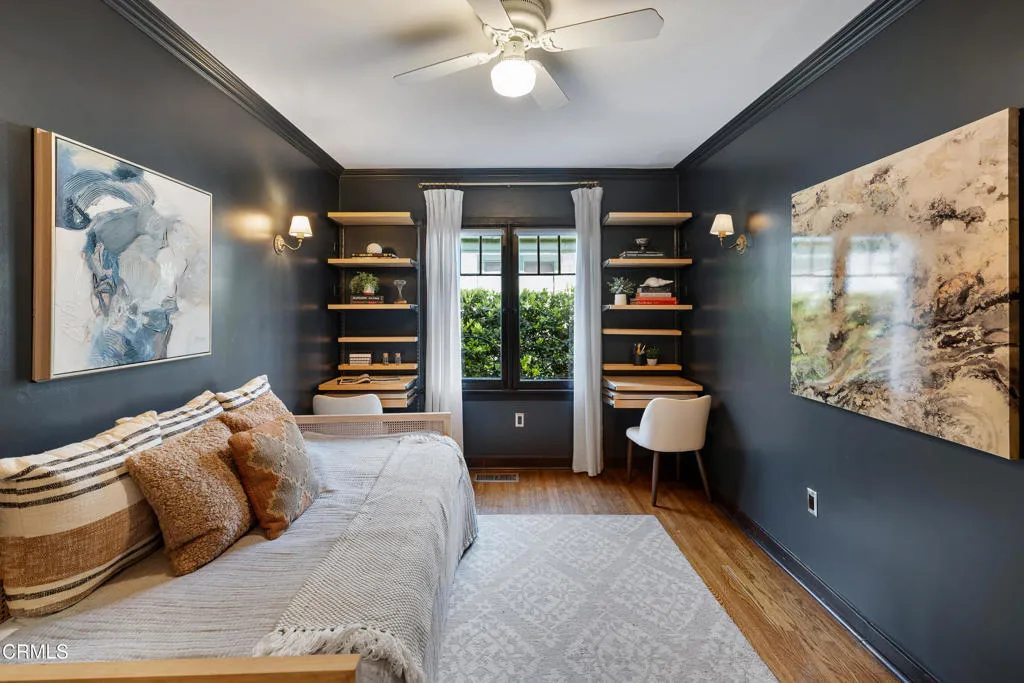 This beautiful three bedroom, two bath 1,454 square foot (as measured) Spanish, with an enchanting one bedroom, one bath, 356 square foot (as measured) accessory structure is absolutely picture-perfect. You enter the romantic residence via a welcoming front porch that steps into the elegant interior. The gorgeous living room features hardwood floors and a central decorative fireplace, flanked by custom rich wood, glass-fronted cabinetry that beckons you in. Additionally, there is an inviting formal dining room wrapped in windows that adjoins the impeccably remodeled kitchen with stainless steel appliances, an expansive peninsula with bar seating, quartzite counters, as well as a built-in desk or workspace. There are three bedrooms with plenty of storage, as well as two magazine-worthy renovated bathrooms. The back accessory structure has one bedroom, one bath, and a kitchenette. It has limitless possibilities and could be a fantastic office, guest abode, or entertainer's cabana as it is sited right off the pool. Other highlights at the property include designer fixtures, coved ceilings, arched doorways, gleaming hardware, and sumptuous marble tile. The home, which has incredible curb appeal, sits on a verdant 8,208 square foot lot filled with an abundance of blooming blossoms as well as native plants. It has a flower-lined front path surrounding the lush lawn that leads you to the gracious raised porch. The backyard, with a glistening pool, is a paradise that showcases the best of the California lifestyle. There are numerous spaces for relaxing beneath the stars, quiet refl