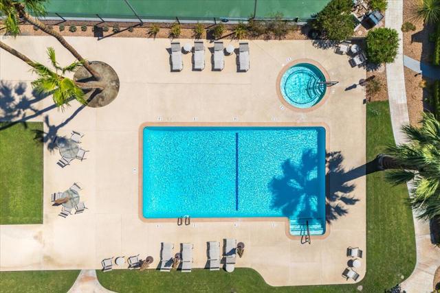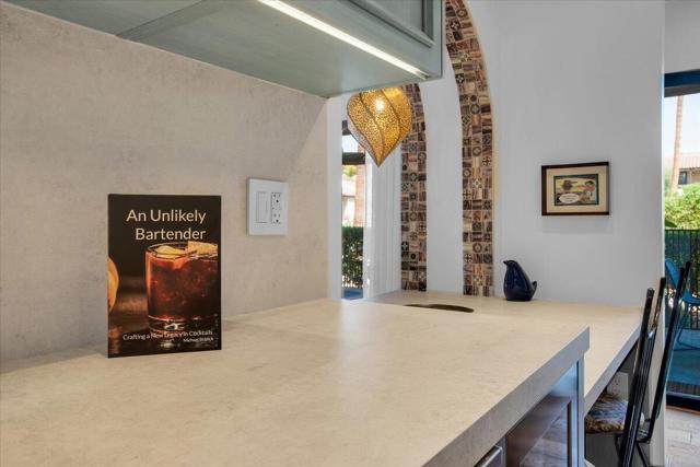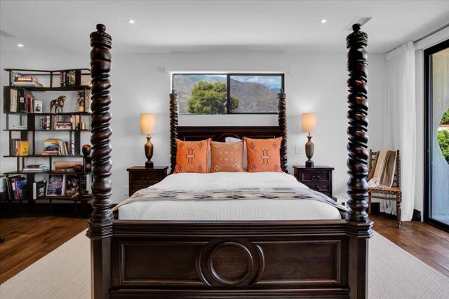 An exceptional find in the heart of iconic Palm Springs--downtown condo renovated into a sleek oasis fusing modern elegance with warm Mediterranean charm. Turnkey designer furnished. Unparalleled attention to detail. European oak flooring; Moroccan deco mosaic tile; layers of luxe finishes & exquisite fixtures; meticulous lighting design & controls; integrated entertainment systems; hand-selected antiques & art pieces; high-end appliances; custom cabinetry, counters, linens, rugs, window coverings...the upgrades are endless & seamlessly blend to transform this condo into a spectacular showcase of modern desert luxury. Breathtaking primary suite and bath. Luxurious soaking tub, plastered shower walls, bespoke wallpaper, accent tile & custom double sink vanity. Crafted walk-in closet. Floorplan reconfigured to take advantage of serene mountain/poolside views from practically every room. Appreciate epitome of an indoor/outdoor lifestyle via spacious front & back patios. Discover Center Court, a small complex of 20 units, with beautifully maintained landscaping and upgraded hardscape. Community pool/spa, tennis/pickleball courts & clubhouse round out this sophisticated offering. HOA includes gated entry, earthquake insurance, cable, internet, trash, water. FEE SIMPLE (you own the land). Truly move-in ready. Immerse yourself fully in the transformation via detailed digital download illustrating entire renovation & inventory of selections (available upon request).
