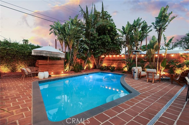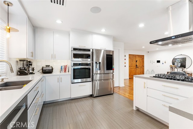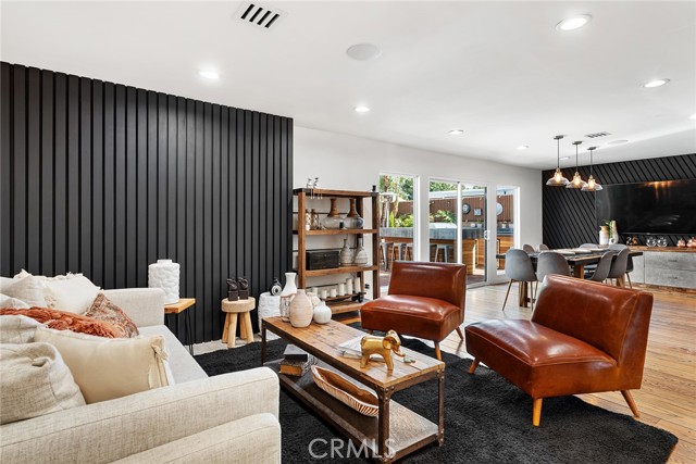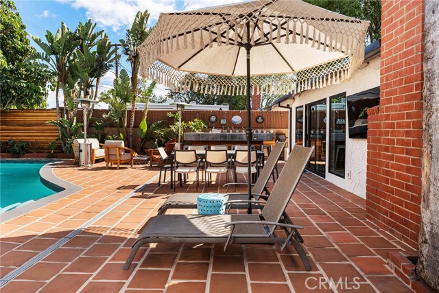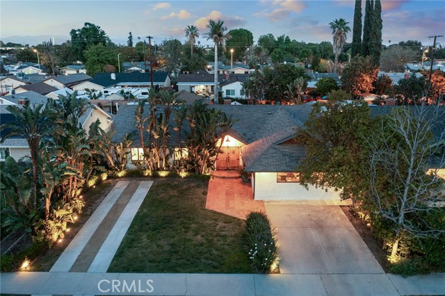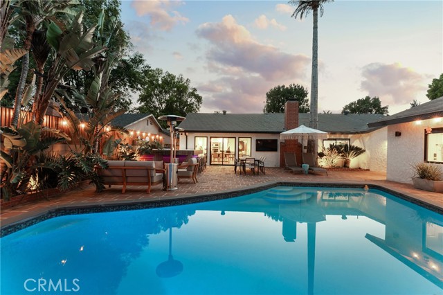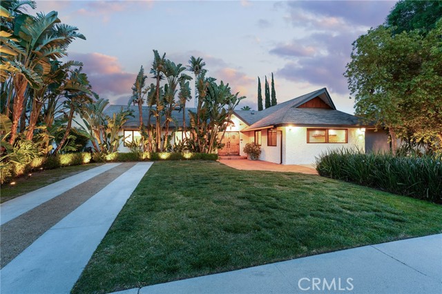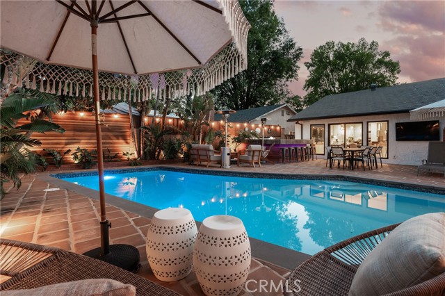 Sensational single story Spanish pool home with detached guest unit! Set back from the street with sprawling front yard with lush landscaping, grass lawn, long driveway, and second driveway ideal for RV/boat parking. A Saltillo tile pathway leads to the gorgeous double door entry. Step inside to find a completely open floor plan with designer finishes and custom details. An expansive entry foyer opens to the formal living and dining rooms featuring accent walls, oversized windows, real hardwood floors, and glass slider that opens to the backyard. The chef’s kitchen opens directly to the living spaces and boasts island with breakfast bar seating, quartz counters, soft close cabinetry, and stainless appliances. A separate large family room offers great versatility for additional flex space. There are four bedrooms in the main house including the luxurious primary suite featuring custom built-in closets and en-suite private remodeled bathroom with walk-in shower. The three secondary bedrooms each have closets with custom built-ins. A spacious remodeled hall bathroom has dual sinks and and walk-in shower. There is another full bathroom also ideal for guest use with designer tiling and walk-in shower. A separate laundry/mud room area has custom storage cabinetry. The detached guest unit is approx. 450 SF and features bedroom studio with closet, living space, kitchenette with fridge and sink, and en-suite bathroom with walk-in shower. The super private entertainer’s backyard is a true tropical oasis boasting sparking swimming pool, built-in gas fire pit, BBQ center with refrigerators and cement wraparound counter with bar seating, spacious patio adorned with Saltillo tiling, large storage room, and lush landscaping with twinkle lights that create the ultimate vacation ambiance. The property also features per seller: Control 4 smart home automation for music and lighting, Ring alarm system, security cameras, as well as brand new roof. Ideally located adjacent to dining/shopping at the Westfield Mall & Village, Warner Center, and Topanga Canyon.
