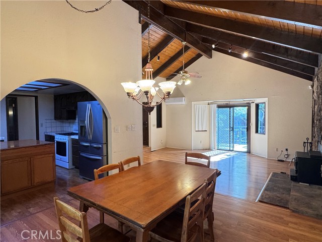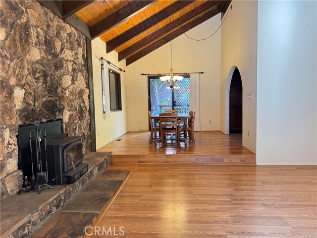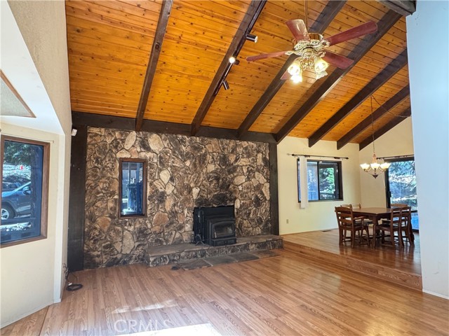 Welcome to this charming mountain retreat nestled in the Lower Rowco neighborhood of Running Springs. This home features 3 bedrooms and 3 bathrooms with an open floorplan perfect for comfortable living and entertaining. Enjoy cozy mountain evenings by the stone wall wood-burning stove and stay cool all summer with the split-unit air conditioning. The spacious layout offers plenty of natural light and a seamless flow between the living, dining, and kitchen areas, ideal for relaxing or hosting family and friends. Enjoy this flat useable lot with tons of parking and storage. Perfectly located in a wonderful neighborhood with easy year-round access. This home offers the perfect blend of peaceful mountain living and modern convenience. Your mountain lifestyle awaits, and so close to Snow Valley Ski Resort plus SkyPark at Santa's Village!