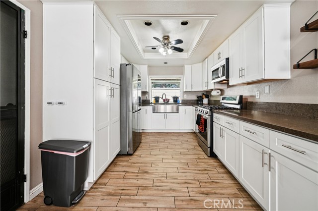 Welcome to 1925 S Starfire — a beautifully updated 3-bedroom, 2-bath home located in the heart of Corona! Step inside and feel right at home in the inviting living room featuring wood-look tile flooring, plantation shutters, a ceiling fan, and a cozy fireplace that creates the perfect atmosphere for relaxing evenings. The remodeled kitchen is a true highlight — showcasing quartz countertops, modern cabinetry, stainless steel appliances, recessed lighting, and a ceiling fan. The open layout connects seamlessly to the family room, making it ideal for entertaining or enjoying gatherings with family and friends. Large sliding glass doors fill the space with natural light and provide easy access to the backyard. Down the hallway, you’ll find the spacious primary suite with cathedral ceilings, a ceiling fan, and private sliding doors that open to the covered patio. The primary bathroom offers granite countertops, a vanity area, and a walk-in shower. Two additional bedrooms (one also with cathedral ceilings) and a hall bath with a granite-topped vanity and shower/tub complete the interior living spaces. A large enclosed patio offers flexible use — perfect for a game room, home gym, or additional lounge area. Outside, enjoy a peaceful backyard featuring two storage sheds, wide side yards, and a covered patio with a balcony — a wonderful spot to sip your morning coffee or unwind with a good book. Additional highlights include a two-car garage plus driveway parking for three, and a solar panel system for energy efficiency. Conveniently located near top-rated schools, shopping, dining, entertainment, and freeway access — this home truly has it all.