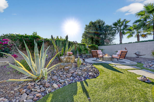 Welcome to refined desert living in this beautifully appointed Hideaway floor plan, ideally located on a premium privacy lot in Phase 3 of the premier 55+ community, Sun City Shadow Hills. Conveniently located near the Santa Rosa Clubhouse - just a short 5 minute walk! Built in 2012, this 2-bedroom plus den/office, 2-bath home spans 1,512 sq. ft. (EST.) of comfortable sophistication on a privacy lot designed for tranquility and entertaining. The heart of the home is the stylish kitchen--featuring gleaming granite countertops, rich wood cabinetry, stainless steel appliances, a breakfast bar, and abundant storage. Perfectly positioned to overlook the spacious dining area and great room, this open-concept design invites effortless gatherings and warm conversation. Elegant tile flooring extends through the main living areas, while plush carpeting creates cozy comfort in the bedrooms. The versatile den includes a built-in Murphy bed, ideal for guests or a quiet home office. Step outside to your private desert oasis with an extended patio, alumawood cover, retractable awning, built-in barbecue, and inviting fire pit--perfect for relaxing evenings under the stars. The desert landscaping with artificial turf offers low-maintenance beauty and sweeping southwestern mountain views. Additional features include an evaporative cooler in the garage for added comfort. Residents of Sun City Shadow Hills enjoy resort-style amenities including two clubhouses, championship golf courses, fitness centers, pools, spas, pickleball and tennis courts, and a variety of social clubs for every interest! Experience the perfect blend of comfort, style, and vibrant community living--where every day feels like a getaway.
