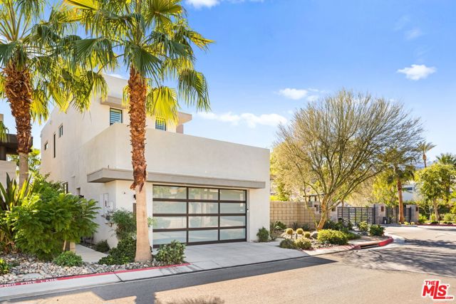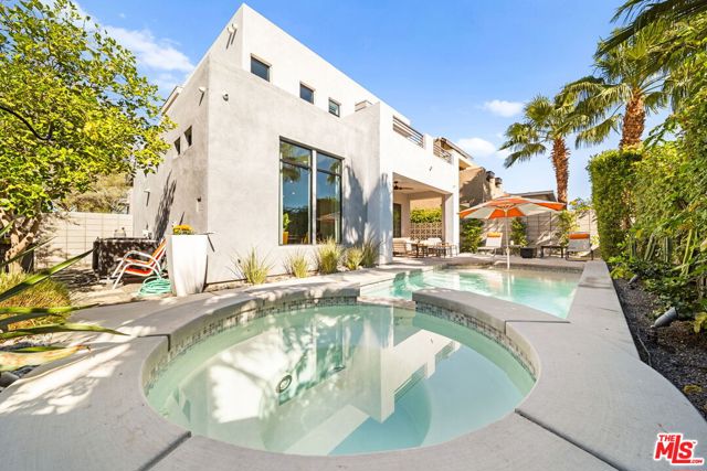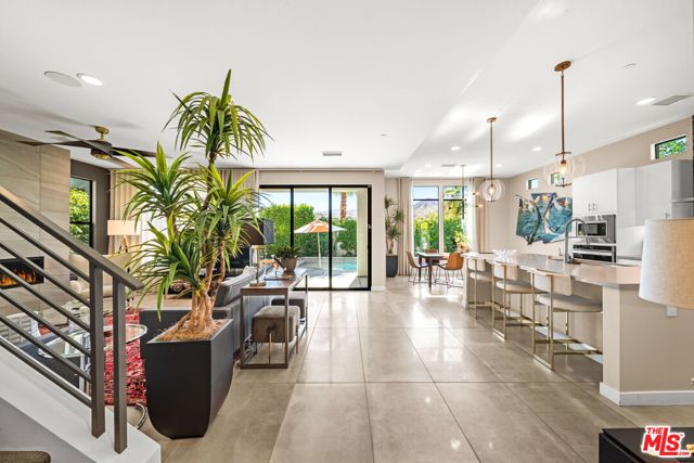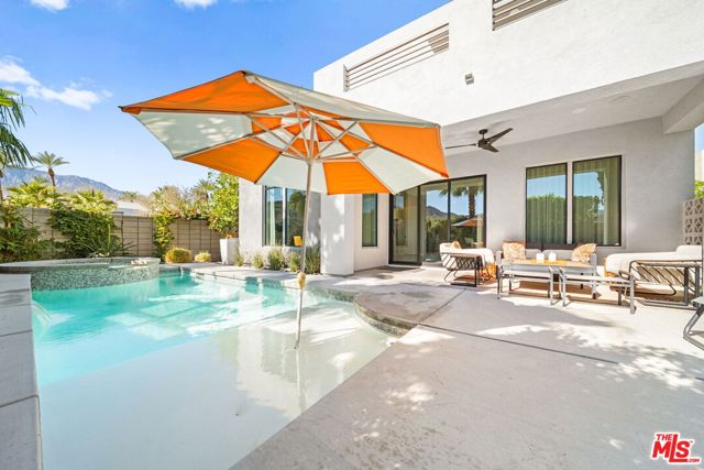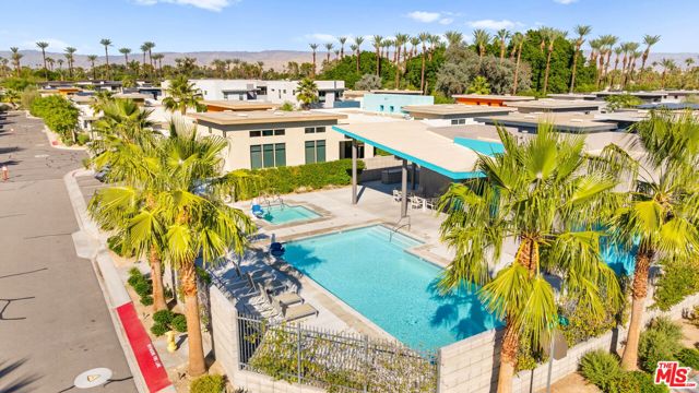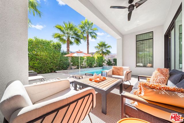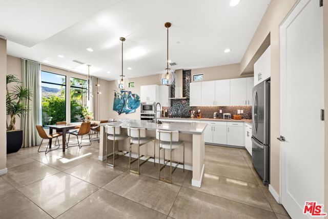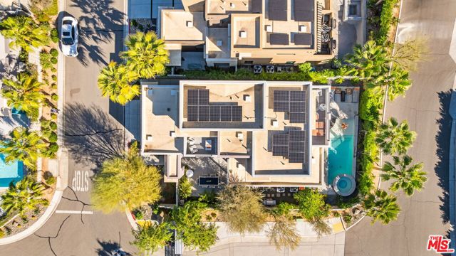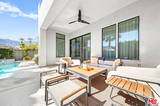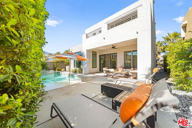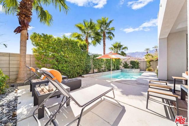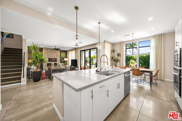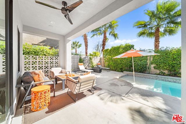 Welcome to the 67655 Chelsea Road inside the District East and one of the largest lots in the community featuring the Tribeca floor plan. Included with this former model unit are three bedrooms and three bathroom and nearly 2,100 sq. ft. of living space, in-ground pool and spa, owned solar, fireplace, and a large 2 car garage with ample storage. There are four distinct outdoor living spaces which include an outdoor fire feature, fountain, dining areas and offer spectacular mountain views. This move-in ready home features an open concept living space, distinct dining area, breakfast bar, quartz countertops, stainless steel appliances, ceramic tile flooring on the primary level and upstairs in the bathrooms and laundry room; all bedrooms are carpeted. There is a large bedroom and shared bathroom with shower on the ground floor, and two bedrooms with private bathrooms upstairs. The living room is highlighted by telescoping doors which open to the pool and offer the new owner that indoor/outdoor living ideal. The home is an end unit home and is also located within a pedestrian friendly distance of many shops, restaurants and grocery stores. In addition, the community includes a dog park, fitness & community center, pool and spa. This is a truly unique home inside District East and we look forward to seeing you!