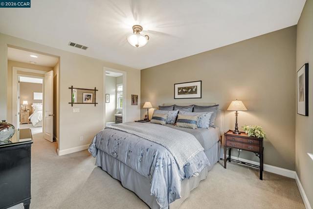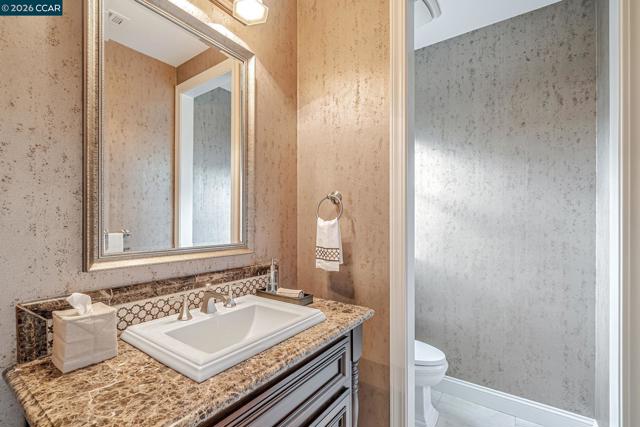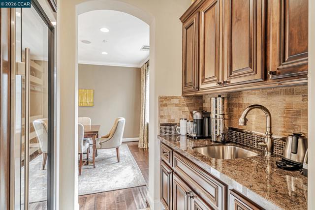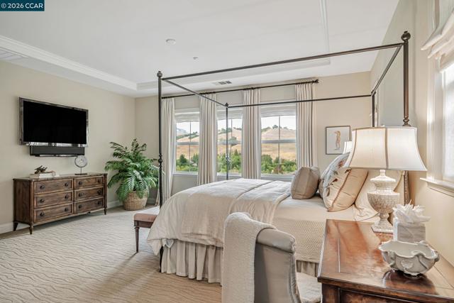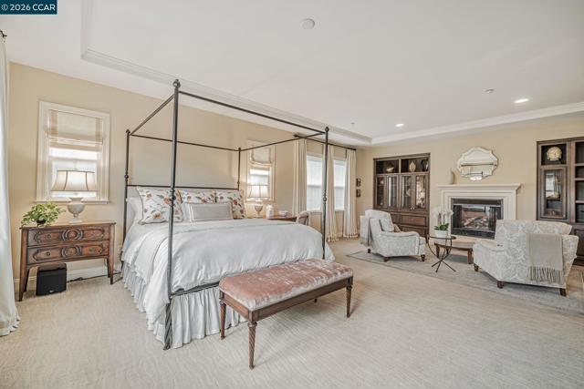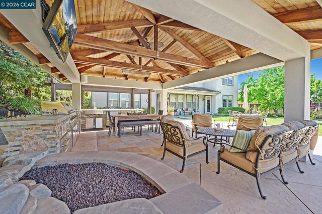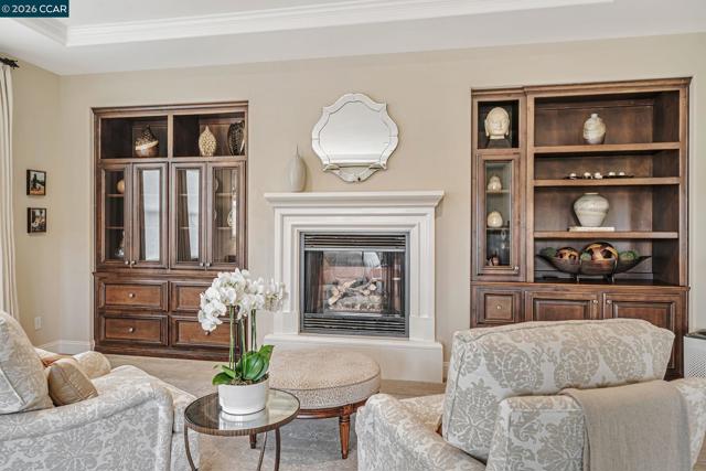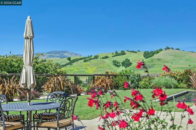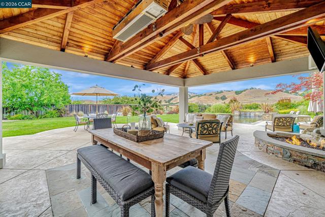 This breathtaking two-story estate offers 6 bedrooms, 6.5 baths, and resort-style luxury in one of Danville’s most coveted neighborhoods. Enter to soaring ceilings, abundant natural light, rich cherry hardwood floors, crown molding, built-in speakers, refined custom finishes and a full security system. To the left, an elegant formal living room with a white mantel and gas fireplace; to the right, a sophisticated den with custom cherry built-ins, ideal for a home office. The chef’s kitchen features a grand island, sumptuous cherry cabinetry, stainless steel appliances with a six-burner stove, and a butler’s pantry with wine fridge opening to an expansive dining room. The lavish primary suite showcases stunning Mt. Diablo views, a spa-like bath with soaking tub, dual vanities, walk-in shower, and a massive custom walk-in closet. Step outside to a private courtyard with fireplace and a fully equipped in-law suite with kitchen, bath, balcony, and separate entry. The entertainer’s backyard dazzles with panoramic Mt. Diablo views, a heated saltwater pool, spa, bocce court, garden beds, and a peaceful fountain. The outdoor kitchen is a chef’s dream with built-in grill, fireplace, warming drawers, fridge, dishwasher, and sink—perfect for luxurious outdoor living.