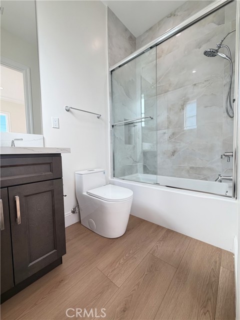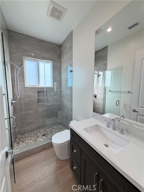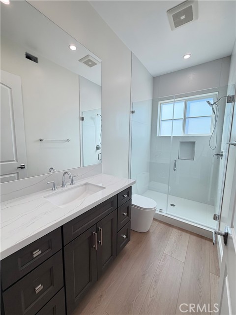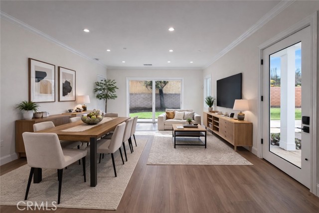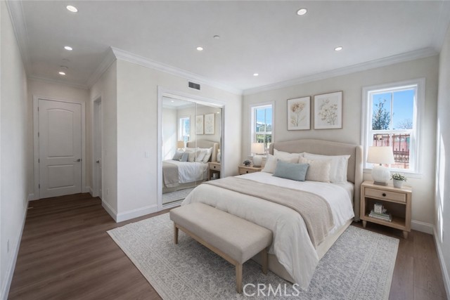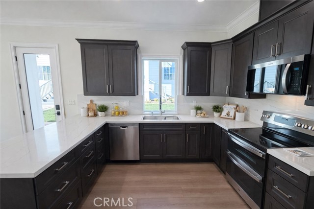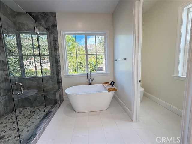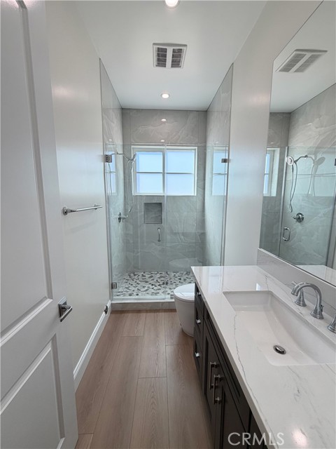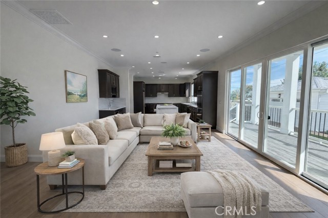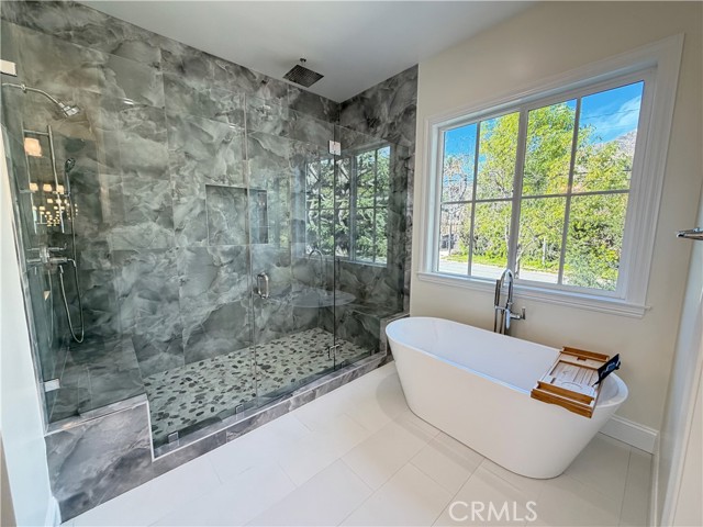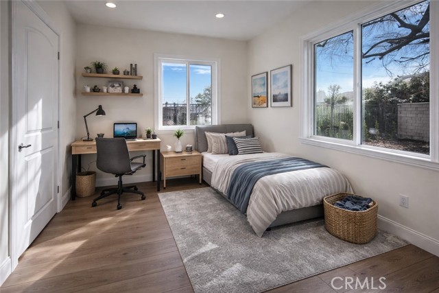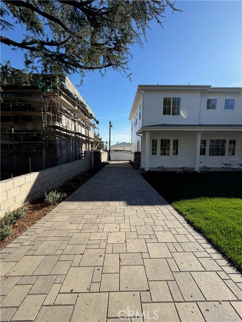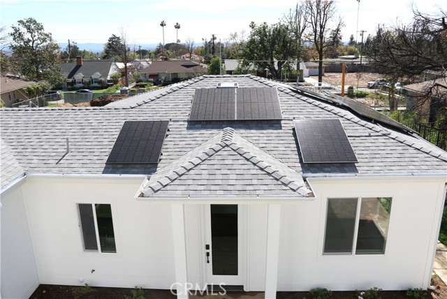 Welcome to this exceptional transitional Craftsman residence, meticulously rebuilt following the 2025 Eaton Fire with an emphasis on modern efficiency, safety, and refined living. The home is fully electric and energy-efficient, featuring owned solar panels with battery storage and separate HVAC systems for each level to ensure optimal comfort year-round. The interior offers a thoughtfully designed open-concept floor plan with recessed lighting, waterproof vinyl flooring, and dual-glazed thermal windows throughout. The kitchen is equipped with quartz countertops, solid wood cabinetry, LG appliances, a double oven, a spacious island with bar seating, and a wet bar with a built-in beverage center. A large walk-in pantry provides abundant storage, while built-in surround sound enhances the kitchen, family room, and dining areas. The formal living room is distinguished by high ceilings, an electric fireplace, and custom built-in shelving and cabinetry. A solid wood staircase with wrought-iron detailing adds architectural elegance and leads to a gallery. Bathrooms are finished with scratch-resistant porcelain tile, bidet toilets, built-in handheld fixtures, and frameless or semi-frameless glass enclosures. One upstairs bathroom includes a bathtub well-suited for families, while the primary suite features a spa-inspired bathroom with a freestanding soaking tub and a rainfall shower with handheld. All bedrooms are pre-wired for televisions and include closets with built-in shelving. The primary suite offers two walk-in closets, one featuring a center island, 2 separate vanities in the master bath and balcony access. The detached garage is equipped with an electric vehicle charging port and is complemented by an adjacent ADU with separate power metering and its own laundry hookups, ideal for guests, rental income, or extended living. The front and rear grounds are professionally landscaped with drip irrigation, uplighting, and designated space for a garden. For enhanced security and peace of mind, the home is pre-wired for security cameras, includes a built-in alarm system, fire sprinklers, and fire-resistant siding. Block fencing borders the sides, and newly installed wrought-iron fencing with maturing ficus trees enhances privacy in the backyard. Situated in a neighborhood undergoing active revitalization, with many surrounding properties already under reconstruction, this home presents an opportunity to be part of a forward-progressing community.