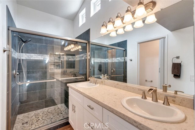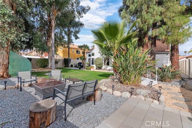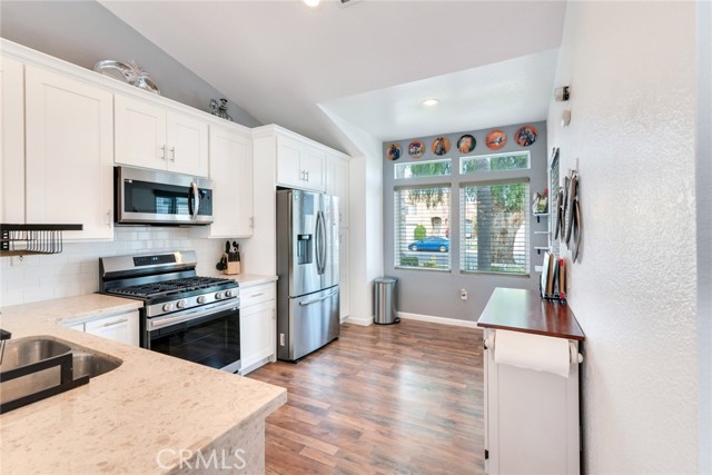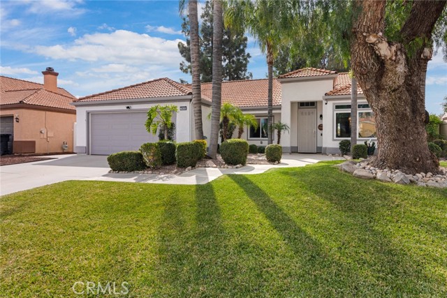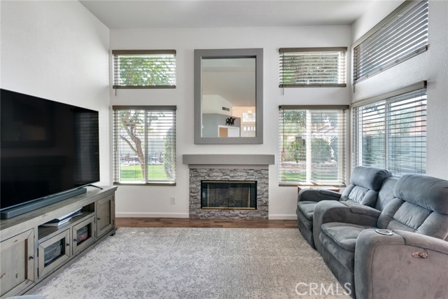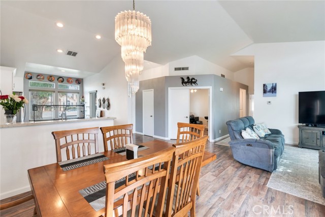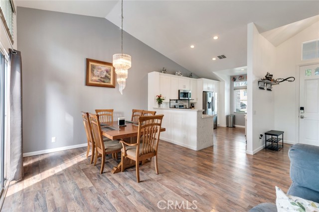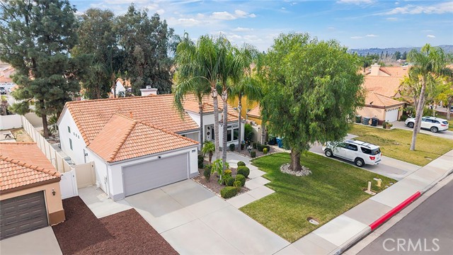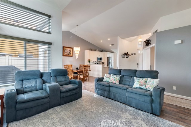 Welcome to this beautifully updated single-story home featuring soaring vaulted ceilings and an open, light-filled floor plan. This 3-bedroom, 2-bath residence offers laminate wood flooring throughout the main living areas and a spacious 2-car garage with direct access. The remodeled kitchen features white cabinetry, quartz countertops, subway tile backsplash, stainless steel appliances, recessed lighting, and a breakfast bar that opens to the dining and living areas, ideal for everyday living and entertaining. The inviting living room showcases dramatic ceiling height, clerestory windows, and a stylish fireplace. The spacious primary suite includes direct backyard access through new sliding doors and an upgraded en-suite bath with dual vanities and a beautifully tiled walk-in shower. Extensive recent upgrades include all new interior and exterior paint, new dual-pane windows throughout, new sliding glass doors, brand new HVAC with ducting and professionally installed LeafFilter gutters surrounding the home with a 50-year warranty. Step outside to an expansive, park-like backyard with mature trees, lush grass, patio space, and vinyl fencing, offering privacy and plenty of room to entertain or relax. With low taxes and no HOA or Mello-Roos, this move-in ready home is a rare opportunity