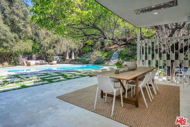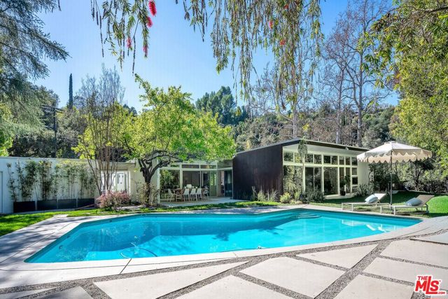 Designed by renowned architect James W. Larson, AIA, in 1957, this classic mid-century architectural retreat is privately set in the Encino hills on over half an acre of serene, natural surroundings. The residence beautifully embodies the defining elements of mid-century design clean horizontal lines, expansive walls of glass, seamless indoor-outdoor integration, and an effortless sense of elegance and flow.A lush front courtyard welcomes you to a dramatic double-door entry, opening into a refined living environment highlighted by hand-polished cement floors, rich hardwood accents, a striking stone fireplace, Fleetwood doors, and expansive floor-to-ceiling and clerestory windows that bathe the home in natural light. The spacious kitchen offers abundant wood cabinetry, quartz countertops, and premium stainless steel appliances by Miele and Wolf, combining functionality with modern sophistication.The resort-style backyard is ideal for entertaining and relaxation, featuring beautifully landscaped grounds, a saltwater pool, sundecks, a covered patio, and a tranquil hillside meditation and yoga studio. This exceptional property is a rare fusion of architectural artistry, timeless design, and elevated indoor-outdoor living.