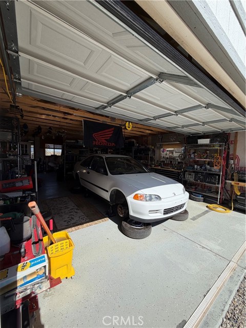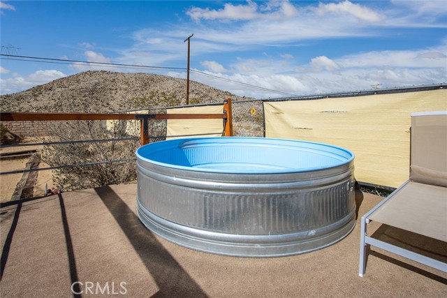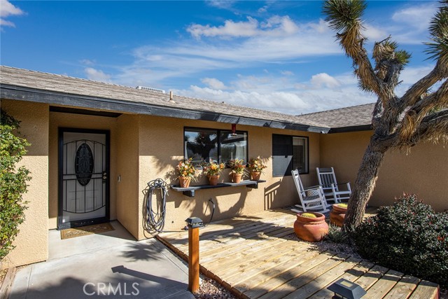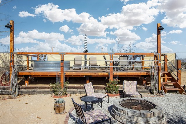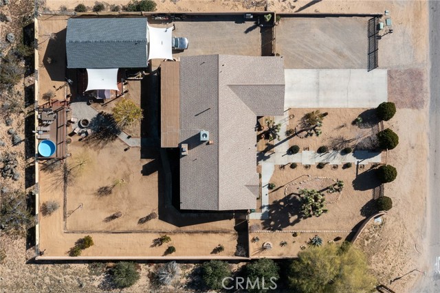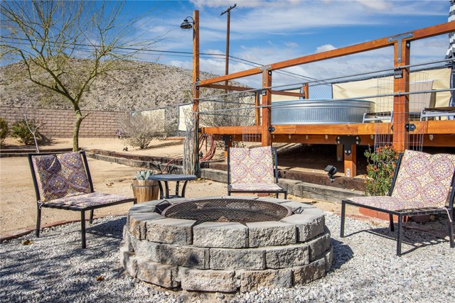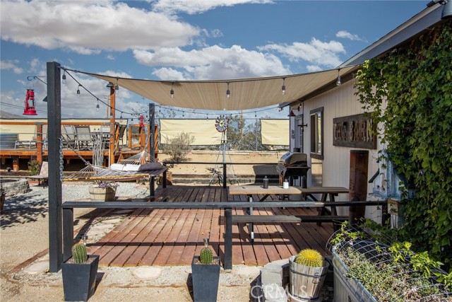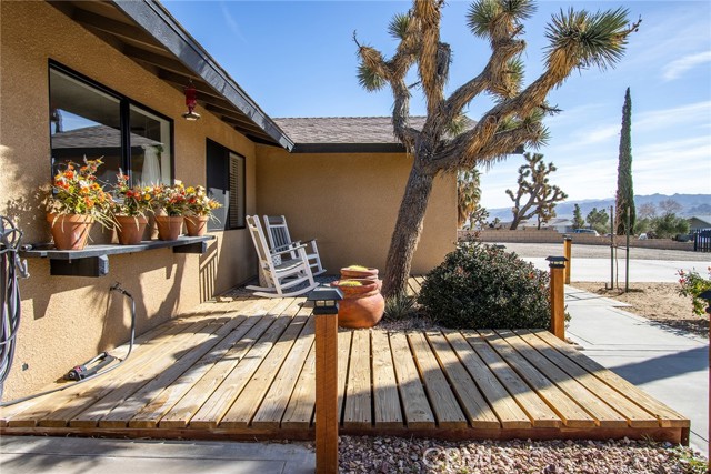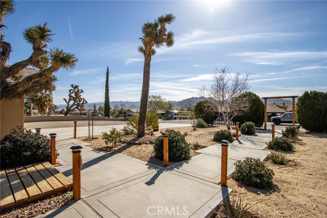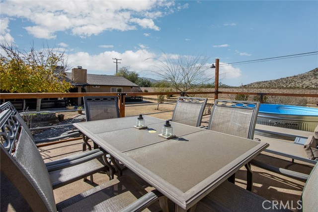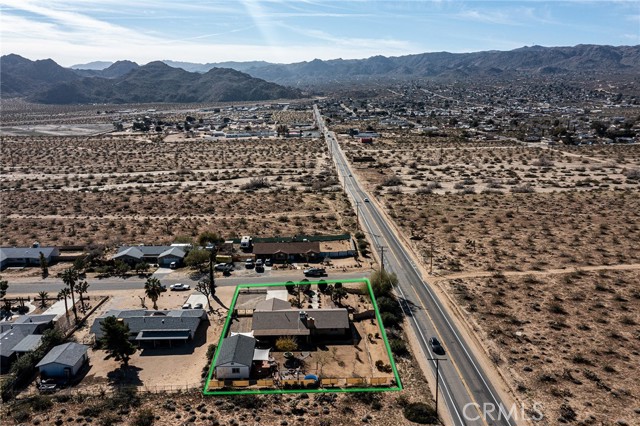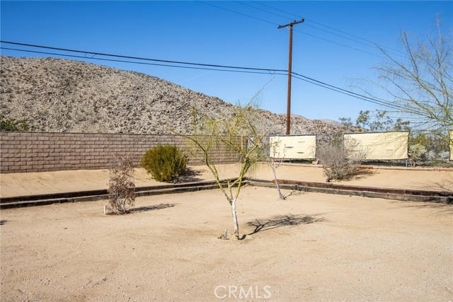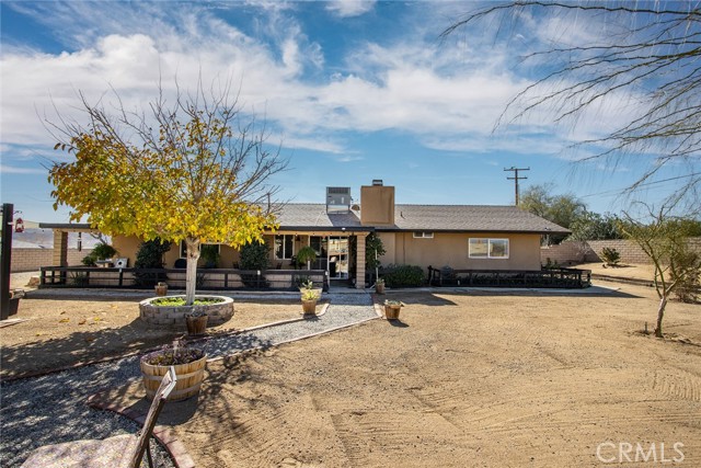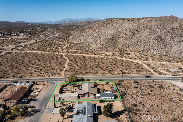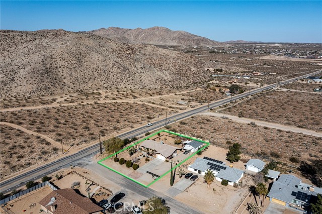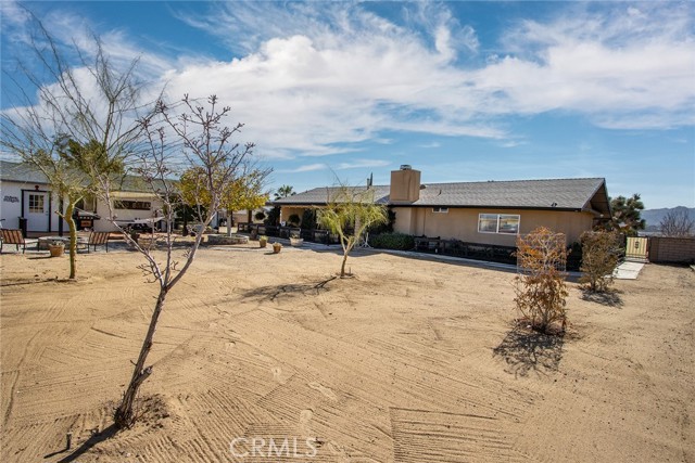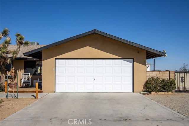 Large three-bedroom, two-bath home with an attached two-car garage and an additional detached 700 sqft garage, situated on a spacious corner lot in Joshua Tree. This fully fenced property has been beautifully landscaped in both the front and backyard, offering privacy, functionality, and impressive curb appeal. As you arrive, you’ll notice the mature landscaping, large concrete driveway, and drive-thru gate providing ample space for RV storage or additional toys. Block wall privacy fencing enhances the yard, while a concrete walkway leads you to the front door where a newly built deck captures gorgeous views of Joshua Tree National Park and downtown Joshua Tree. Inside, you are welcomed by a remodeled kitchen featuring newly finished cabinets, updated backsplash, stainless steel appliances, generous storage, and abundant counter space. The large living room offers plenty of space for gathering and includes a cozy gas & wood-burning fireplace. The home features a split floor plan with a spacious primary bedroom that includes two closets and an ensuite bathroom with a large dual-sink vanity, ample storage, and a beautifully remodeled walk-in shower with modern tile finishes. The two additional bedrooms are well-sized with plenty of closet storage, and the second bathroom is conveniently located with a shower-tub combo and all the essentials. The backyard is packed with amenities designed for enjoyment and entertaining. A very large covered patio provides shaded outdoor living space, while a standalone deck offers room for seating and currently accommodates a cowboy pool, all with phenomenal mountain views. Additional features include a fire pit area, mature shade trees, a hammock space, and another shaded deck. The 700 sqft detached garage offers extra storage and includes a sectioned-off area currently used as a man cave. RV hookups are also in place. This home features dual cooling with both central HVAC and a ducted evaporative cooler. Truly turnkey and ready to go, this property offers an exceptional location close to downtown Joshua Tree, the entrance to Joshua Tree National Park, and everything the area has to offer.