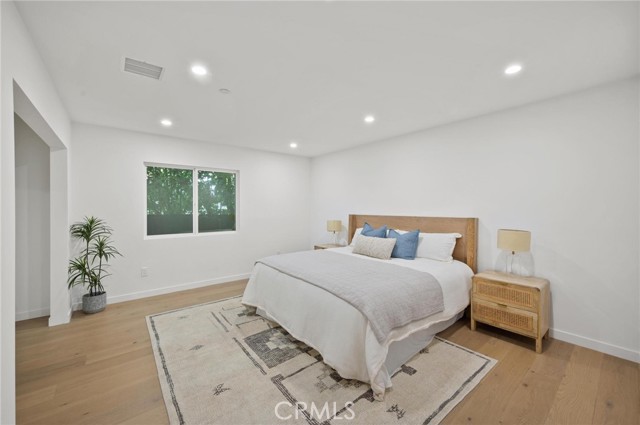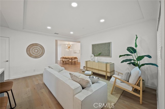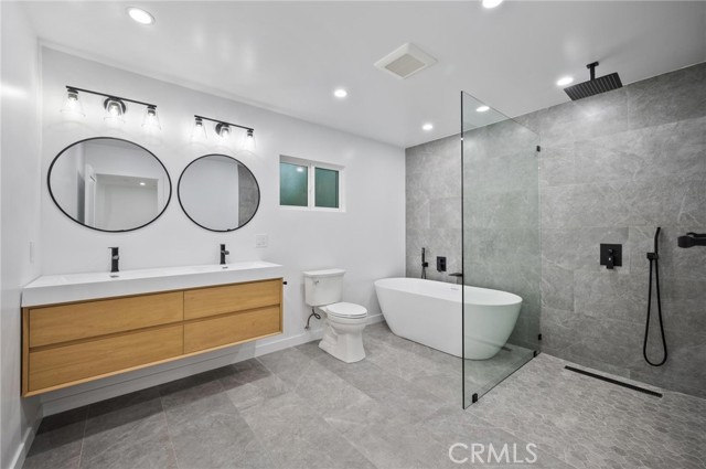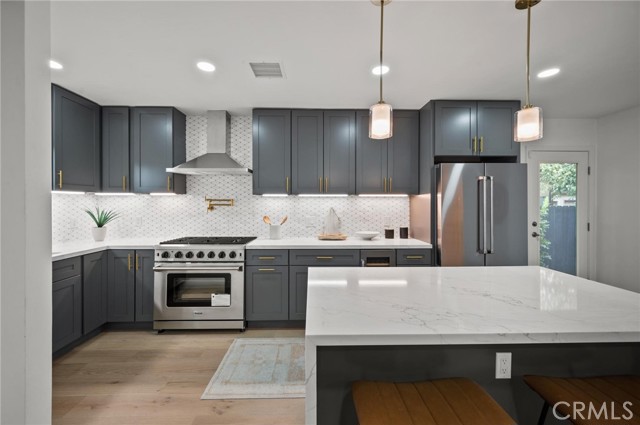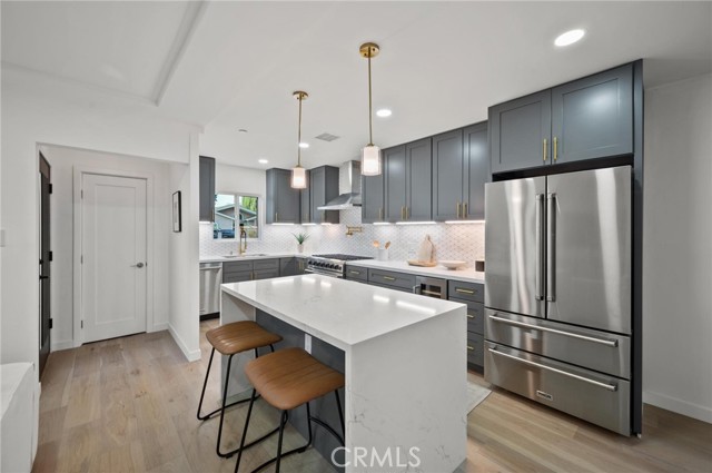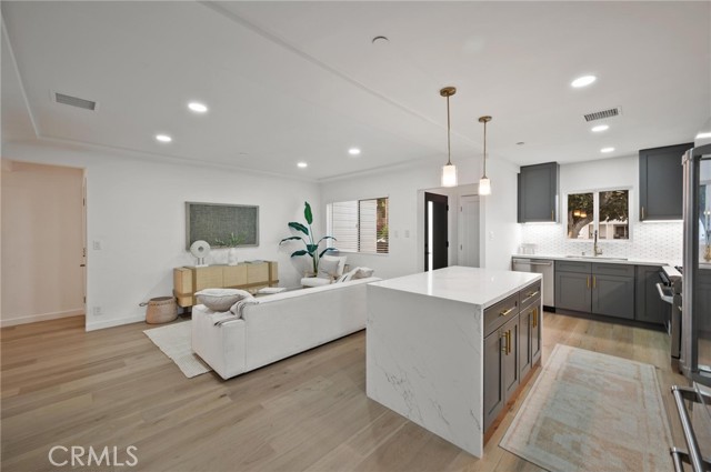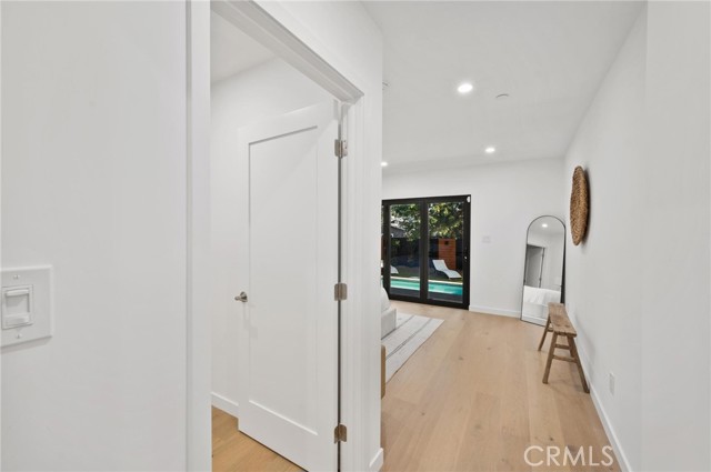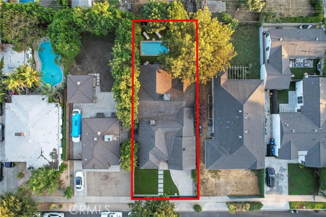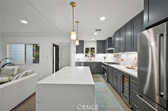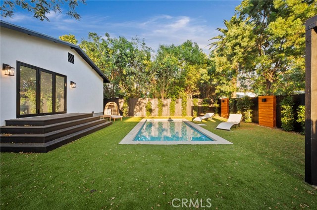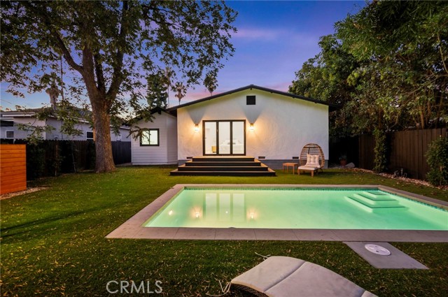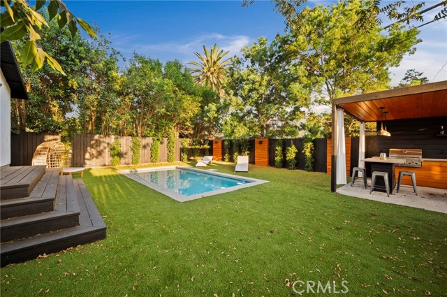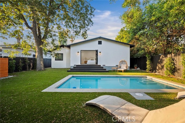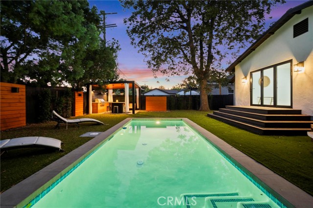 Tucked away on a lush, tree-filled lot, this modern retreat offers the perfect balance of privacy and resort-style living. A remote-controlled iron gate opens to reveal a beautifully reimagined 5-bedroom, 4-bathroom home showcasing timeless design and high-end upgrades throughout. Inside, the open-concept floor plan is anchored by White Oak hardwood floors and a sleek designer kitchen with quartz countertops, under-lit cabinetry, matching Thor appliances, and a built-in three-temperature wine refrigerator. The expansive primary suite overlooks the serene backyard and features a spacious walk-in closet along with a spa-inspired ensuite highlighted by dual sinks and a curb-less, zero-entry shower. Three additional designer bathrooms echo the same attention to detail with walk-in showers and luxury finishes. Step outside to your private paradise: a brand-new sparkling pool shaded by mature trees and complemented by a resort-style cabana. Designed for entertaining, the cabana is complete with an outdoor kitchen, built-in Spires BBQ, dual-temperature wine fridge, mounted TV, overhead lighting, and a cozy fire pit. Recent upgrades provide peace of mind, including a new roof, HVAC system, water heater, all-new copper and PEX plumbing, smooth stucco exterior, stamped concrete driveway, and low-maintenance synthetic turf in both the front and back yards. A rare blend of sophistication, comfort, and modern California living, this home is a true retreat designed for both relaxation and entertaining.