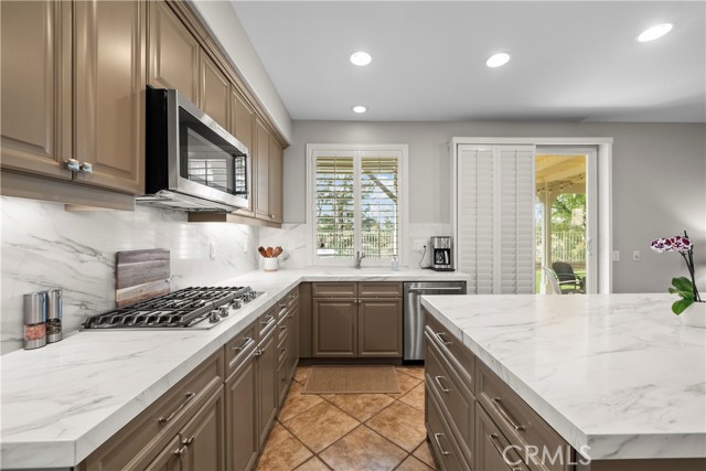 Welcome to 23552 Vale Court in Valencia’s desirable North Park neighborhood. This home is situated on a small cul-de-sac with a great sized yard with no rear neighbors, and views of the sunset. It is a beautifully maintained 4 bedroom, 4 bathroom home with a bright open floor plan. The home features a formal living room and dining room, a spacious family room with fireplace that flows seamlessly into the recently updated kitchen. The kitchen is equipped with stunning quartz countertops and backsplash, new stainless steel appliances, double ovens, and a large center island with seating. Upstairs hosts 4 bedrooms and this includes both the expansive primary suite with a private balcony overlooking the backyard and scenic views, along with a generous secondary suite featuring a walk-in closet and ensuite bath, perfect for guests or flexible living. The oversized backyard is ideal for both relaxation and play, offering a large grassy area, no rear neighbors, and privacy. Additional highlights include a 3-car garage with epoxy floors, newer HVAC system, and the spacious downstairs laundry room. Enjoy North Park’s low HOA dues with wonderful amenities including three pools, tennis and basketball courts, and a clubhouse, all conveniently located near Valencia’s paseos, shopping, schools, and dining, and no Mello-Roos tax. This move-in ready home is a wonderful opportunity to enjoy the very best of Valencia living!