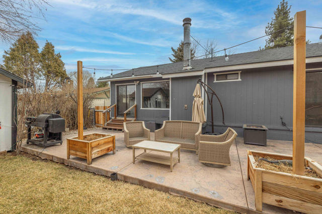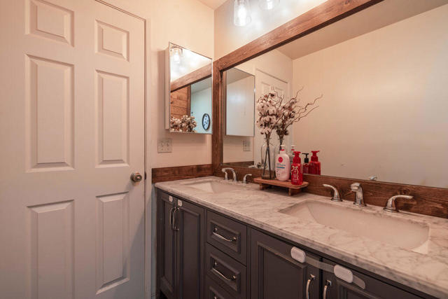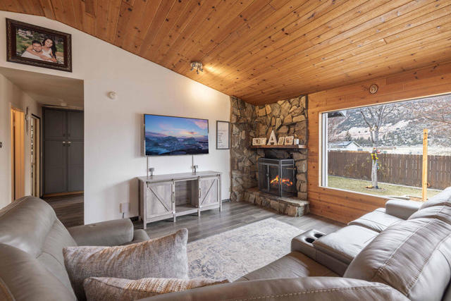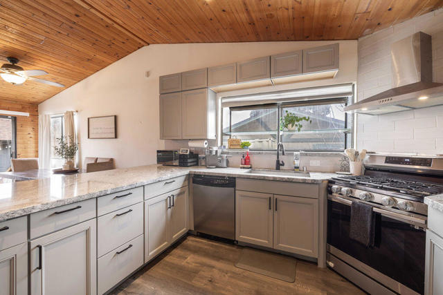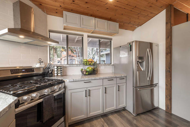 Charming and beautifully remodeled 2-bedroom, 2-bath mountain retreat located in a desirable Big Bear City neighborhood! This inviting home features a large open great room with vaulted ceilings that create a bright and spacious feel throughout the living and kitchen areas. The remodeled kitchen offers granite countertops, stainless steel appliances, and plenty of workspace--perfect for entertaining or everyday living. Both bathrooms have been tastefully updated, and low-maintenance laminate flooring runs throughout the home. Cozy up to the wood-burning fireplace on cool mountain evenings. Recent upgrades include a newer roof, newer water heater, and forced air natural gas heating for year-round comfort. The landscaped yard backs to vacant land, providing added privacy and a peaceful setting. Fenced front and back yards offer space for pets and outdoor enjoyment. Additional highlights include a 2-car attached garage, large stamped concrete driveway with ample parking, and a convenient storage shed. Whether you're looking for a full-time residence, mountain getaway, or investment opportunity, this well-maintained property checks all the boxes.