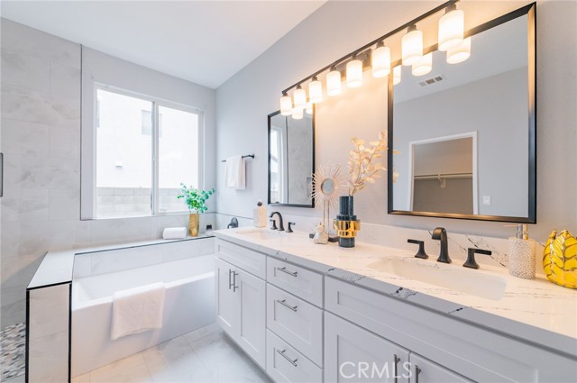 Tucked at the end of a quiet cul-de-sac, this inviting two-story home welcomes you with a charming front porch and a layout designed for both everyday comfort and easy entertaining. The spacious primary suite is conveniently located on the main level and features a separate dressing area, a walk-in closet, dual-sink vanity, an oval soaking tub, and a separate walk-in shower—your own private retreat. Upstairs, you’ll find four additional bedrooms plus a central bonus/game loft—perfect for a playroom, media space, homework hub, or second lounge. Downstairs offers both a formal living and dining combination for special gatherings, along with an open family room and kitchen at the rear of the home where everyone can come together. Cozy up by the gas fireplace or open the slider to enjoy indoor-outdoor living. The kitchen is well-appointed with a center island sink, built-in stainless steel microwave and oven, stainless dishwasher, and a gas range, with tiled counters and flooring for easy upkeep. Step outside to a private backyard enclosed by block wall and wood fencing—ideal for relaxing, entertaining, or letting pets play. Additional conveniences include an indoor laundry room with direct access to the three-car garage, welcome home