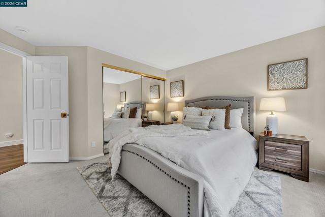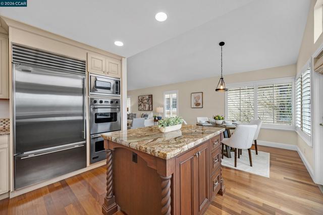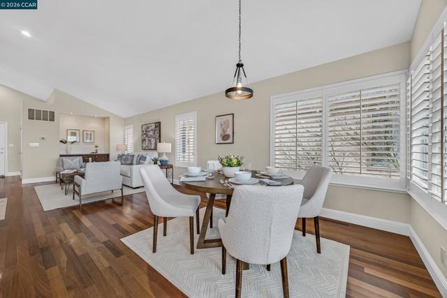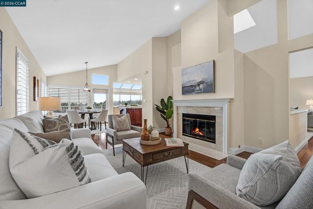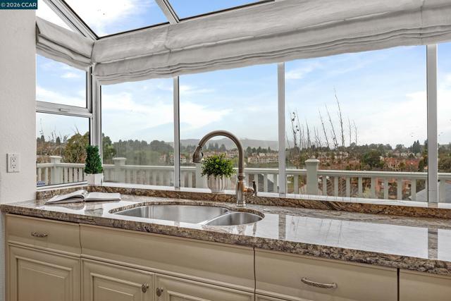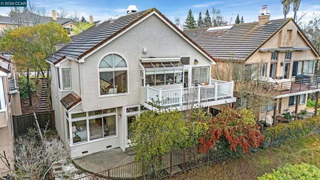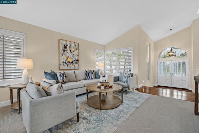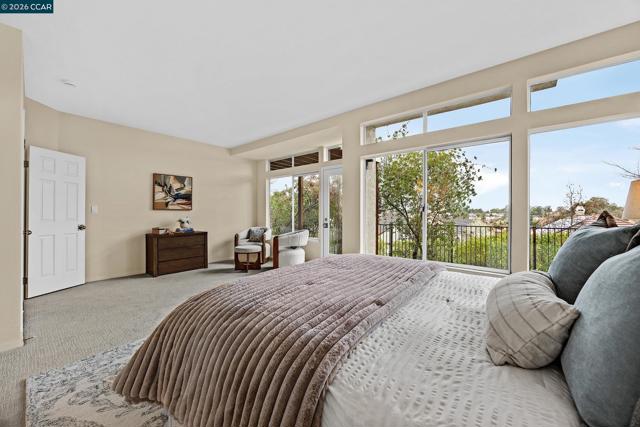 Inside the gates of Canyon Lakes, 425 Donner Way sits on a quiet street. Step into the formal living and dining with soaring ceilings and plenty of natural light. The updated kitchen has a Viking gas stove, double oven, and built-in microwave and a Sub Zero fridge. Just off the breakfast nook is a balcony looking out to picturesque views of the hills and lake. A family room is conveniently located next to the kitchen and breakfast nook. A powder room and access to your two car garage round out the main level. Downstairs, two spare bedrooms share a well-appointed hall bathroom with a dual sink vanity and a shower over tub. Next to the bathroom is the laundry room with plenty of cabinetry and a sink. Tucked at the back of the home is the primary suite - spacious and looking out onto its own private patio, which is partially covered by the balcony upstairs. The primary bathroom offers a dual sink vanity plus makeup vanity in the middle, a soaking tub, stall shower and walk-in closet. New carpeting and fresh paint throughout the home, as well as new light fixtures! HOA amenities include tennis/sport courts, pools and a gym. A beautifully maintained public golf course is also inside the gates of Canyon Lakes.