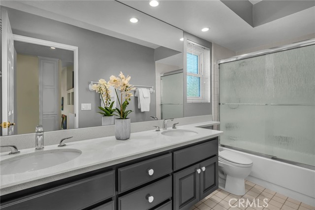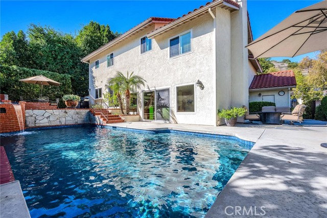 Truly spectacular West Hills pool home in the much sought after Castle Peak Estates and the Las Virgenes School District. Beautifully remodeled, this 4 bedroom, 3 bath sunlit home is the largest and most popular Castle Peak floor plan with almost 2900 sq ft of open living space. Enter this beautiful home through the custom glass doors and step into the large foyer. You will be greeted with soaring ceilings, picture windows, custom fireplace that looks like a piece of artwork, travertine floors, recessed lighting and dual pane windows. The heart of the home is a spectacular grand kitchen featuring a 9ft center island kitchen with prep sink, and separate dining space perfect for entertaining, granite counters, stainless appliances including a built in Dacor fridge, double oven, warming drawer, 5 burner-gas cooktop and pot filler. The kitchen seamlessly flows into the enormous family room with custom maple cabinetry, a second fireplace and powder room. Outdoors, enjoy resort-style living with pool, spa and 4 separate lounging and dining areas all surrounded by lush landscaping. Upstairs you will find the spacious primary retreat with custom built-in cabinets, large walk-in closet and primary bath with soaking tub. The three additional bedrooms and bathroom are all spacious in size. Additional highlights include a 3-car garage, light filled interiors, and premium finishes throughout with tons of storage. This home offers the ideal blend of modern comfort and entertainer's flair in an enviable school district.