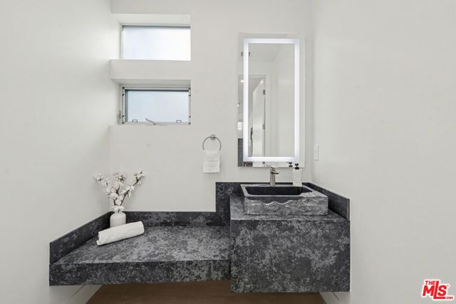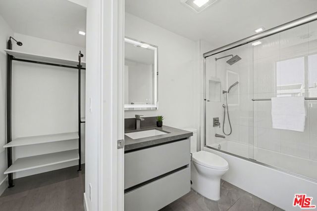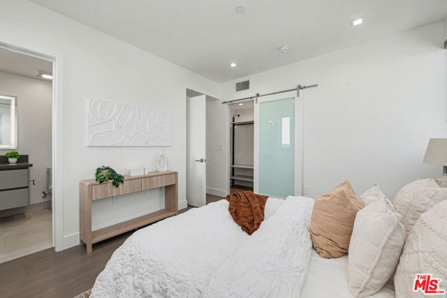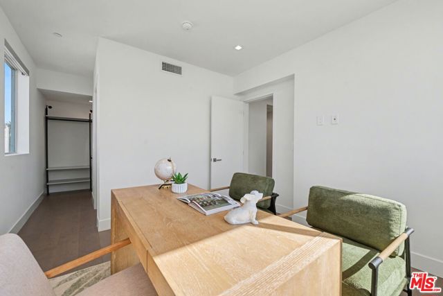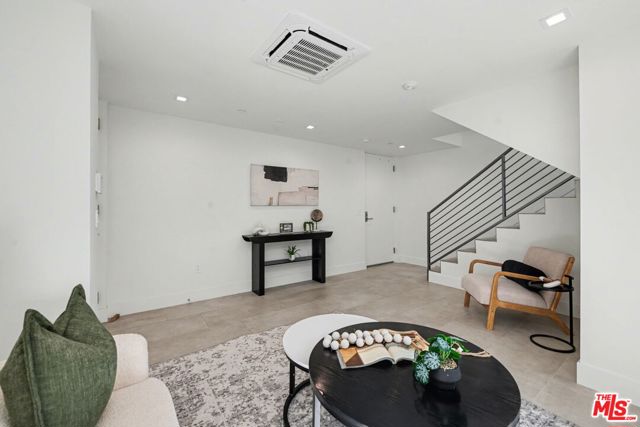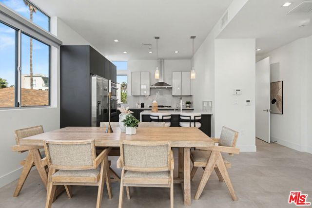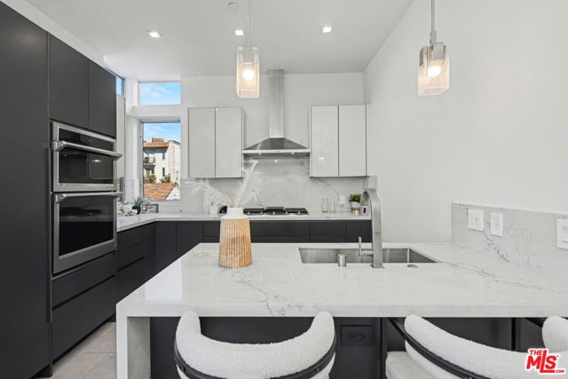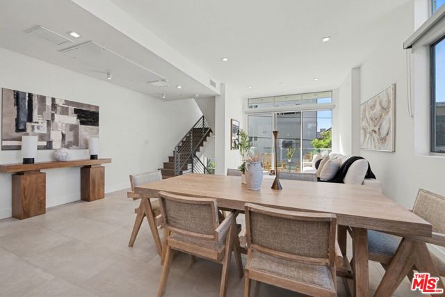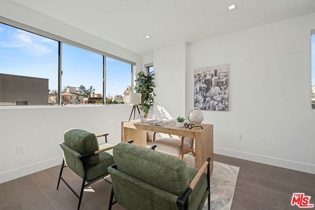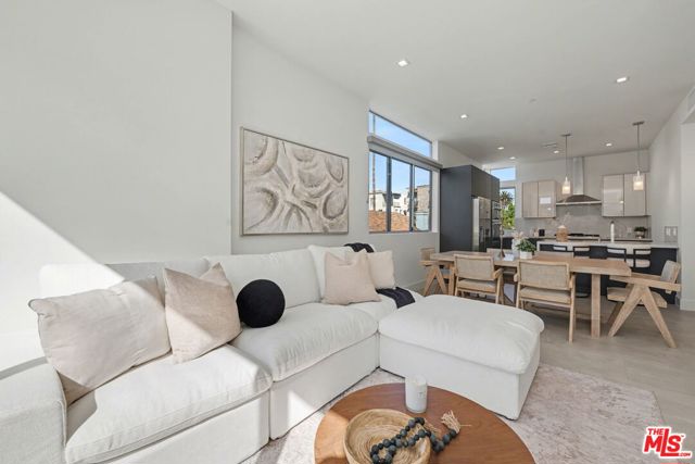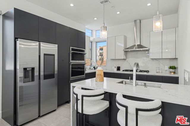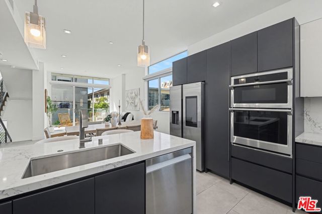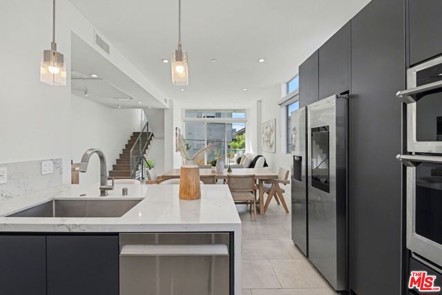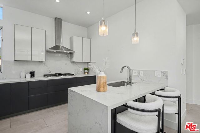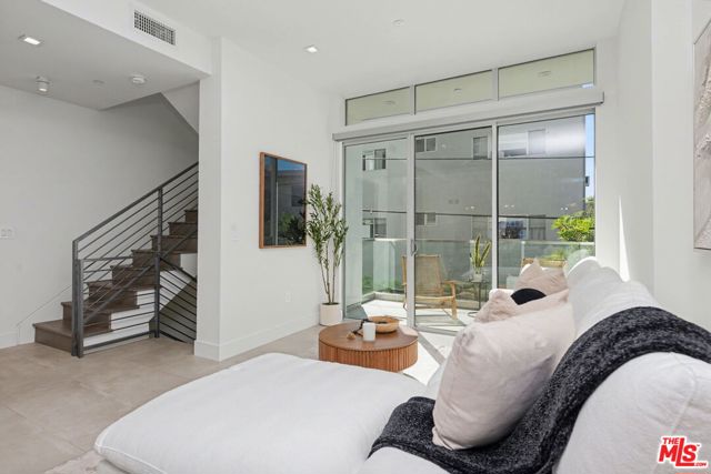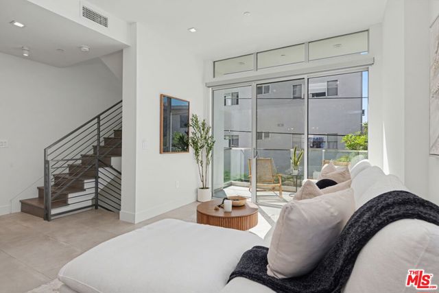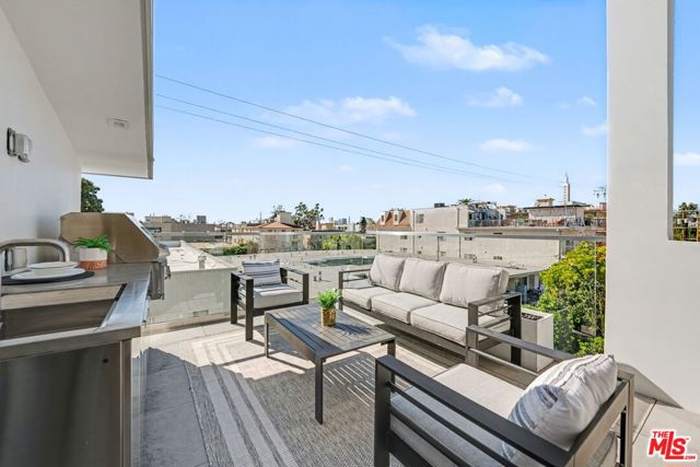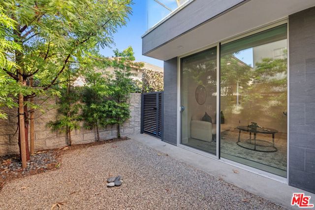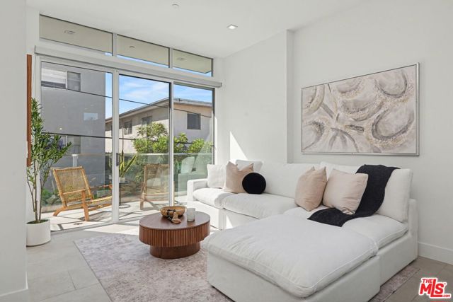 Experience elevated modern living in this newly constructed 2022 Contemporary 3 Bed/3.5 Bath + Bonus Room residence, ideally situated in an exclusive four-home single-lot subdivision. Designed with modern style and functionality, this property offers a sophisticated lifestyle in one of the Westside's most desirable locations. Upon entry, you're welcomed into a versatile bonus room (perfect for a home office, gym, or guest retreat), featuring sleek tile flooring and sliding doors that open to a private, gated patio with built-in planters. Contemporary tiled flooring flows throughout the first and second levels, complemented by clean-design steel stair-railings and abundant natural light. The main living area showcases an open-concept offers seamless indoor-outdoor living with a sliding glass door leading to a sleek glass-enclosed balcony off the living and dining areas, stunning chef's kitchen with a dramatic quartz backsplash, contemporary cabinetry, breakfast bar seating, and stainless-steel appliances, including a 5-burner gas range with griddle, microwave, oven, and hood. LED recessed lighting, dual-pane windows, and designer window shades enhance the home's refined finishes. A stylish powder room with custom sink and backlit mirror, along with a thoughtfully designed entry closet with built-in shelving. Two spacious bedrooms on the 3rd level feature wide-plank light oak hardwood floors, custom closets, and beautifully finished ensuite bathrooms with a floating vanity and tiled shower, the other with a luxurious rain showerhead. A dedicated laundry area with storage and a linen closet in hallway. The top-level primary suite is a private sanctuary boasting high ceilings, breathtaking Century City views, and treetop vistas. Enjoy a walk-in closet, built-in cabinetry with beverage refrigerator, and direct access to an expansive tiled rooftop balcony with sunset views. The rooftop retreat is designed for entertaining with a full outdoor kitchen, including barbecue and sink. The spa-inspired primary bath features a floating vanity, backlit mirror, and a curb-less tiled shower. Additional highlights include all bedrooms with ensuite baths and custom closets, multi-zone AC and heat, wired alarm system, diirect-access 2-car garage with storage and auto glass garage door. Low HOA dues of $29.42/month. Located moments from Westfield Century City, UCLA and Beverly Hills. Westwood Charter Elementary School. Move-in ready Contemporary California living!