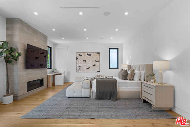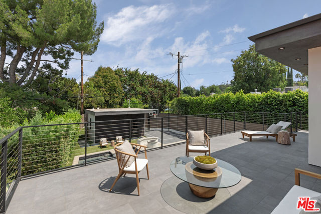 Ideally situated just off Ventura Boulevard, this striking modern residence blends transitional architecture with a flawless fusion of smooth stucco, rich exotic wood, and expansive glass walls all privately nestled behind lush hedges in a tranquil South of the Boulevard enclave. Step into a dramatic entryway with soaring ceilings, setting the tone for the thoughtfully curated interiors where open-concept living flows seamlessly into the outdoors. Beyond the foyer, a sophisticated formal living room with custom built-ins leads to a state-of-the-art home theater perfect for movie nights or game day gatherings. On the main level, a private guest or maid's suite with an en-suite bath adds flexibility, alongside a stylish powder room for visitors. The elegant formal dining room connects effortlessly to a warm and inviting family room, complete with designer built-ins, a 100-bottle wine bar, a contemporary wood-clad fireplace, and expansive glass pocket doors that disappear to reveal the breathtaking backyard oasis. The chef's kitchen is a showstopper, outfitted with a waterfall island, sleek lacquer cabinetry, premium built-in Miele appliances, a sunny breakfast nook overlooking the grounds, and a walk-in pantry. A butler's pantry provides convenient access to the dining room ideal for entertaining with ease. Upstairs, a versatile teen lounge or executive office opens to an extraordinary wraparound terrace with panoramic views of the Santa Susana Mountains. Four luxurious bedroom suites await, including a spectacular primary retreat featuring a fireplace, built-in bar and fridge, private lounge, oversized walk-in closet with island, and a spa inspired bathroom with dual vanities, lighted mirror, soaking tub, and oversized shower. A private balcony overlooks the backyard the perfect spot to greet the morning or unwind at sunset. Designed for entertaining and everyday luxury, the backyard features a covered outdoor living area, sparkling pool and spa, glass-encased fire pit, and a sleek outdoor kitchen with built-in BBQ. A custom sports court invites friendly competition, while a newly updated ADU with a private entrance and en-suite bath provides ideal accommodations for guests, extended family, or use as an office, studio or even a gym. Smart home features include integrated sound, multi-zone Nest climate control, security cameras, electric blinds and curtains throughout the entire house and full home automation. Additional highlights include a large motor court with ample parking and a low-maintenance turf area perfect for soccer, mini golf, or outdoor relaxation. Don't miss the opportunity to experience the exceptional lifestyle offered at 4854 Alonzo Avenue where modern design, comfort, and convenience converge in one unforgettable home.