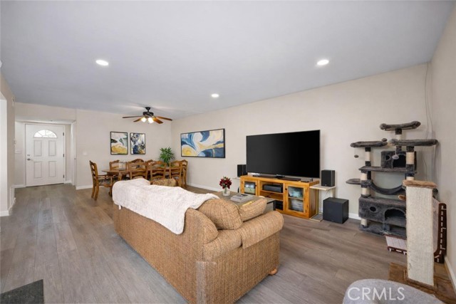Prized end-unit in Northridge with only one shared wall and the largest patio in the complex, this beautifully updated home offers privacy, space, and style. The interior features luxury vinyl flooring, fresh paint, new base molding, and recessed lighting in the living room and kitchen. The remodeled kitchen showcases new soft-close cabinetry and white quartz countertops, and all three bathrooms have been tastefully renovated with cohesive finishes. Bedrooms include new carpet, a newer A/C unit provides year-round comfort, and convenient in-unit laundry adds everyday ease. All appliances are included — refrigerator, stove, microwave, dishwasher, washer, and dryer — making this home truly move-in ready. With two parking spaces and close proximity to excellent schools, dining, and amenities, this is a standout opportunity in Northridge.