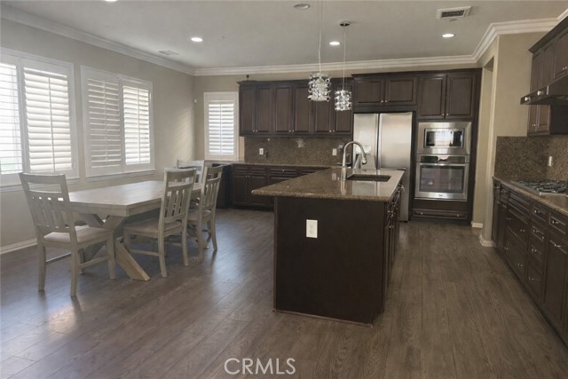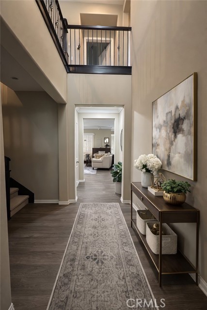 This beautiful two-story residence, located in the highly desirable College Park community of Chino, offers a perfect blend of luxury and practical design. Upon entering, you are greeted by a high-ceiling entryway and an upgraded stairwell that set an immediate tone of elegance. The thoughtful floor plan features four spacious bedrooms and three bathrooms, including a coveted bedroom and full bathroom on the first floor—an ideal setup for guests, a home office, or multi-generational living. The heart of the home is an open-concept gourmet kitchen, which boasts granite countertops, a full custom backsplash, and a walk-in pantry. This bright culinary space flows seamlessly into the dining and living areas, creating an inviting environment for entertaining. The entire home is further enhanced by custom shutters and a whole-house water filtration and softener system, ensuring comfort and quality in every corner. Upstairs, the primary suite serves as a private retreat, featuring an upgraded bathroom with dual sinks, a soaking tub, a separate shower, and a generous walk-in closet. The second floor also includes a dedicated laundry room equipped with an additional storage room to keep the home organized. Outside, the living space extends to a built-out patio, perfect for relaxing or hosting outdoor gatherings. Living in College Park means enjoying a resort-style lifestyle with access to two swimming pools, a spa, and a 24-hour fitness center. The community is rich with amenities, including parks, BBQ areas, and multiple recreational spaces for parties or games like mahjong and poker. Perfectly situated near top-rated schools, shopping, and dining, the home also offers easy access to the 71, 91, and 60 freeways for an effortless commute.