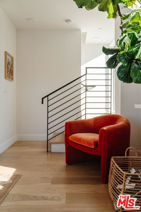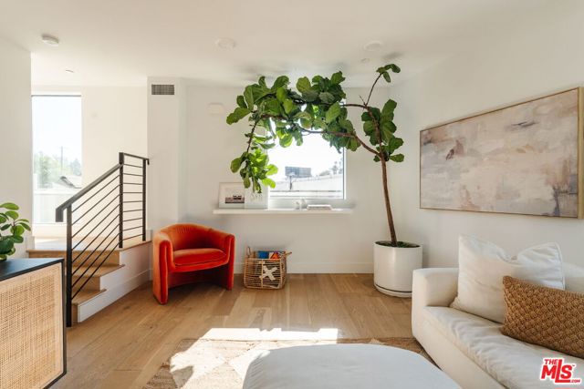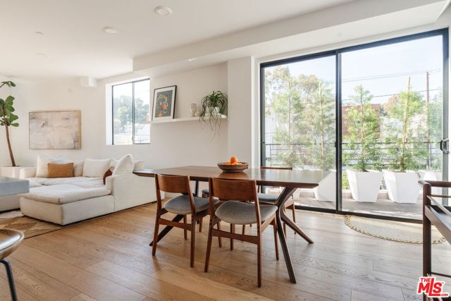 Built in 2019, where Echo Park and Silver Lake converge, this contemporary 2-bedroom, 2.5-bathroom small lot single-family home spans 1,560 square feet across three levels and is topped with a private rooftop deck showcasing city views. With clean architectural lines, abundant natural light, and leased solar for added efficiency, the residence offers easy living in one of LA's most dynamic neighborhoods. A private and gated front entry leads to the ground-level foyer, complete with a powder room and direct access to the attached two-car garage, outfitted with MyQ smart garage opener and offering additional storage. Upstairs, the main living level is bright and airy, highlighted by expansive windows and warm hardwood flooring throughout. The living room transitions seamlessly into the dining area, which opens to a wraparound balcony framed by lush greenery, creating an easy indoor-outdoor flow. The kitchen is thoughtfully designed with stainless steel appliances, quartz countertops, and ample cabinetry, balancing style and functionality. A conveniently located laundry closet sits just off the kitchen on this level. Above the living spaces, on the third level, are two private bedroom suites. The primary suite includes ample closet space and an ensuite bathroom with dual sinks, a glass-enclosed shower, a separate soaking tub, and contemporary finishes. The second bedroom is well-sized and versatile, perfect for guests, a home office, or a creative space with its own hallway bath. At the top level, a private rooftop deck captures sweeping hillside views and offers a hedged open-air setting ideal for relaxing or entertaining beneath the California sky, complete with a dedicated BBQ hookup. Thoughtful upgrades, including a tankless water heater and Nest thermostat, enhance the home's overall comfort and efficiency. Located just moments from neighborhood favorites like Botanica, Canyon Coffee, Lady Byrd Cafe, and L & E Oyster Bar, and close to the trails of Elysian Park and the shops and restaurants along Sunset, this Echo Park home delivers modern comfort with unbeatable access to the best of the Eastside.