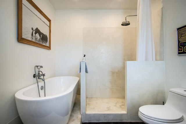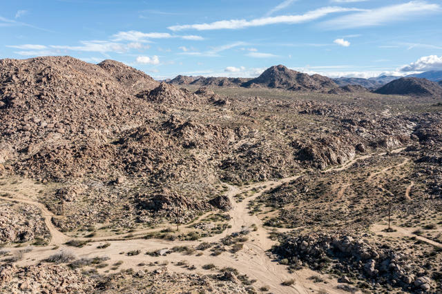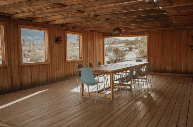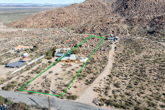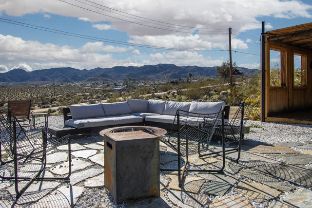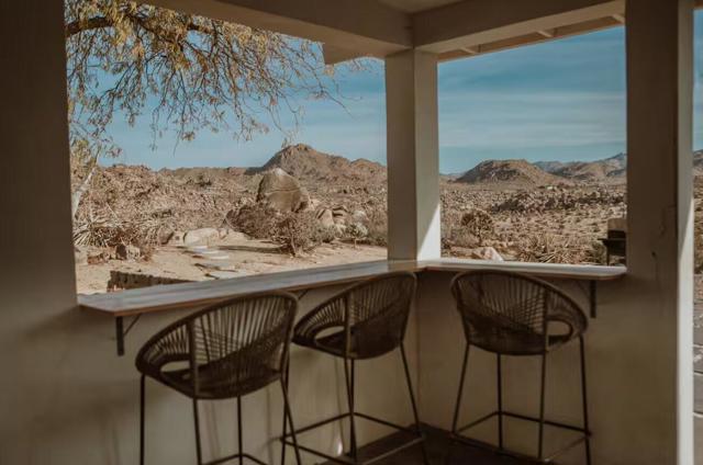 Immaculate designer-remodeled mid-century modern home perched on 2.19 acres with boulders & panoramic views. Featured in Conde Nast Traveler & Dwell Magazine. Overlooking Coyote Hole Canyon between JT Village & Monument Manor. Prime luxury location just 5 miles to the National Park main gate & 1 mile to the main strip in the Village.1956 authentic flat-roof home with 3 bedrooms & 2 baths, just over 1,900 square feet. Most furniture & furnishings may stay with the home. Professionally managed vacation rental with potential for turnkey handover to existing property management -- buyer to verify. State-of-the-art Tesla Powerwall battery & solar power system generates excess power back to the grid. The long driveway leads to ample parking for vehicles & RVs.Open entryway leads to an enclosed patio with wood & stone elements -- pergola & bamboo roof, lattice walls, flagstone & pebble flooring, and front lounge area. Living room with vistas of boulder-studded hills brings the outside in, with glass sliders to the rear patio. Separate den with cabinetry & countertop could become a flex space or art studio. Recessed lighting, coated concrete floors, newer AC/heat mini-splits, beamed & angled ceilings.Kitchen with long breakfast bar, stainless steel island hood vent, dual-basin sink, sleek cabinetry, & stainless steel appliances. Formal dining area with chandelier & gallery walls. Large primary bedroom with study area & glass sliders to the patio. Second bedroom with bench bar table & glass sliders offering expansive views. Bathrooms with custom white concrete vanities & open showers with raindrop shower heads.The enclosed south patio features al fresco dining, ideal for entertaining dinner party guests. The partially enclosed east patio feels like a sunroom with forever vistas of rolling hills & mountains. Backyard with lounge sofas & fire pit to enjoy evenings under the stars. Private spa set among the boulders with bench deck, cowboy tubs, & 4 hammocks under the shade tree.The elevated acres overlook Coyote Hole Canyon with wonderful natural trails. The large open spaces of the lot offer room for an addition and/or ADU potential. This location is ideal for those who want a natural landscape with a central location. Joshua Tree National Park sees about 3 million tourists annually, with more full-time artists, musicians, & creative individuals calling JT home.Don't wait on this one -- call now!