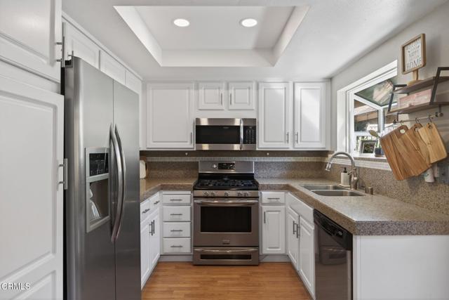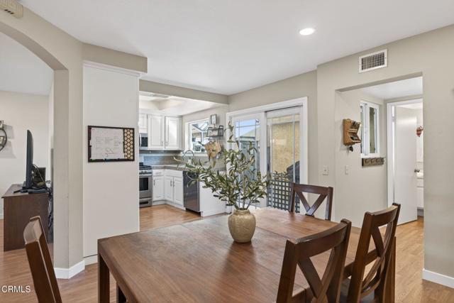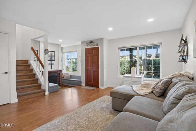 Welcome Home to the highly desirable Riverview neighborhood in East Ventura!Step inside to a fantastic floor plan featuring a spacious living room with a cozy fireplace in a sunken seating area, and large windows that fill the space with natural light. The open kitchen and dining area flow seamlessly to a private patio, perfect for entertaining or enjoying indoor-outdoor living. The first level also offers a generous powder room and convenient interior laundry.Upstairs, you'll find all three bedrooms and two full bathrooms, including an oversized primary suite with its own ensuite bath.From the patio, enjoy direct access to your two car garage for added convenience.Upgrades include engineered laminate hardwood flooring, a beautifully updated kitchen with stainless steel appliances and abundant white cabinetry, newer light fixtures, smooth ceilings with recessed lighting throughout, and ceilings fans in the bedrooms.The HOA amenities feature 3 pools, tennis & pickle ball courts, greenbelts, and spas. Plus water and sewer are included in the monthly dues, adding even more value and convenience.A wonderful opportunity to own in one of the area's most sought after communities!