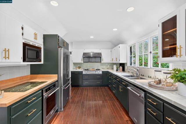 First time on market in 50 years! Charming updated Tudor home on coveted Piedmont side Montclair. Enjoy an easy stroll over the walking bridge at the end of the cul-de-sac to shopping, dining, and Montclair Farmers Market, as well as close proximity to schools, freeways and public transit. Spacious 2745 sf home offers a gracious living room with fireplace, formal dining room, and inviting renovated kitchen with stainless steel appliances and delightful sunny eating area. The office on main level with beautiful built-in shelving and desk includes a closet and could also serve as the 4th bedroom. French doors from the downstairs family room open to an unusually private and serene back yard, with deck and expansive level lawn, surrounded by gardens and mature redwoods. Walk-in basement provides additional storage. New sewer lateral, new electrical, and sidewalk compliant. Truly a family home to cherish!