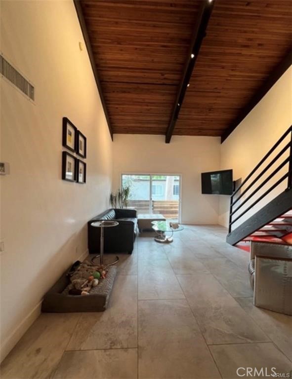 Welcome to your private sanctuary in the heart of Encino. This spacious, beautifully upgraded condo greets you with sleek large format tile flooring and impressive vaulted ceilings that create an open, airy atmosphere. The light filled interior is bright and inviting, showcasing designer finishes throughout. The main level features a fully renovated bathroom with elegant gray porcelain wall tile and mosaic flooring. The modern kitchen is appointed with glossy contemporary cabinetry, quartz countertops, and a stylish dining nook enhanced by a new light fixture. The living room is highlighted by soaring wood accented ceilings that add warmth, character, and architectural interest. Upstairs, the loft style primary suite offers versatility and privacy, complete with a walk-in closet and a fully upgraded primary bathroom. The well maintained community offers resort-style amenities including a pool, spa, sauna, and fitness center. Ideally located near major freeways, shopping, dining, and everything Encino has to offer, this exceptional home combines comfort, style, and convenience.