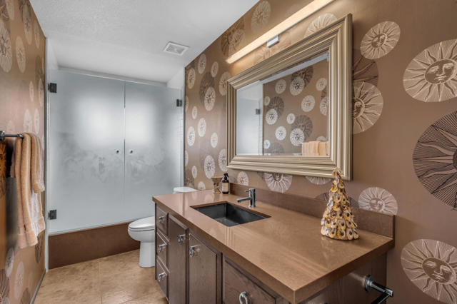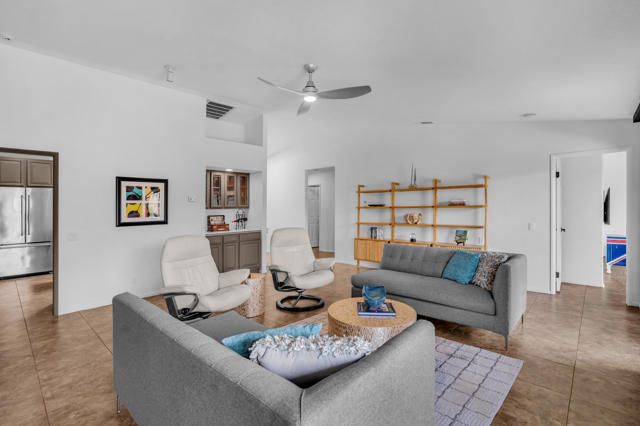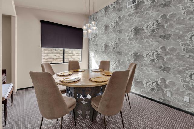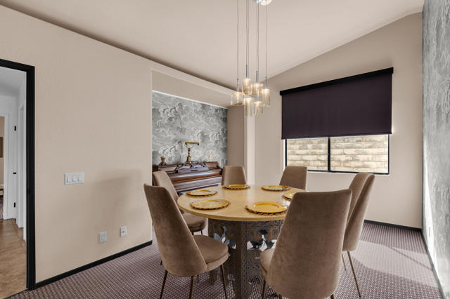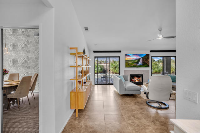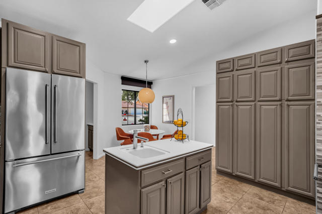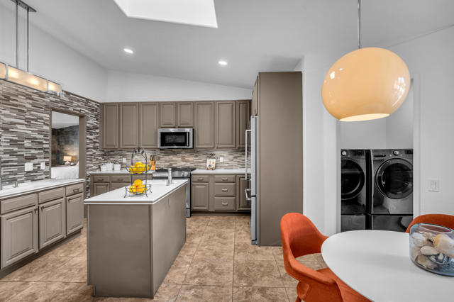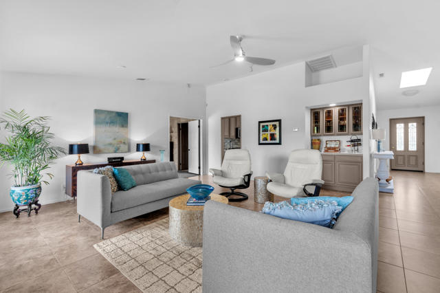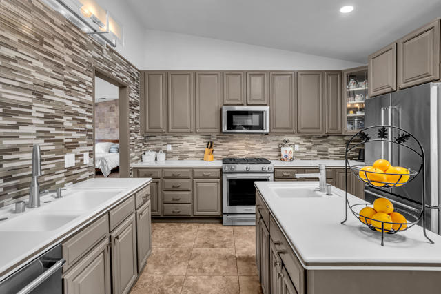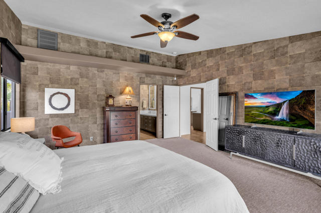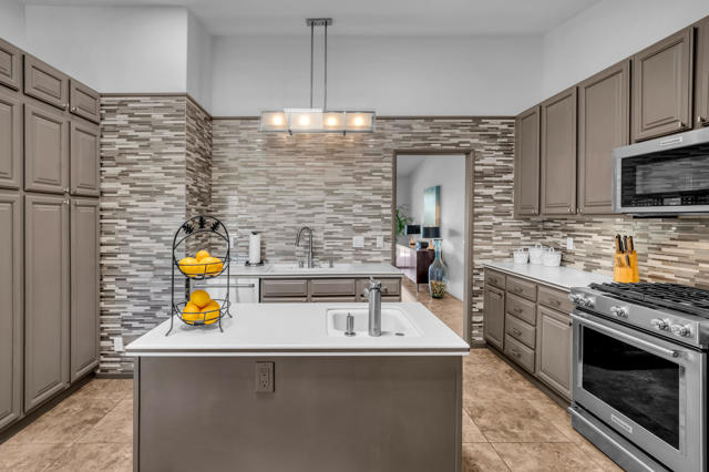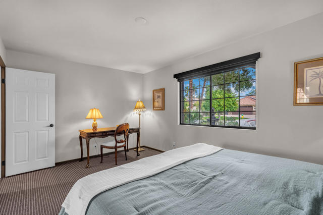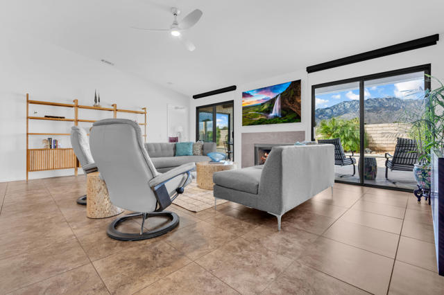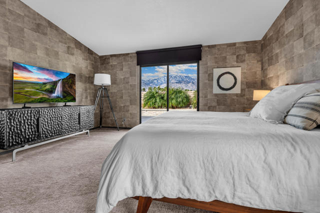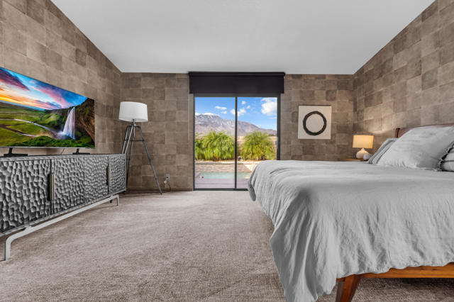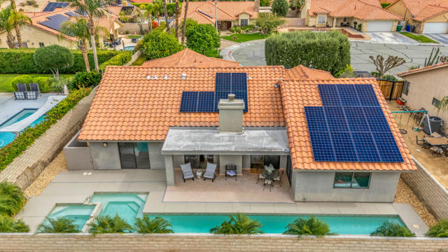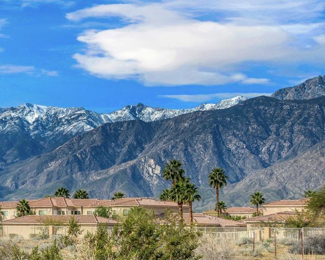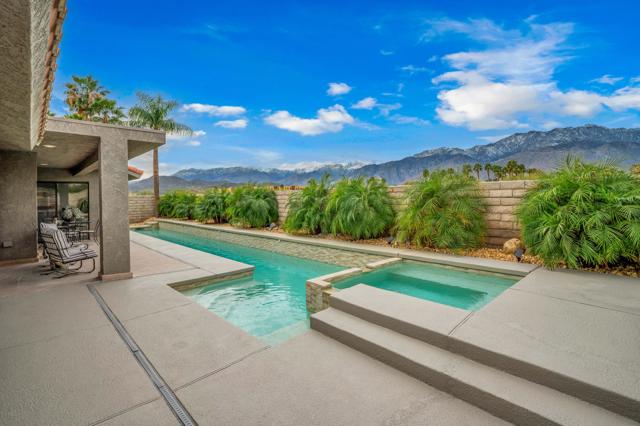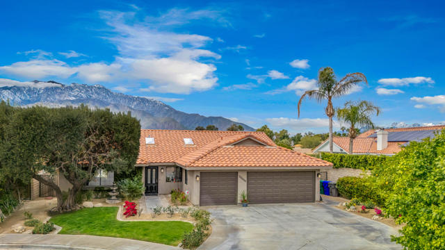 Stunning residence in the desirable Landau Homes neighborhood, perfectly located between Palm Springs and Rancho Mirage. Freshly painted and meticulously upgraded, this exceptional home has SOLAR and is on Fee Land (you own) with no HOA! High ceilings and dramatic walls of glass flood the home with natural light and open seamlessly to the backyard with magnificent MOUNTAIN VIEWS. Designed for indoor-outdoor living, the resort style setting features a sleek lap pool, raised spa with waterfall and covered patio perfect for relaxing or entertaining. Fabulous split floorplan offers privacy and is ideal for gatherings with the great room featuring a wet bar and fireplace... and chef's kitchen with center island, Kitchen Aid appliances, designer backsplash and breakfast nook. The spacious primary retreat boasts a walk-in shower, soaking tub and oversize walk-in closet. Ensuite guest bedroom opens to the pool and two additional guest bedrooms offer flexible living options with one currently being used for formal dining. Additional highlights include a laundry room with utility sink and a 2-car + golf cart garage. Beautifully landscaped with Ruby Red Grapefruit and Meyer Lemon trees; situated on a quiet cul de sac, the home is close to shopping, dining, schools and easy access to the I-10. The golfer will appreciate close proximity Cimmarron Golf Course and Desert Princess Golf and Country Club. Welcome home to the perfect blend of sophistication and comfort to enjoy desert resort living.