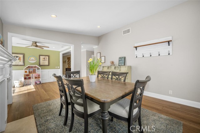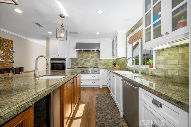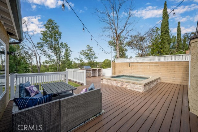 Nestled on a quiet cul-de-sac and backing to a tree-lined ravine, with open space behind. This beautifully expanded single-level home offers a setting buyers rarely find. The living and dining areas unfold together in one airy, light-filled setting and flow into a spacious kitchen and family room. Vaulted white-beamed ceilings and a statement brick fireplace anchor the family room, while the custom kitchen features a Wolf 6-burner range and Wolf double ovens, granite countertops, and an oversized island. Offering approximately 1,786 sq ft on a 6,890 sq ft lot, this 3-bedroom, 2-bath home features laminate wood flooring throughout, with tile in the primary bath and laundry. The expanded primary suite includes a freestanding soaking tub, dual vanities, and walk-in shower. The backyard is designed for entertaining with Trex decking, built-in barbecue, grassy area, café lighting, and a spa with fire feature, all positioned to enjoy sunset and evening light views. Additional highlights include RV parking (approx 13.5' x 30'), central AC, whole house fan, and epoxy garage with built-ins. Direct access to a wilderness trail at the end of the cul de sac, near parks and Aliso Creek Bikeway. Optional Lake Mission Viejo membership available.