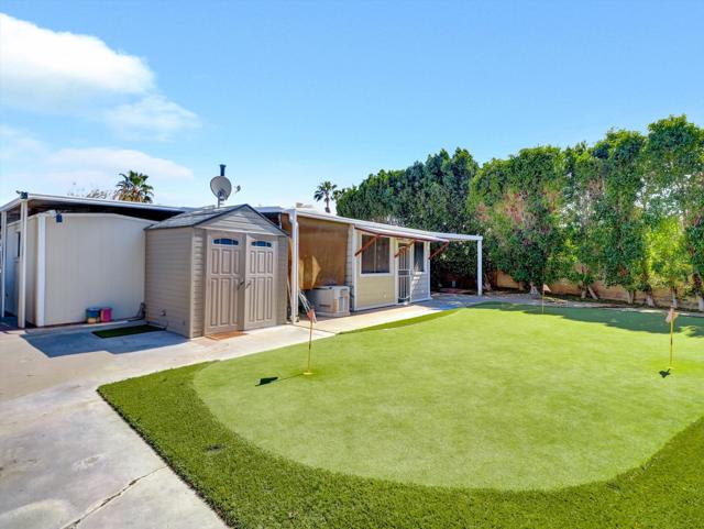 Escape to your own desert oasis on Cabazon Peak Dr, where resort-style living meets everyday comfort. This charming 2-bedroom, 2-bathroom Palm Desert Greens home delivers an irresistible blend of relaxation and practicality that's hard to find at any price point. Step outside and you'll understand why this property stands apart. Mature shade trees create a serene canopy perfect for sipping afternoon beverages, while the ultra-private backyard--wrapped in lush ficus hedging--features its own putting green and a distinctly tropical ambiance. Two spacious patios ensure you'll always have the perfect spot to unwind beneath the California sky. Dog lovers will appreciate the generous, secure yard built for four-legged fun. Inside, thoughtful upgrades elevate everyday living. The master suite boasts a sun room equipped with a small pet door, and is also ideal for a reading nook. It has a spa-worthy walk-in soaker tub equipped with luxurious jets that transform your evening routine into a full-blown relaxation ritual. Even better, this incredible spa feature comes backed by a lifetime warranty, giving you peace of mind for years to come. Speaking of warm water, the on-demand water heater delivers endless hot water precisely when you need it -- no waiting, no wasted energy, and no cold surprises. It's the kind of smart upgrade that makes daily living effortlessly comfortable. A roomy walk-in closet in the guest bedroom offers excellent storage, while the impressive wet bar makes entertaining effortless. For ultimate peace of mind, a whole-home Generac generator keeps everything running when you need it most. This home places you at the heart of the desert lifestyle without sacrificing privacy or tranquility. This community is conveniently located near Bristol Farms, Eisenhower Health, and the renowned El Paseo Shopping District. This is desert living, elevated. Living in this welcoming community means enjoying low homeowners' association dues that surprisingly cover FREE golf, free internet, premium cable TV, and trash pickup, a clubhouse with a restaurant, a lounge, 18-hole executive golf course and pro shop, three community pools, hot tubs and an exercise room. Add a billiard room, card room, indoor shuffle board, tennis courts, pickle ball courts, library, recreation room, and many active clubs to realize all that PDGCC offers for your perfect desert home. With a variety of activities, every day can be as active or relaxed as you desire.