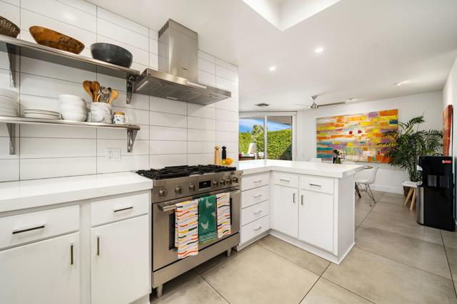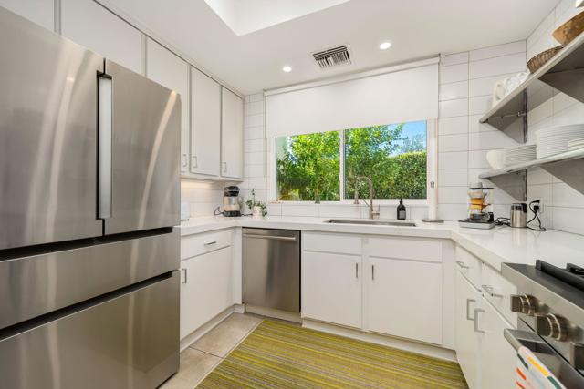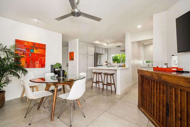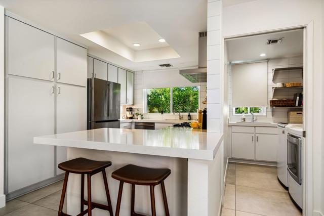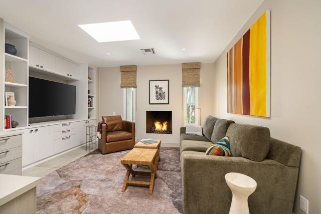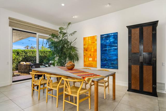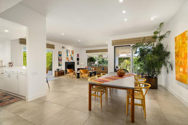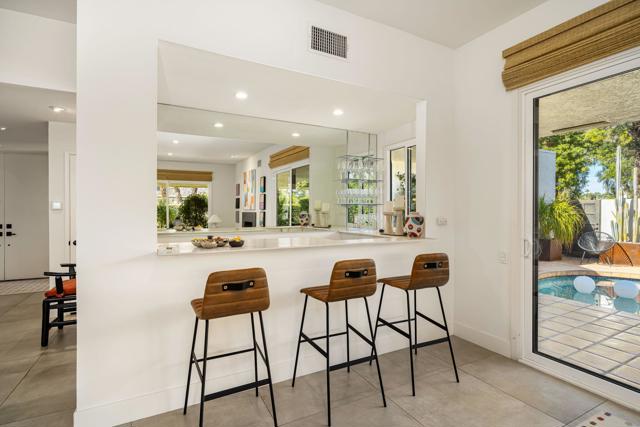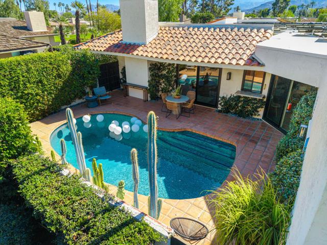 Step inside this gorgeous Springs Country Club home and be transported to a private retreat. Reminiscent of an Italian villa, this residence offers the finest amenities and a contemporary, artsy feel with high ceilings and total privacy. The home features a grand entry and a formal dining space large enough for nearly any size table. The lovely living area includes a beautiful modern fireplace and ample wall space to display your art. This early-built Medinah model is further elevated by large 32x32'' modern gray porcelain tile throughout. The functional kitchen is equipped with stainless steel Bosch appliances, open shelving, and a serene eating area with views of the lush greenery. Designed for entertaining, the secluded kitchen space keeps the prep area tucked away from your guests' view while offering glimpses of the private pool. The primary suite serves as a private resort, featuring a soaker tub, a Toto toilet, and a rare, custom-carved wood double vanity. A vintage door serves as a unique room divider, and the space is surrounded by windows that bathe the room in natural light. The secondary en-suite bedroom also offers a private outdoor space, generous light, and plenty of room for a king-sized bed. Additionally, the third bedroom has been transformed into an office or den with built-in cabinetry and a cozy fireplace. The property is equipped with a leased solar system with only eight years remaining. Residents can enjoy all the club has to offer, including golf on our new $16M fully renovated golf course, pickleball & tennis courts, bocce ball, a gym, and various social events. The home is centrally located near shopping, dining, and entertainment at The River and famous El Paseo.